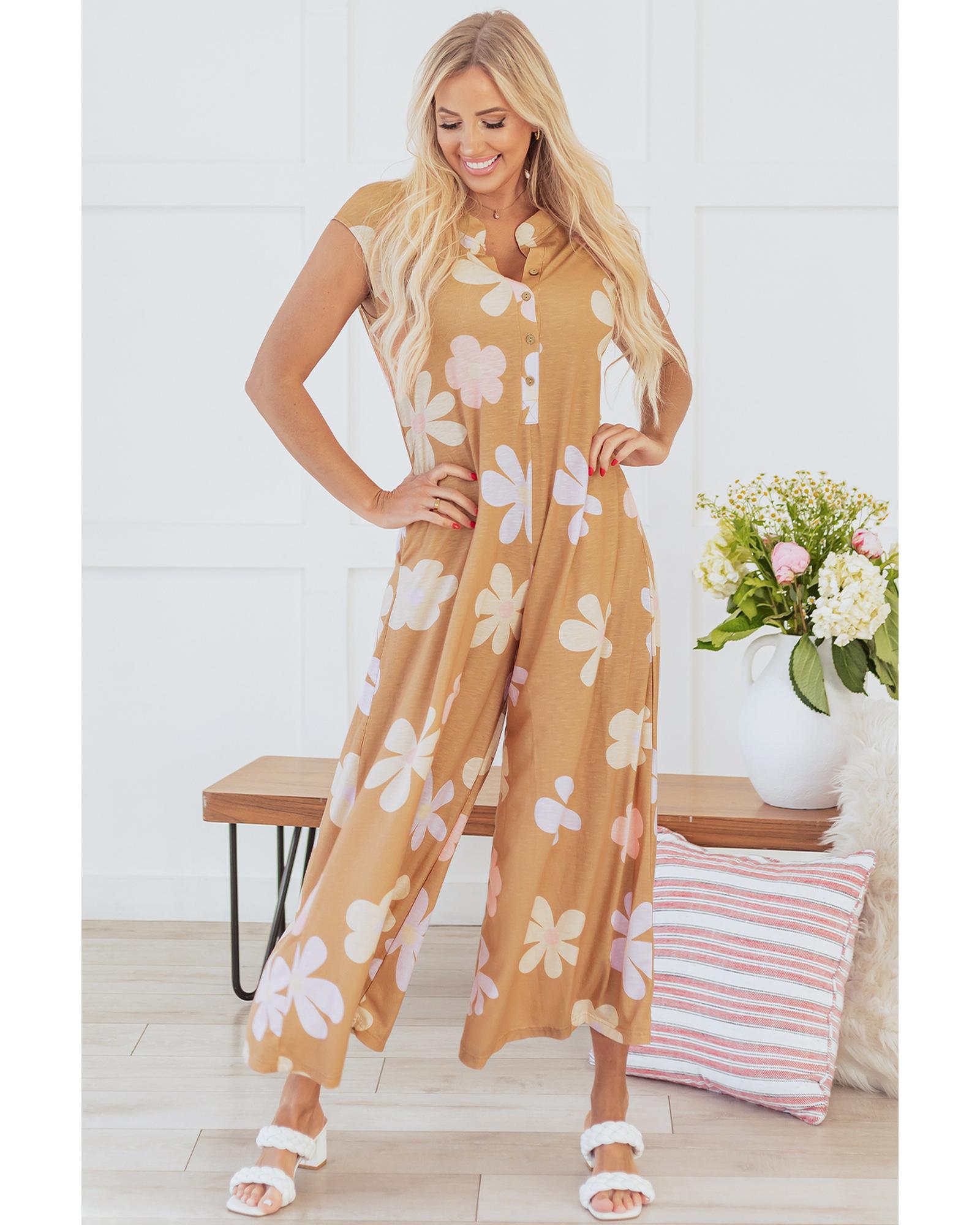 Khaki Floral Print Sleeveless Button up Wide Leg Loose Jumpsuit – L
