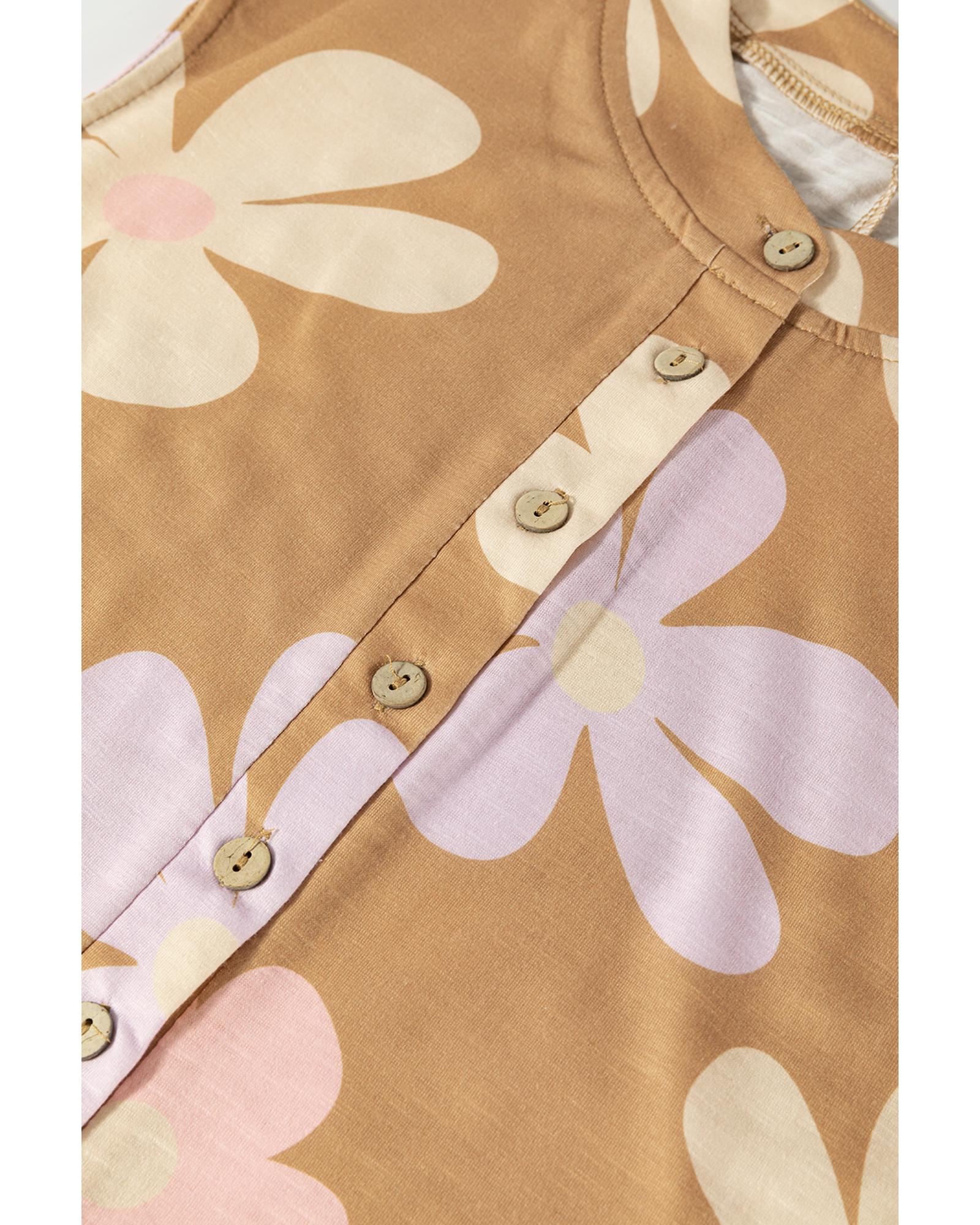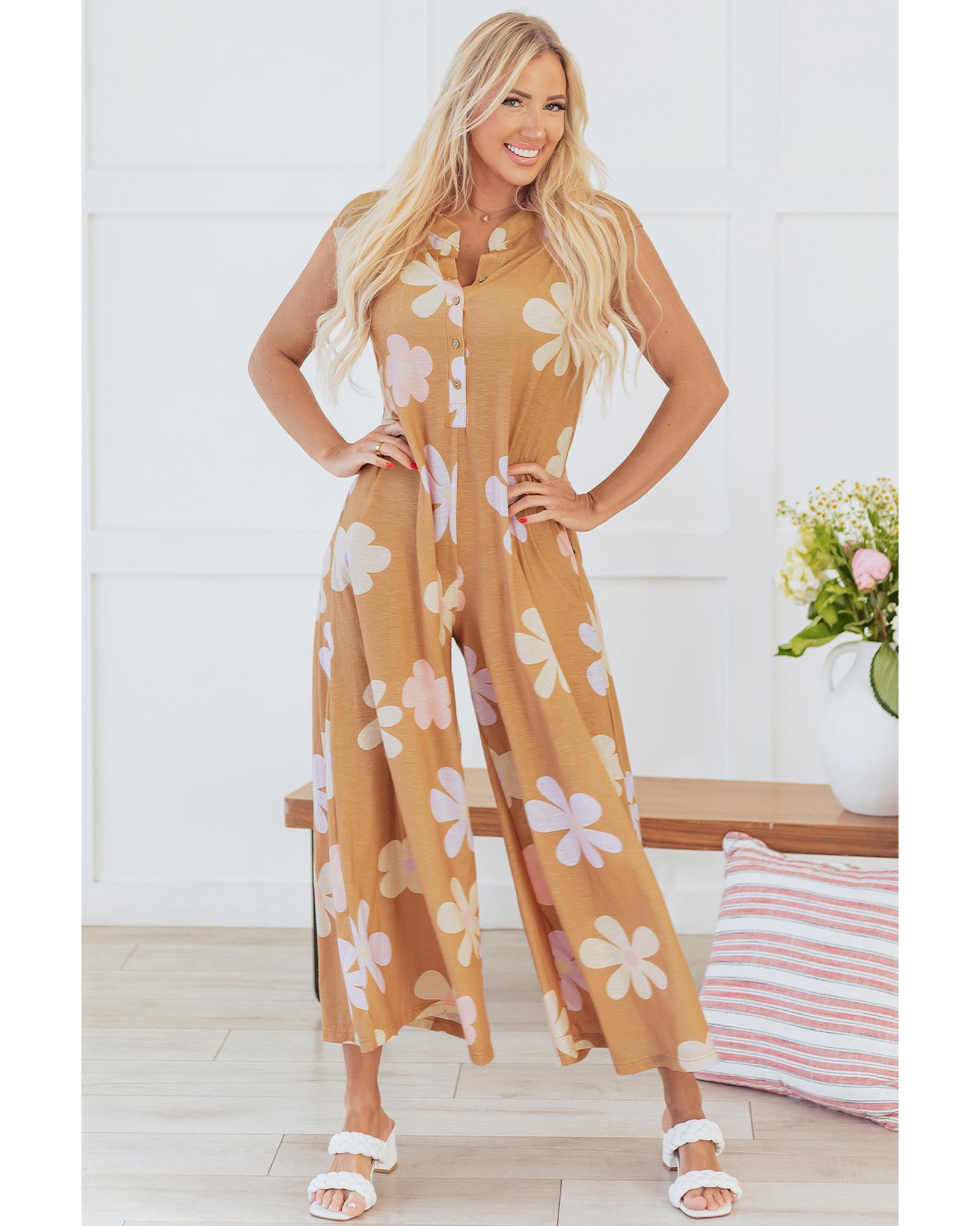 Khaki Floral Print Sleeveless Button up Wide Leg Loose Jumpsuit – S