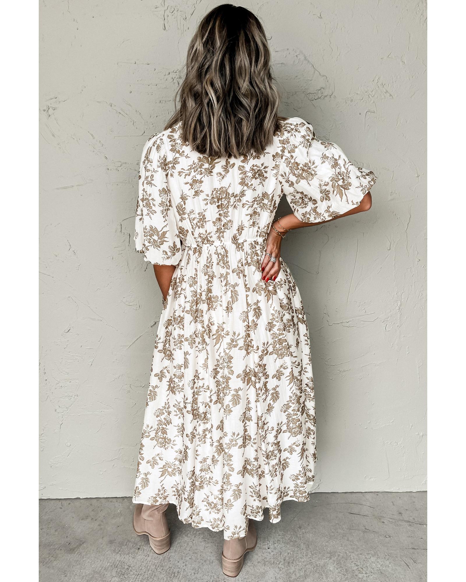 Khaki Floral Puff Sleeve V Neck Buttoned Front Maxi Dress - S