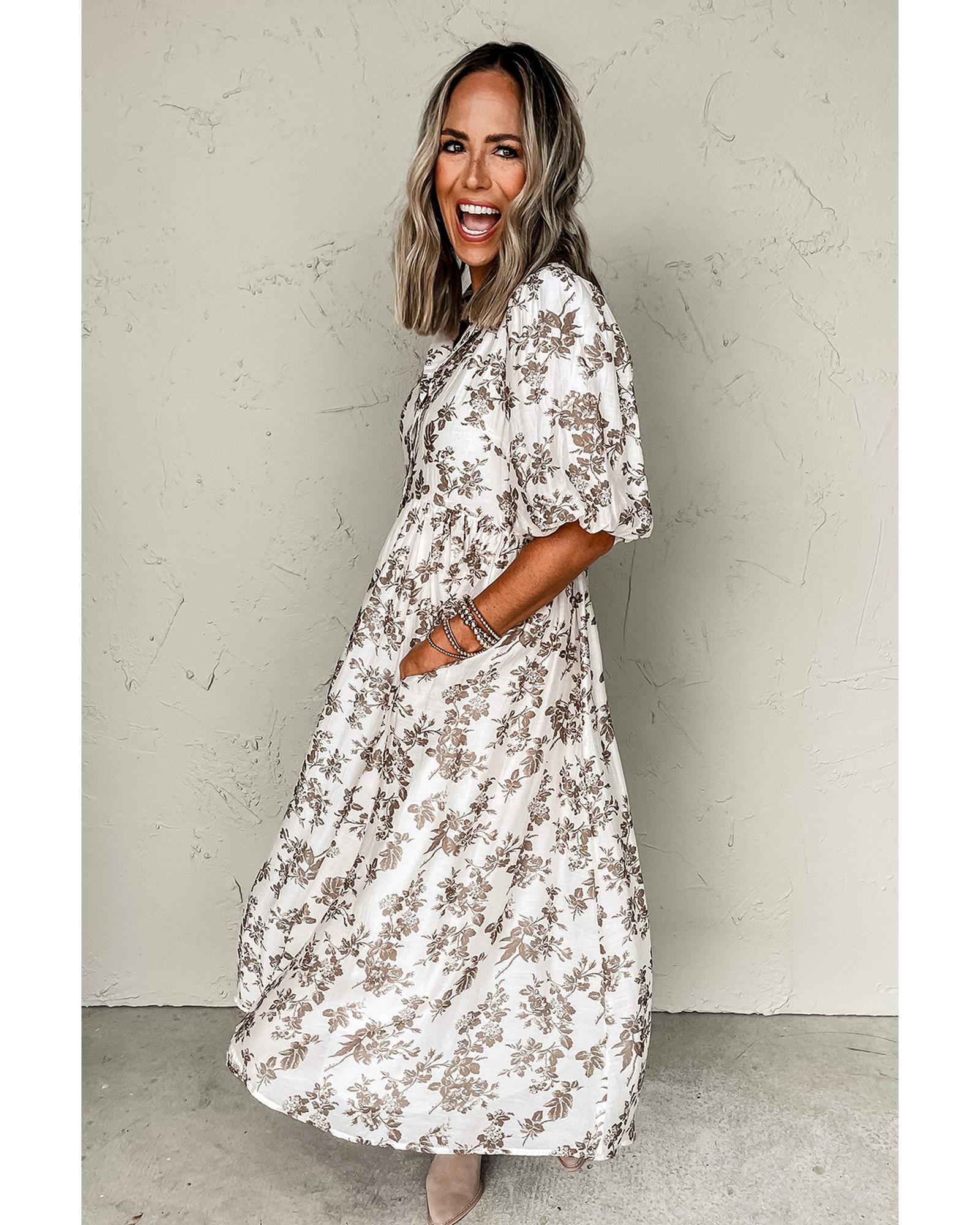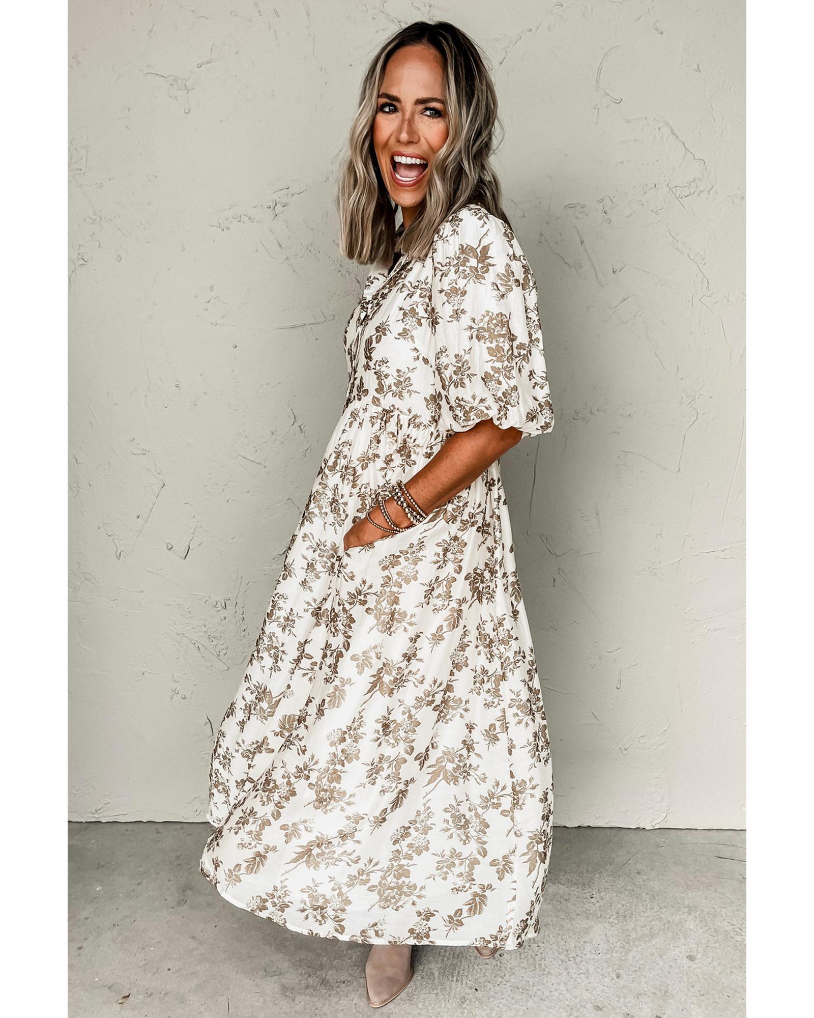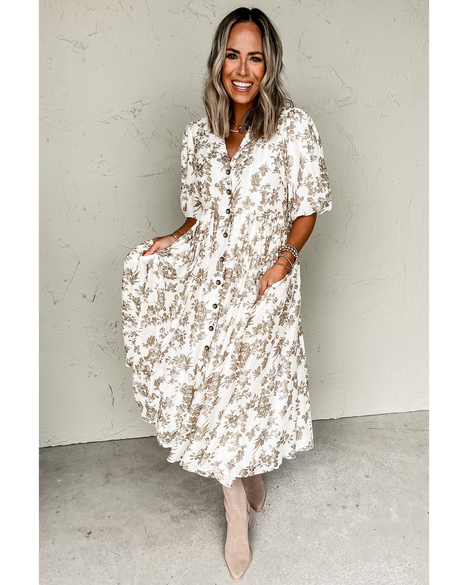 Khaki Floral Puff Sleeve V Neck Buttoned Front Maxi Dress – M