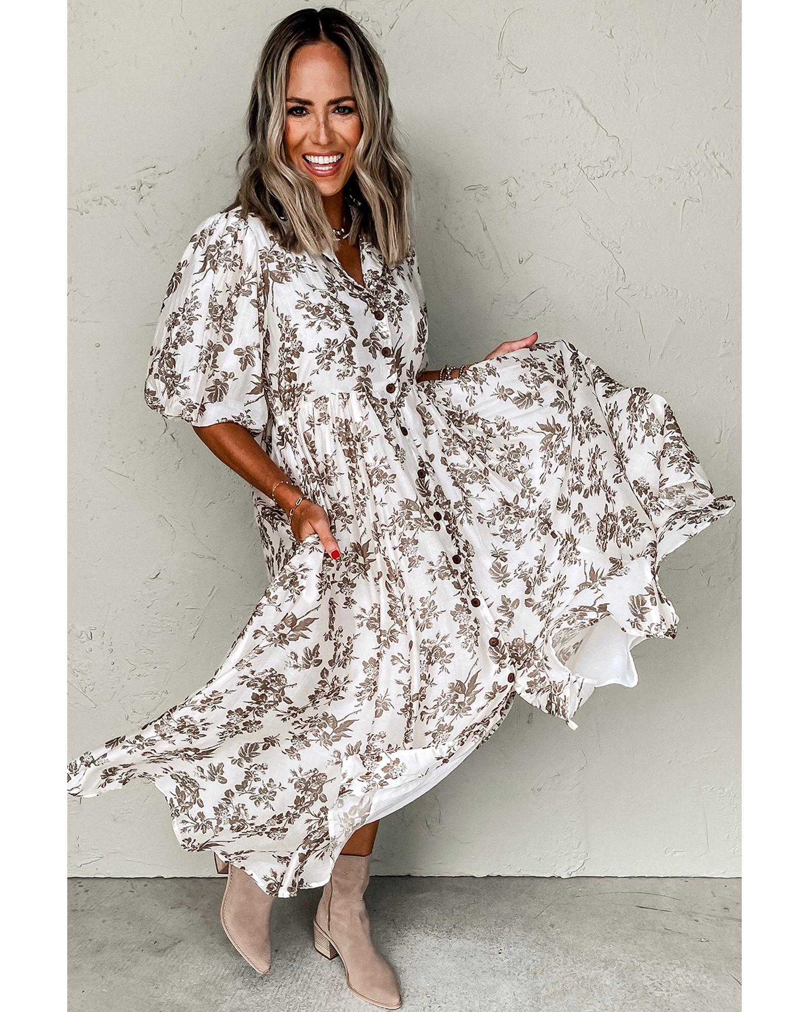 Khaki Floral Puff Sleeve V Neck Buttoned Front Maxi Dress - M Original price was: $89.99.Current price is: $48.99.