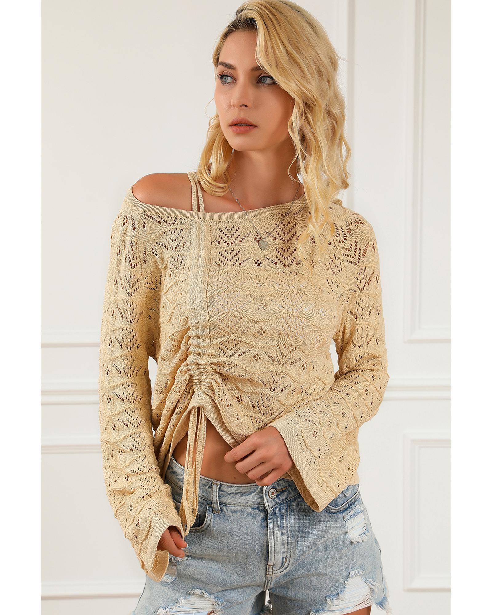 Khaki Hollowed Knit Asymmetric Drawstring Sweater – XL