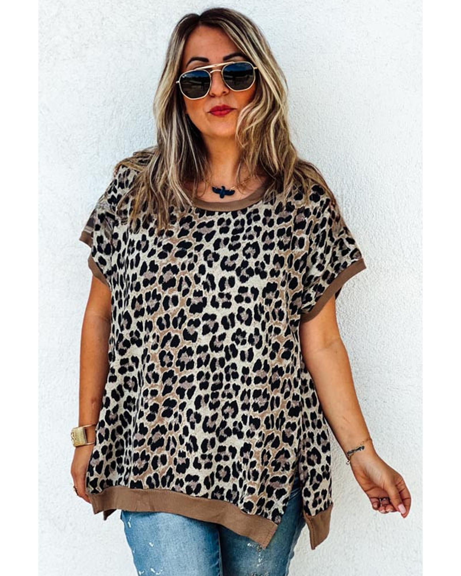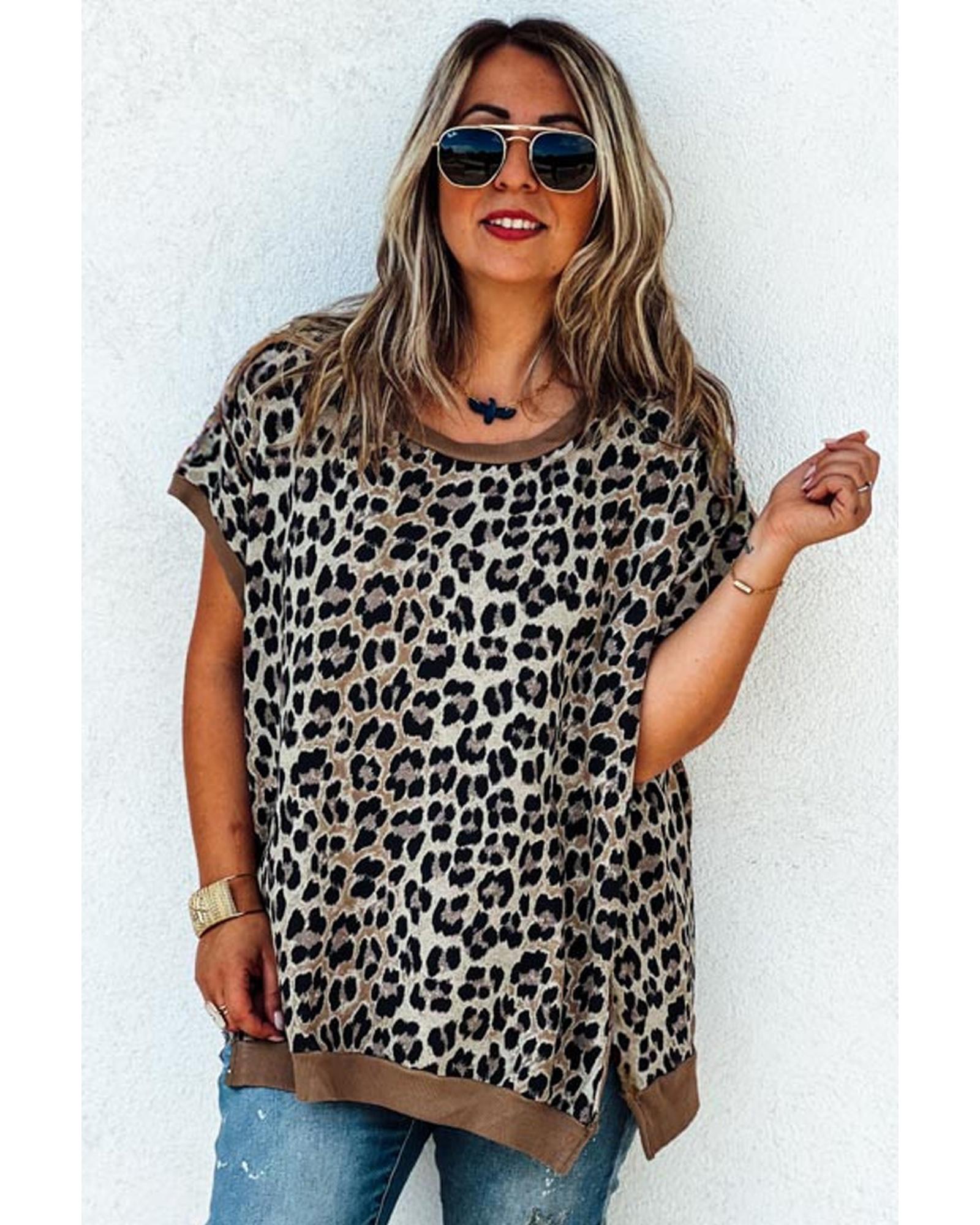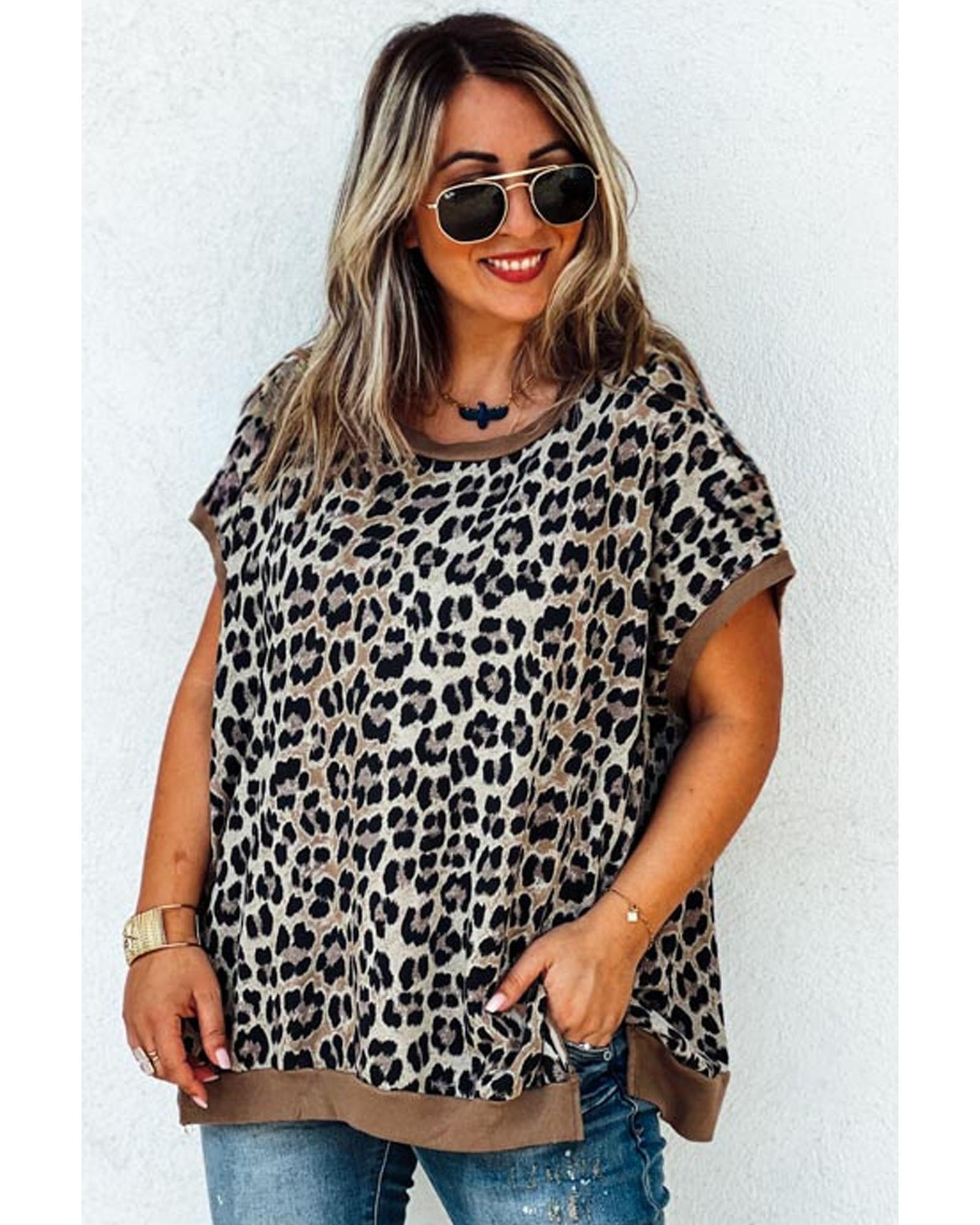 Khaki Leopard Contrast Trim Short Sleeve Loose Plus Size Top – 1X