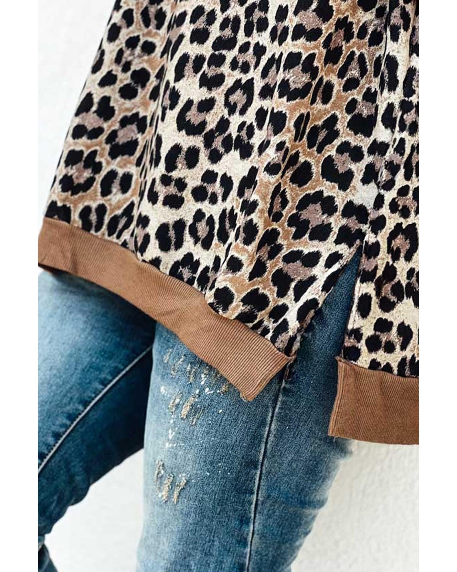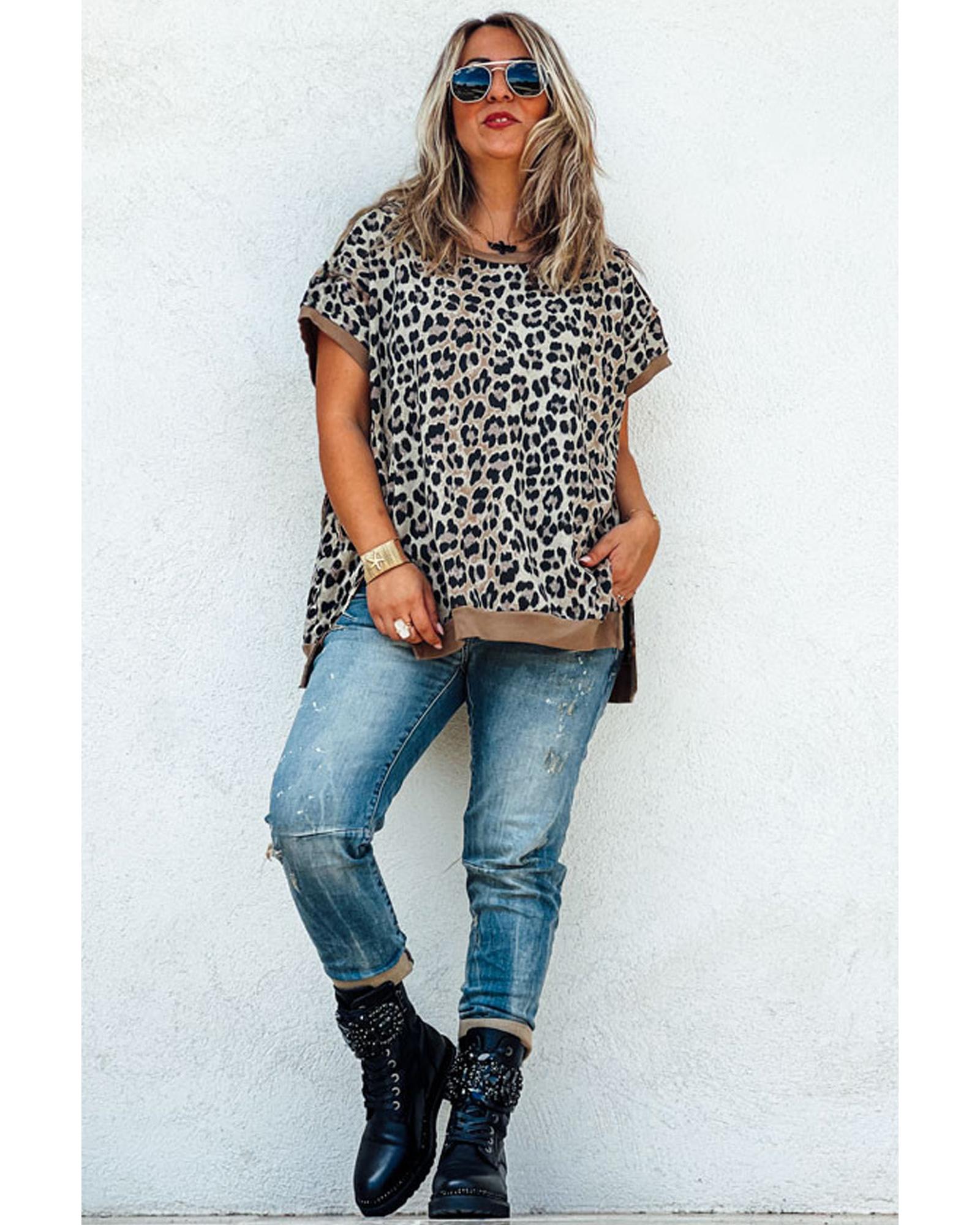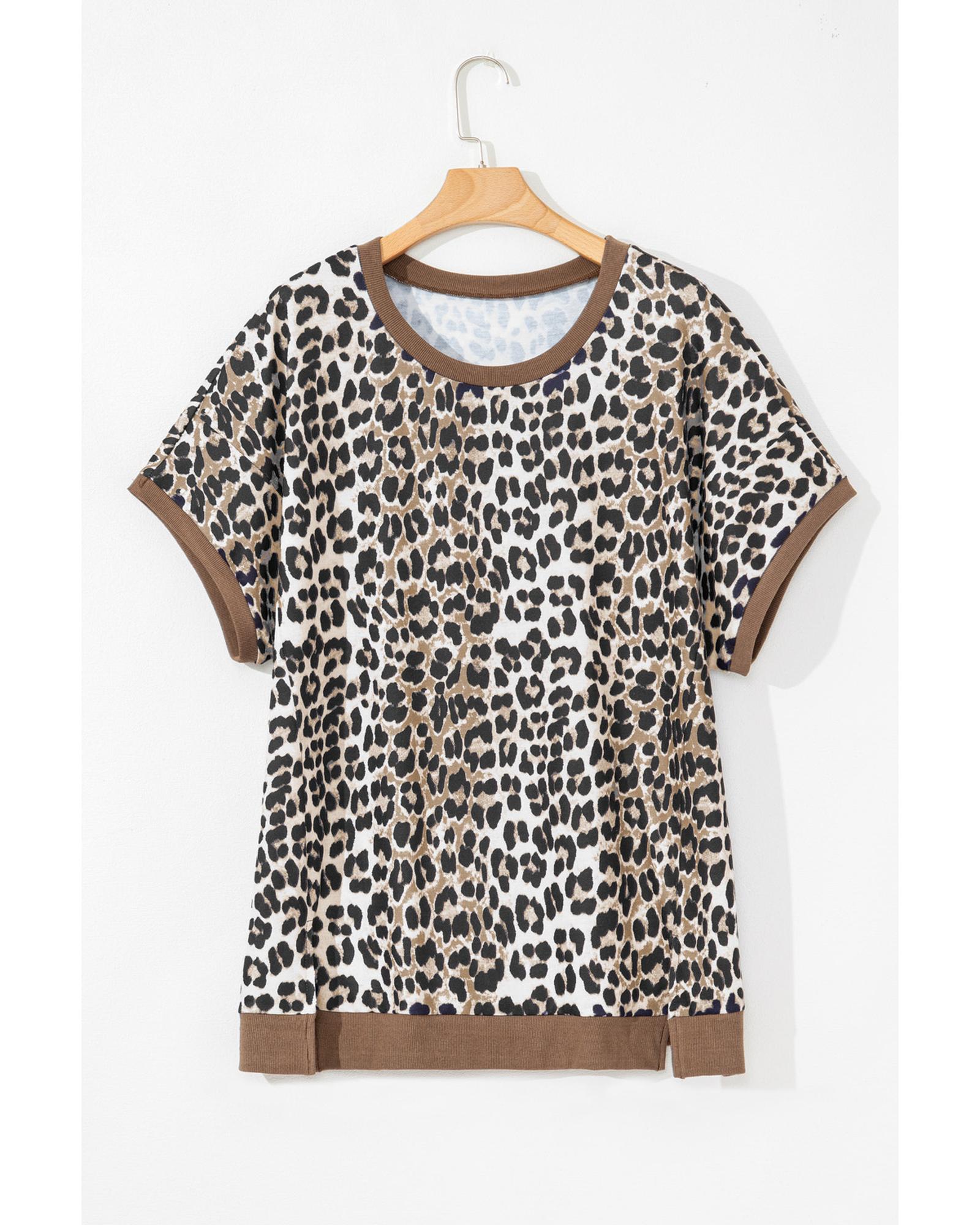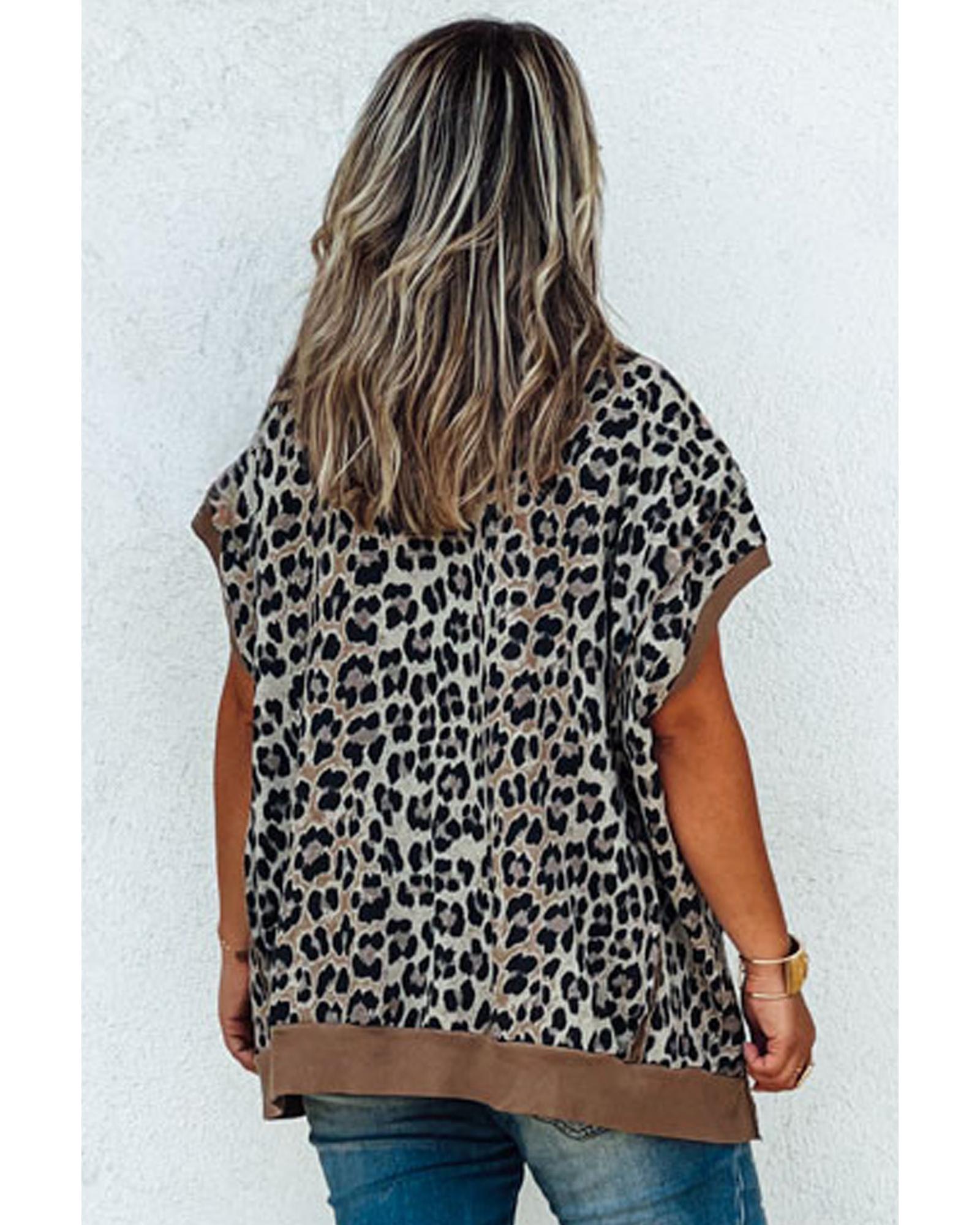 Khaki Leopard Contrast Trim Short Sleeve Loose Plus Size Top – 1X