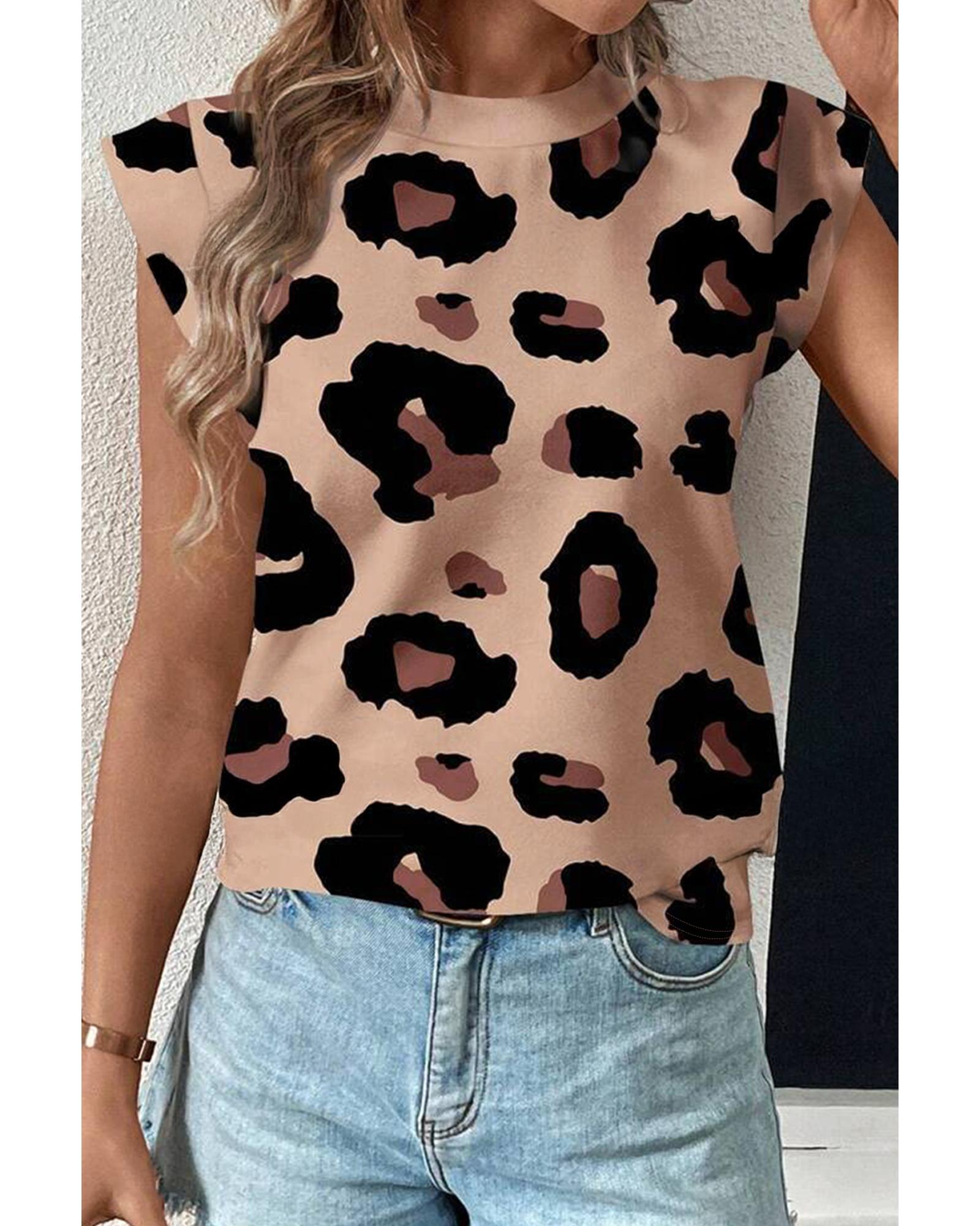 - Khaki Leopard Crew Neck Cap Sleeve Casual Tee