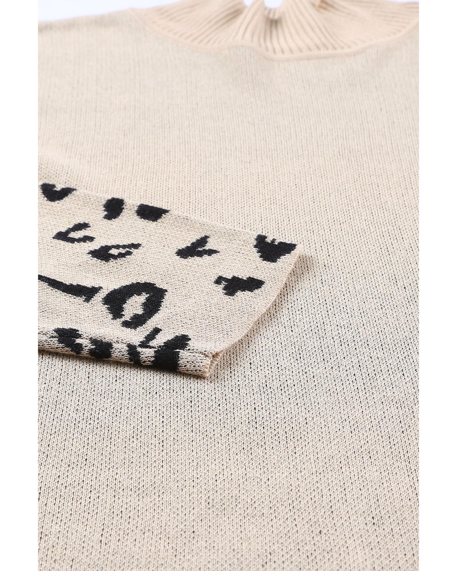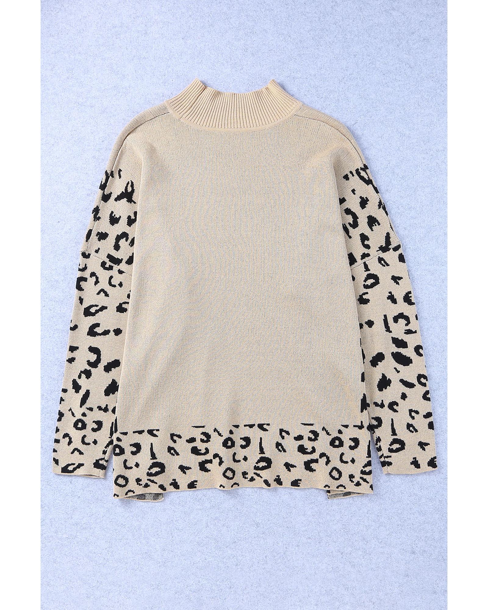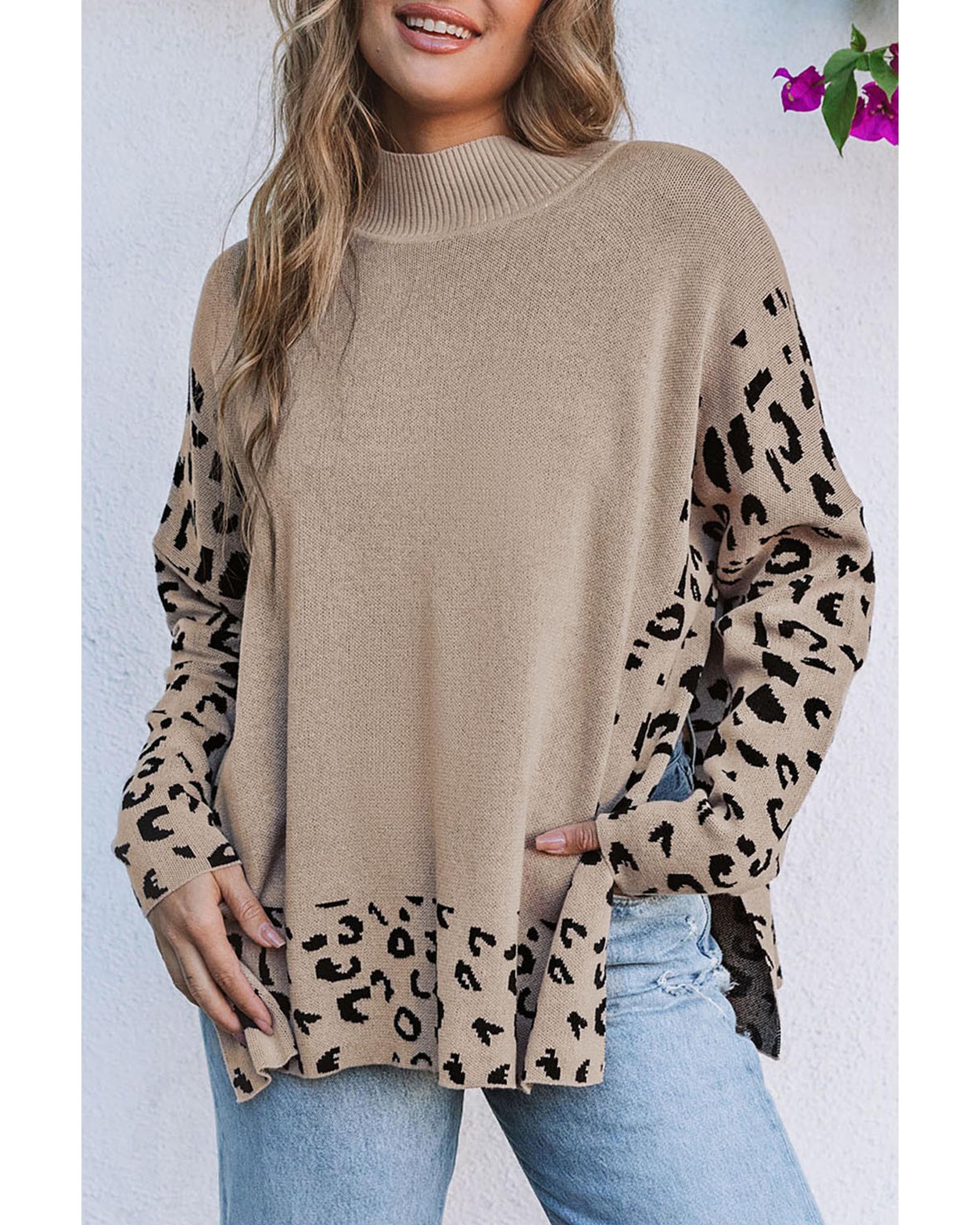 Khaki Leopard High Neck Side Slit Oversized Sweater – M