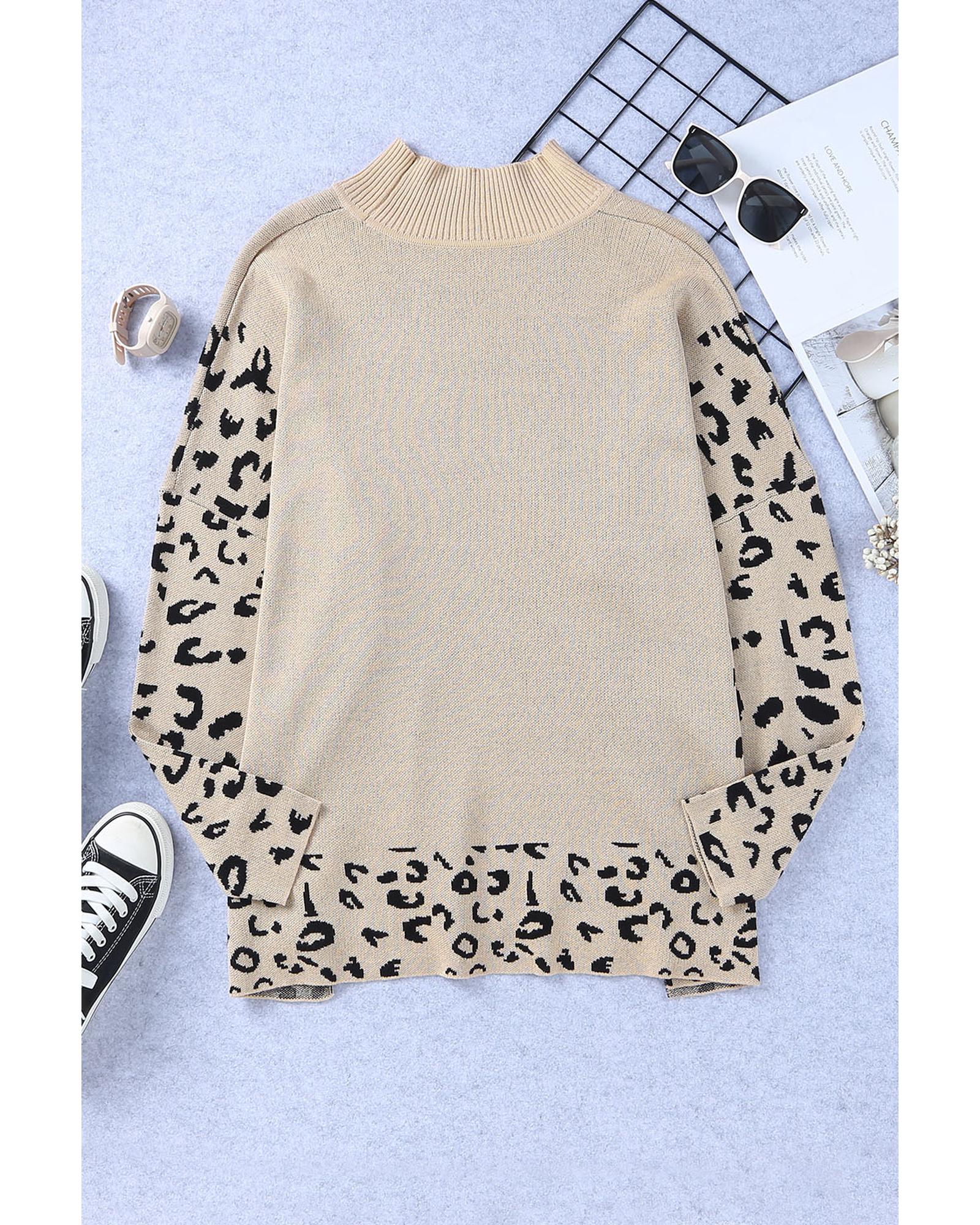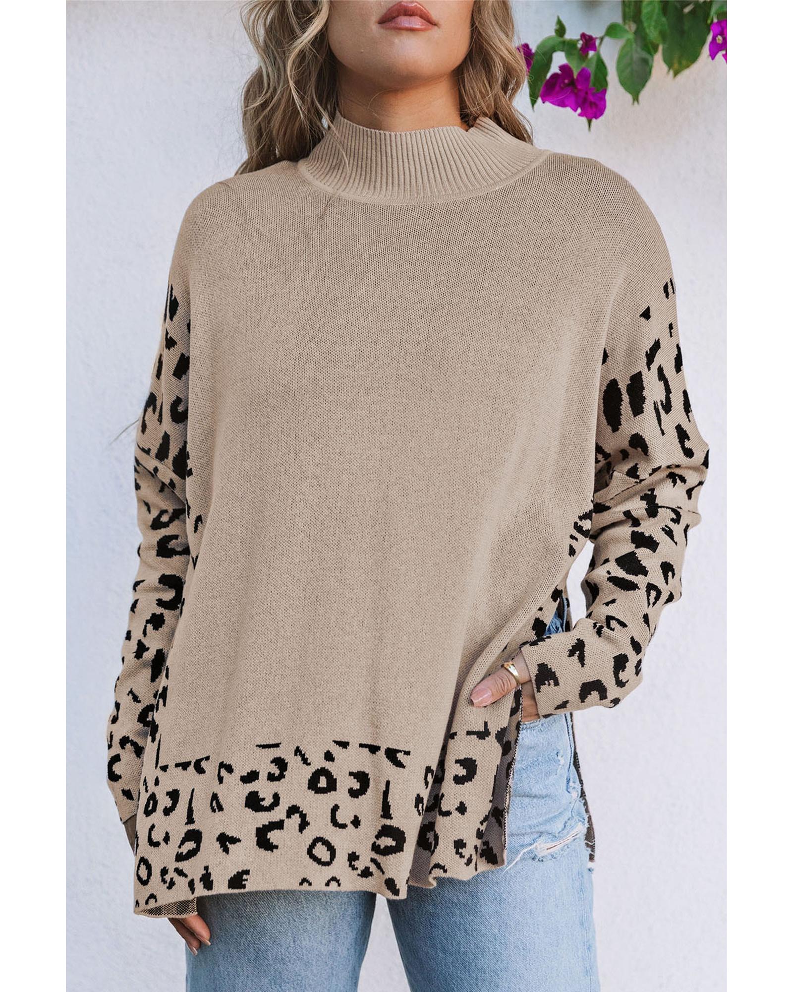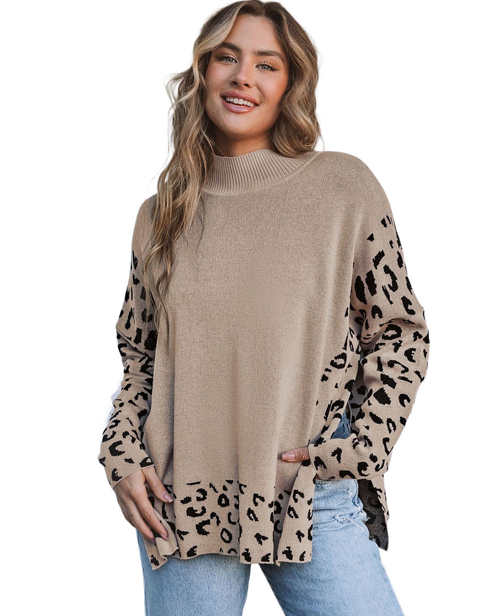 Khaki Leopard High Neck Side Slit Oversized Sweater – XL