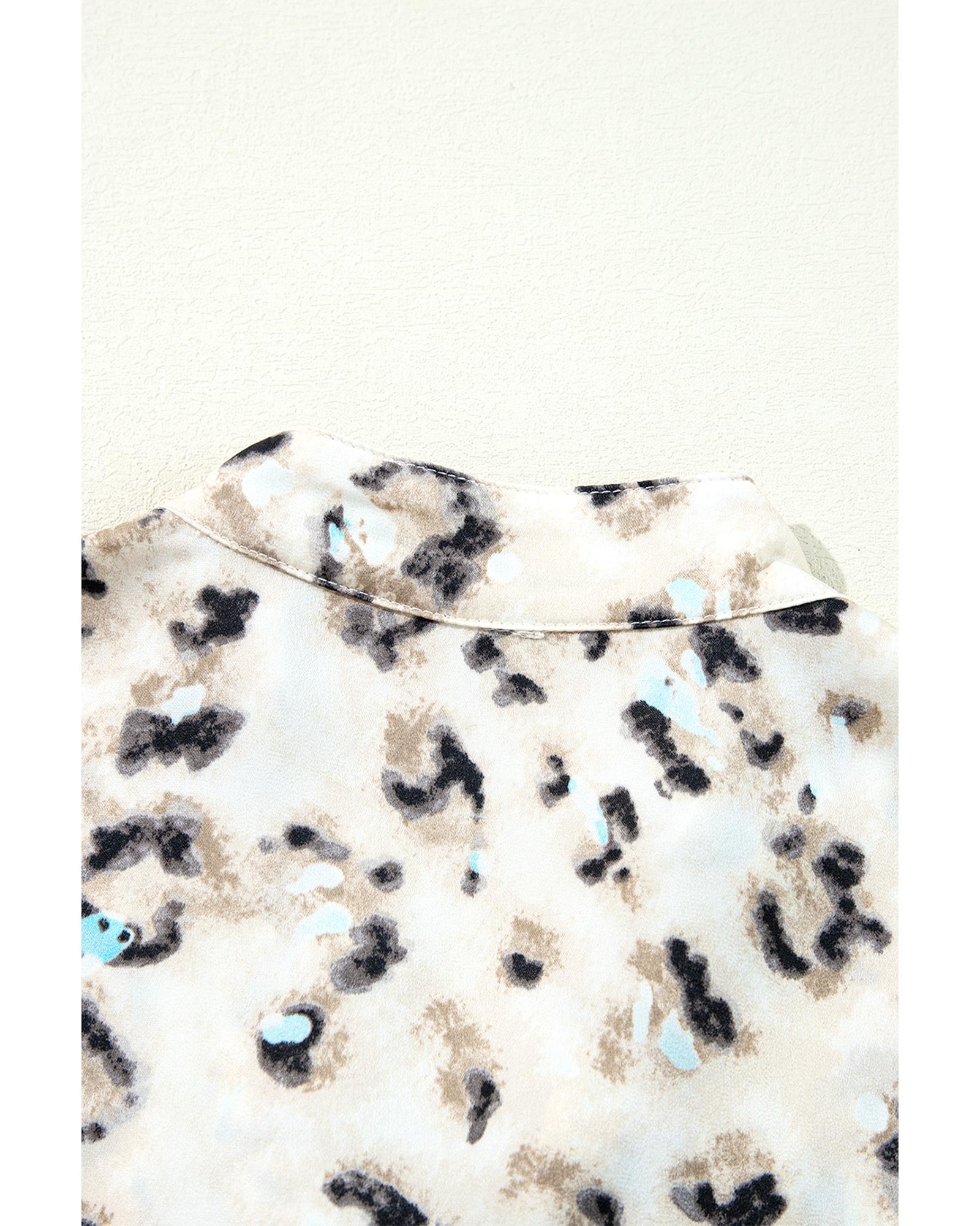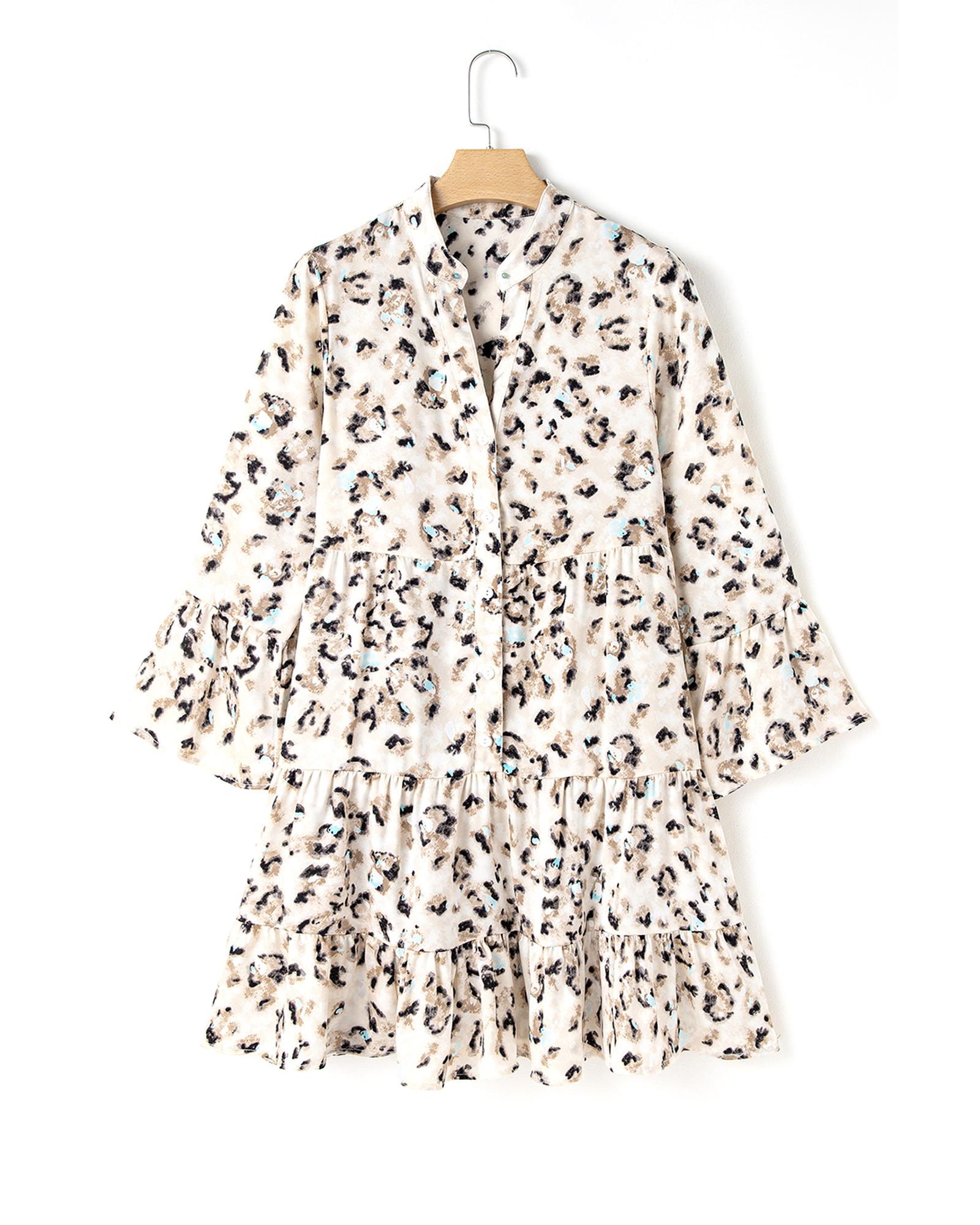 Khaki Leopard Print Buttoned Front 3/4 Sleeve Tiered Ruffled Hem Dress – L