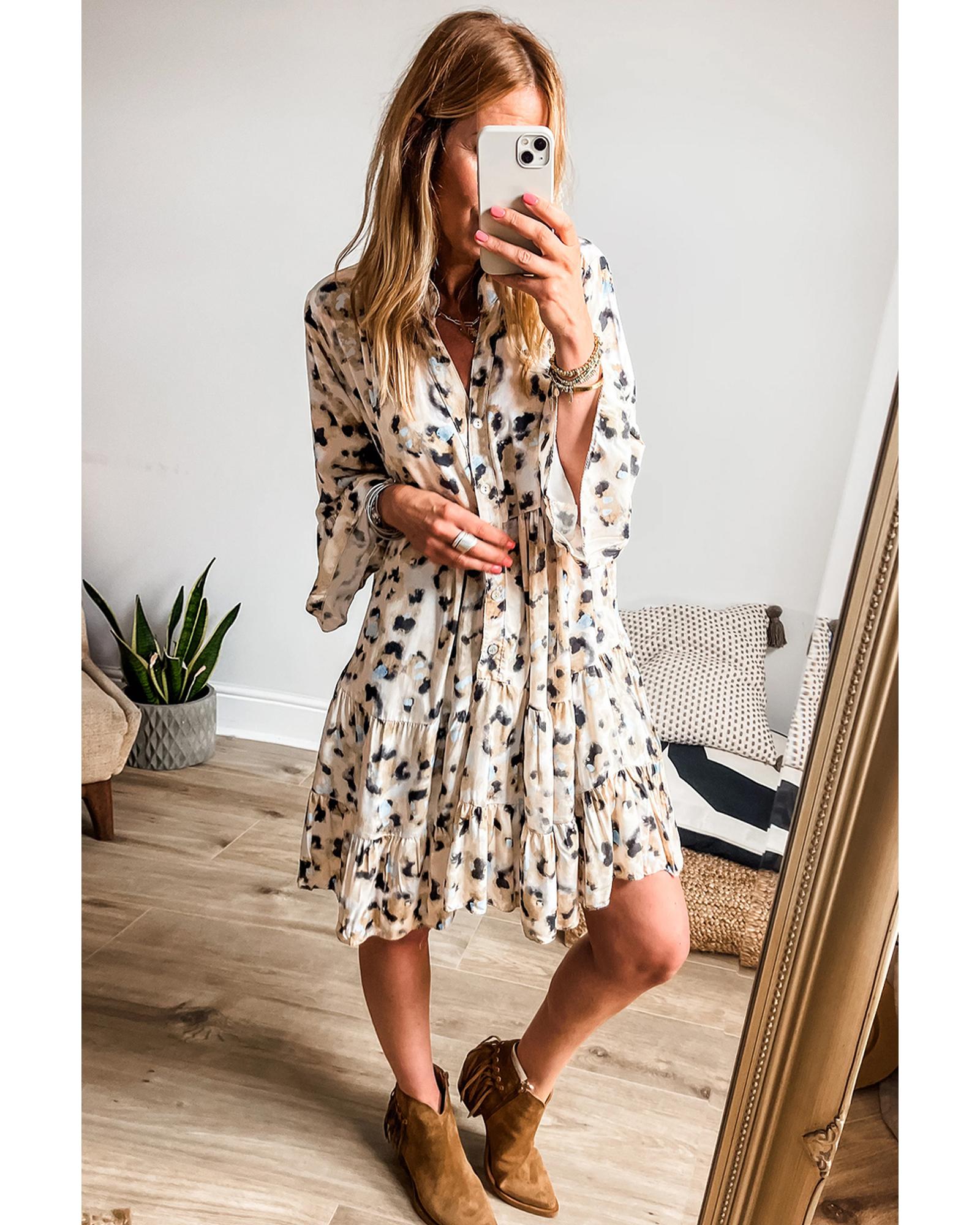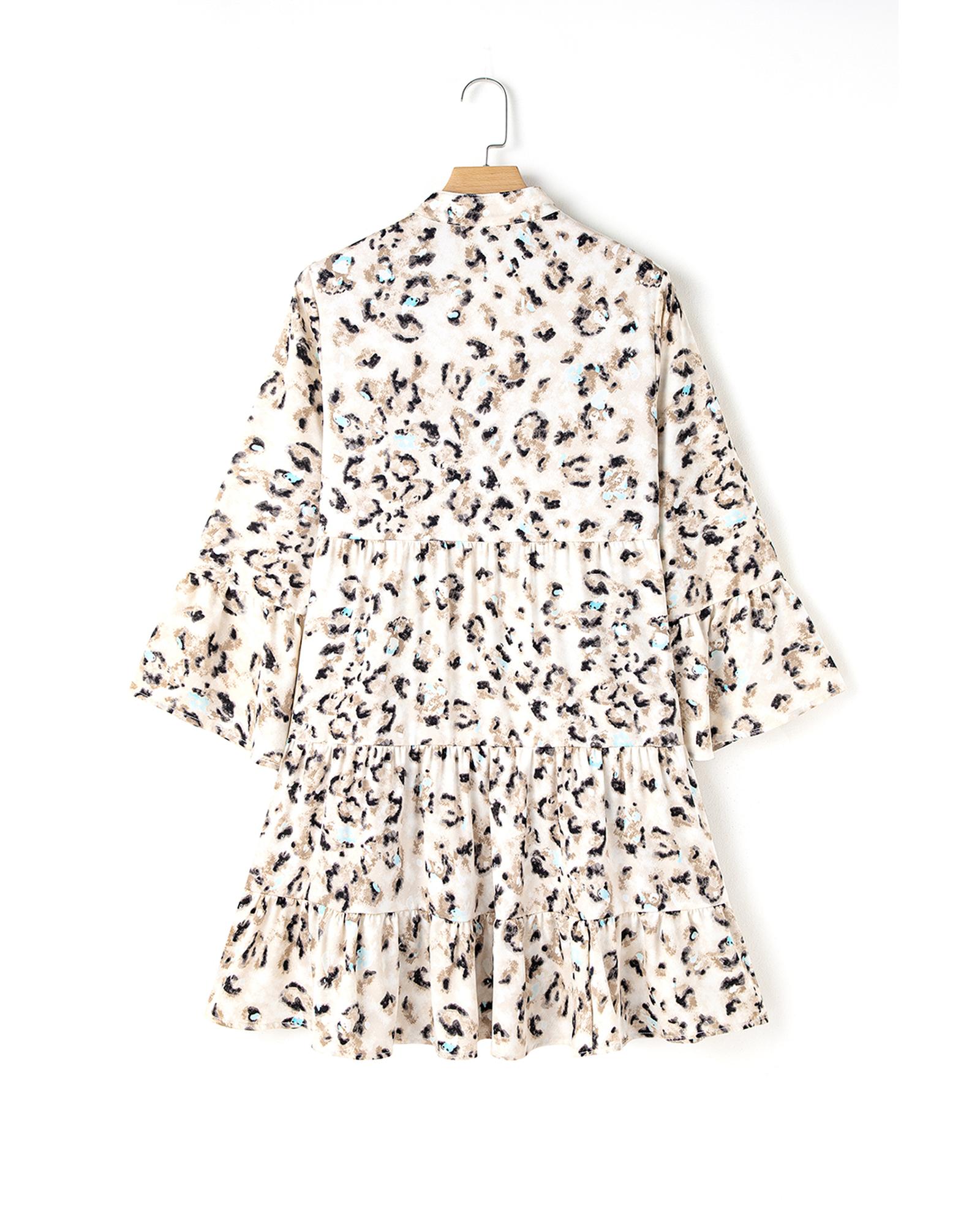 Khaki Leopard Print Buttoned Front 3/4 Sleeve Tiered Ruffled Hem Dress – XL
