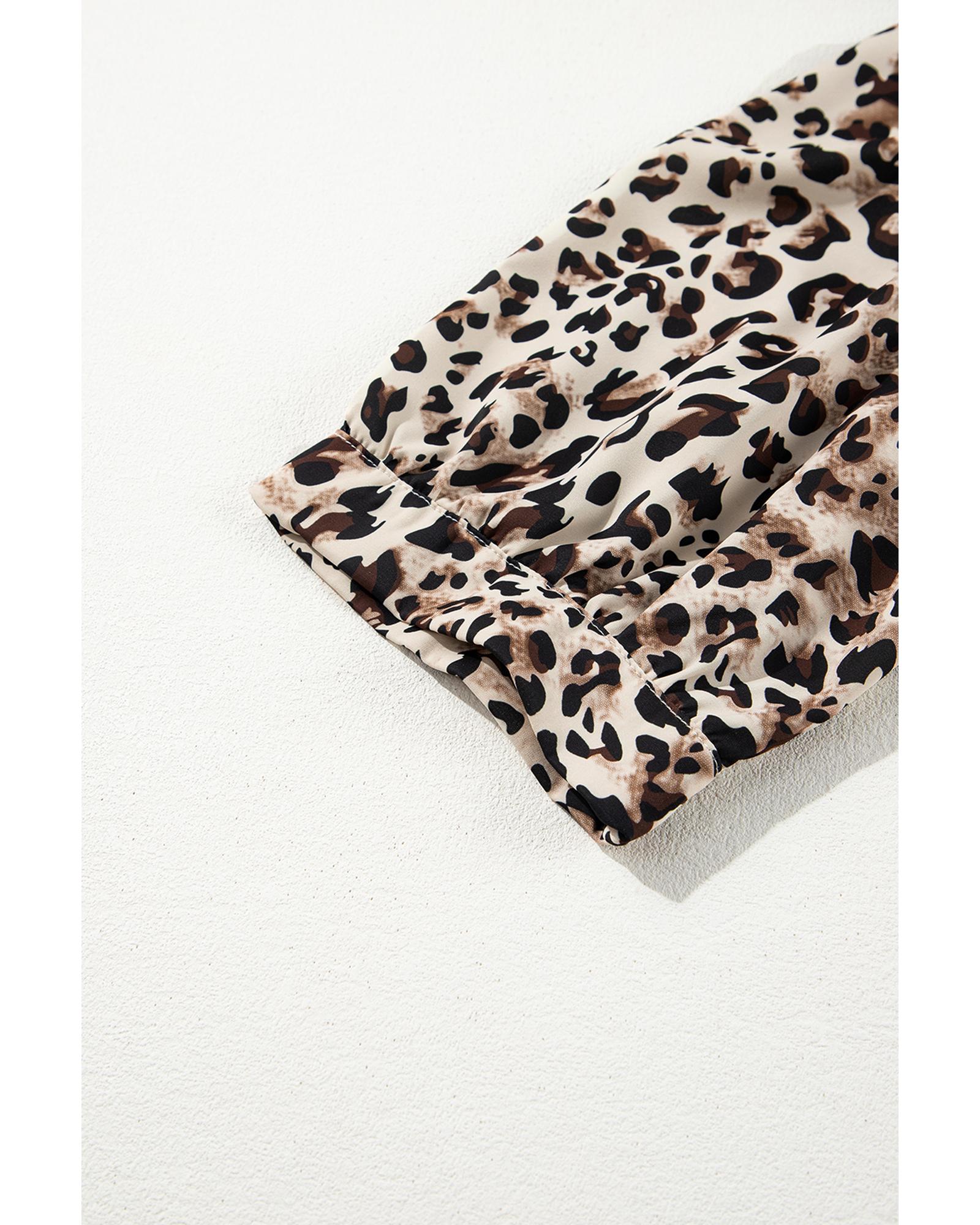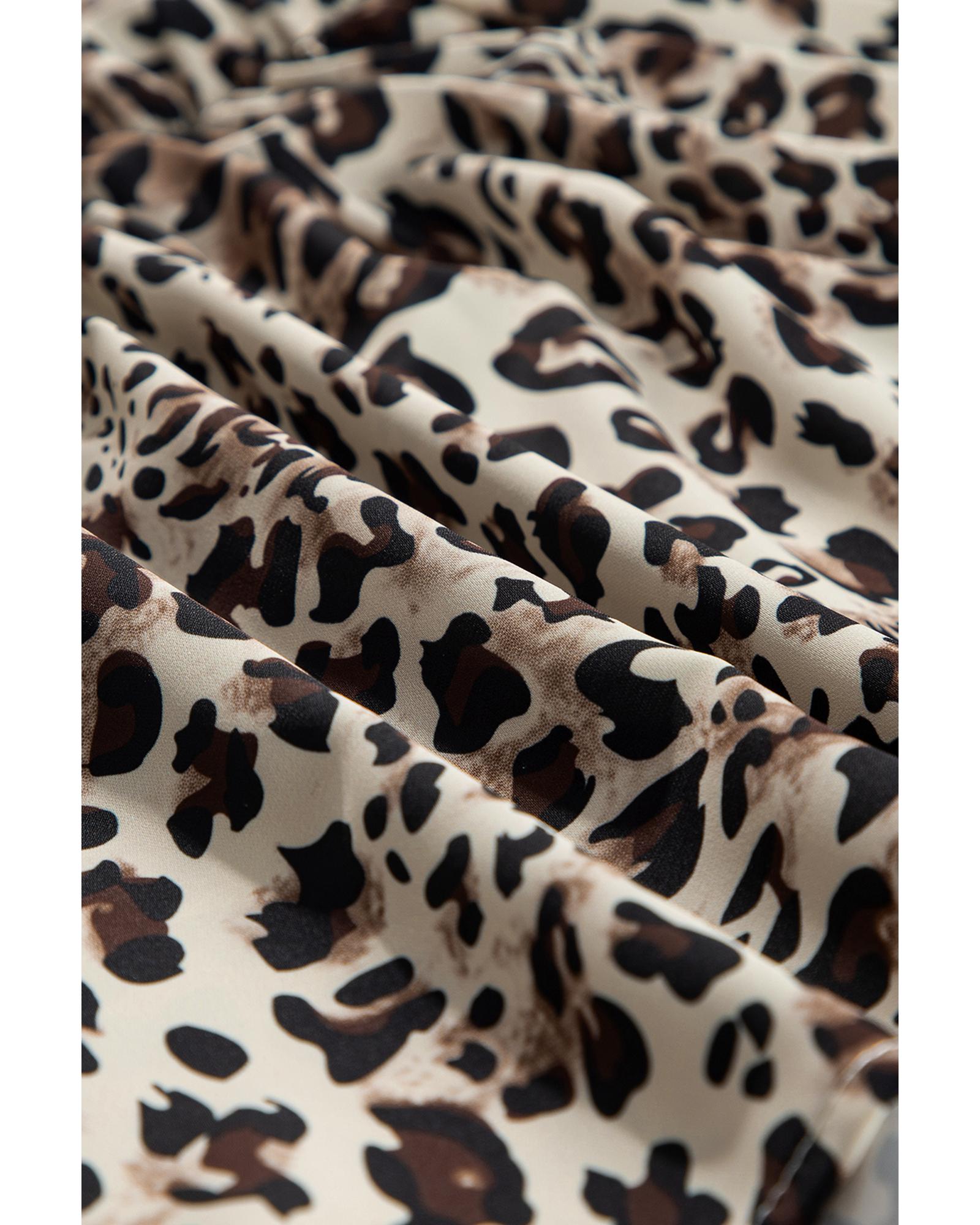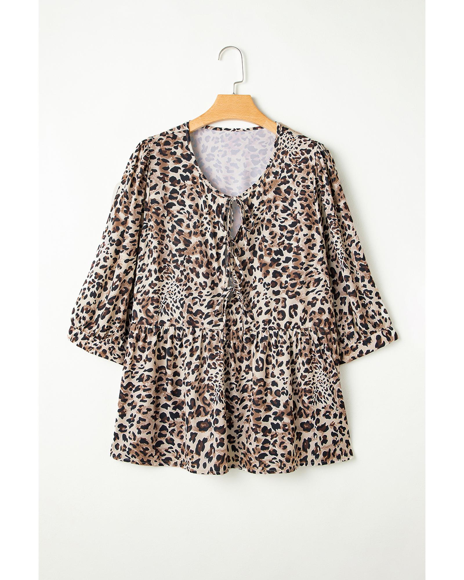 Khaki Leopard Print Lace-up Ruffled 3/4 Sleeve Plus Size Blouse – 4X