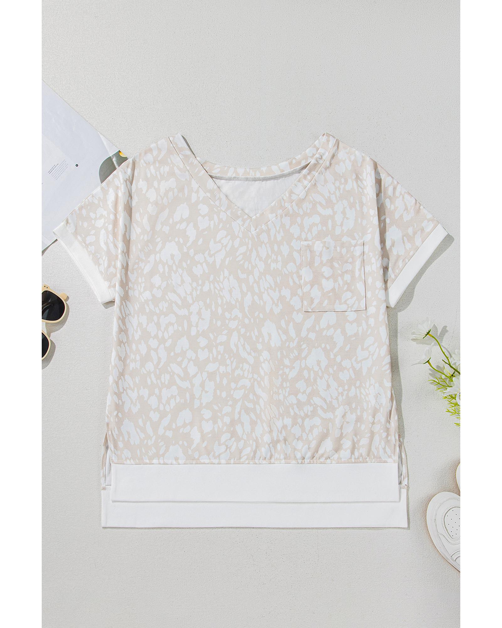 Khaki Leopard Print V Neck Side Slit Loose Fit T Shirt – L