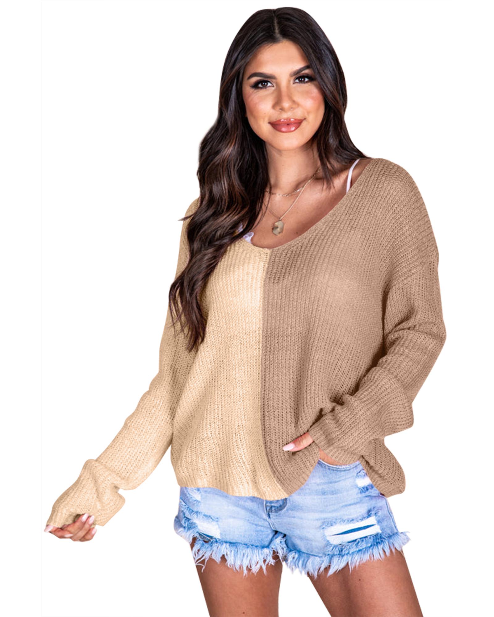 Khaki Long Sleeve V-Neck Colorblock Sweater – XL
