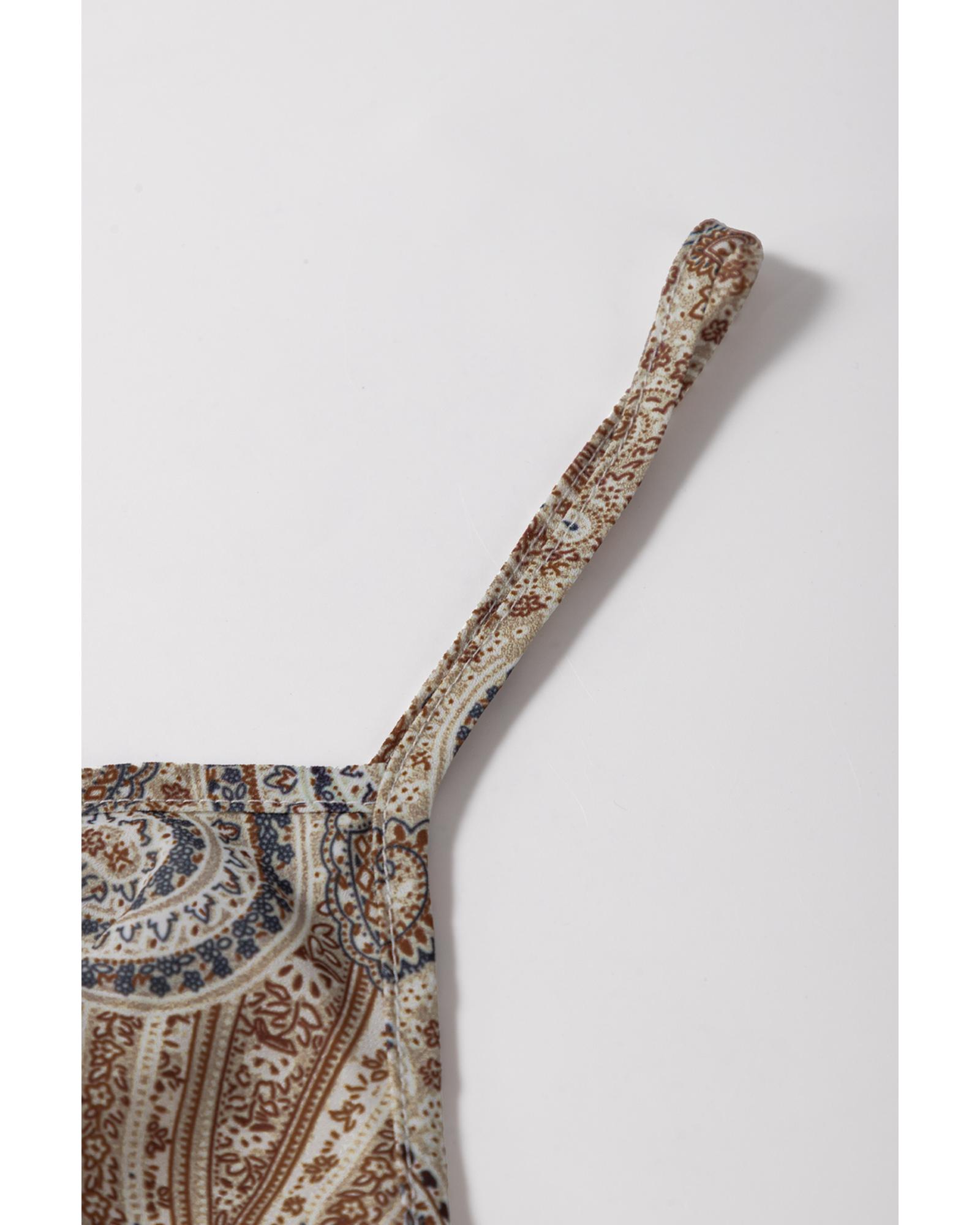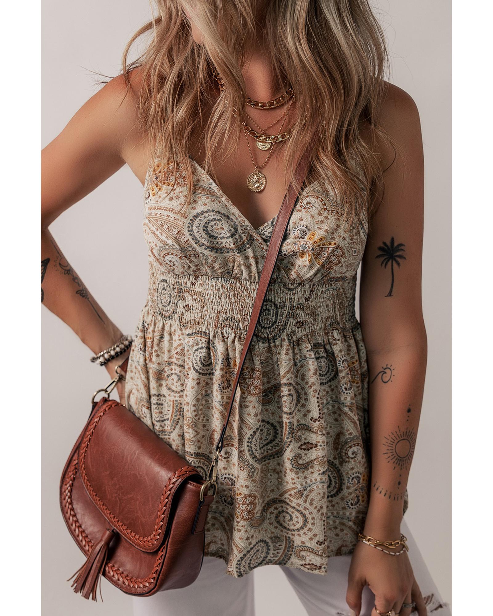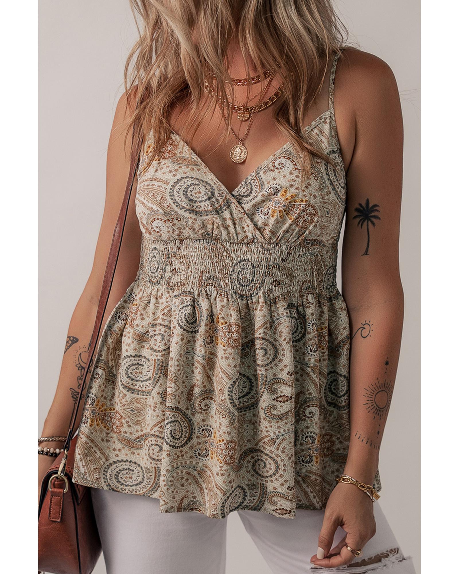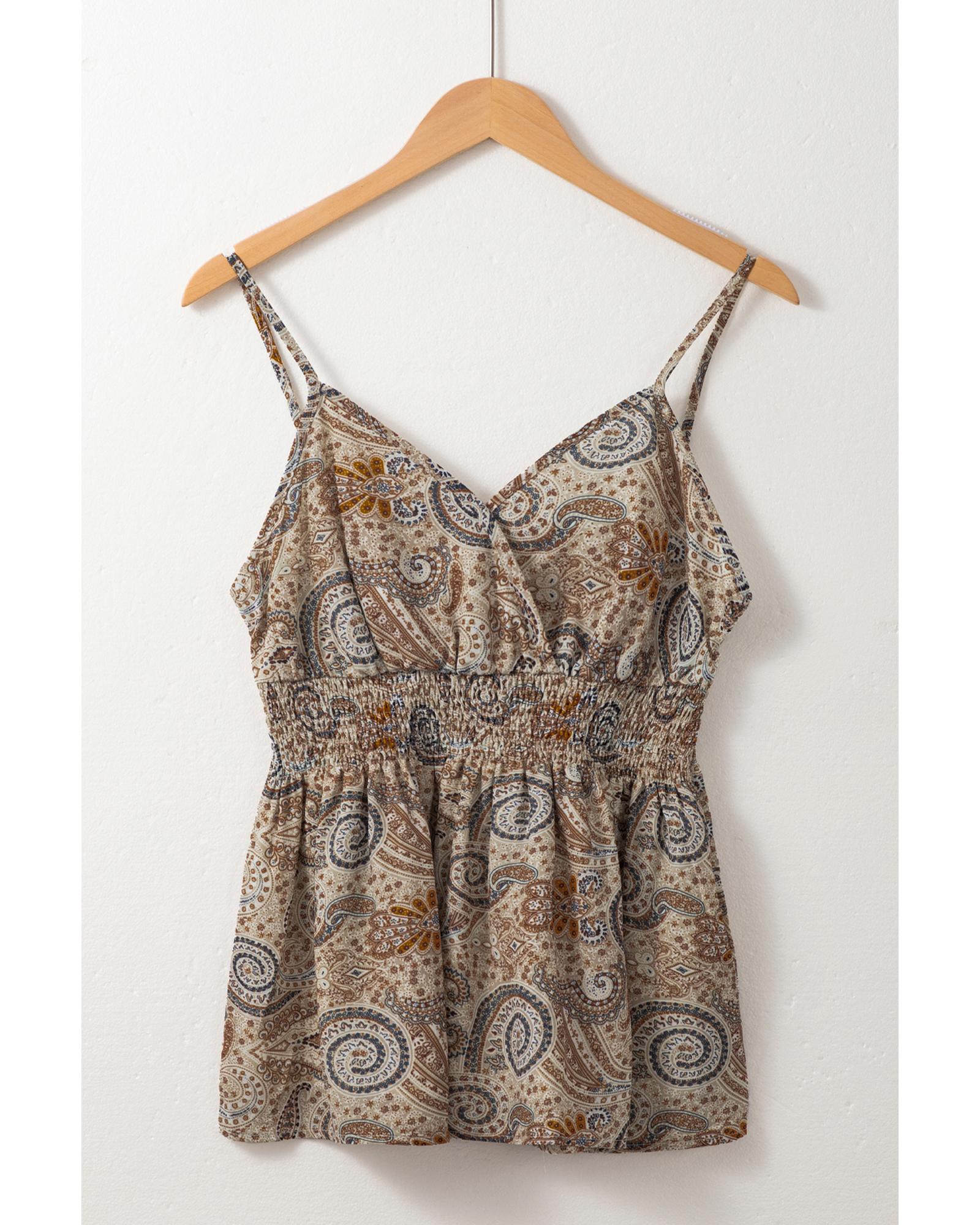 Khaki Paisley Printed Spaghetti Strap V Neck Smocked Babydoll Tank Top – L