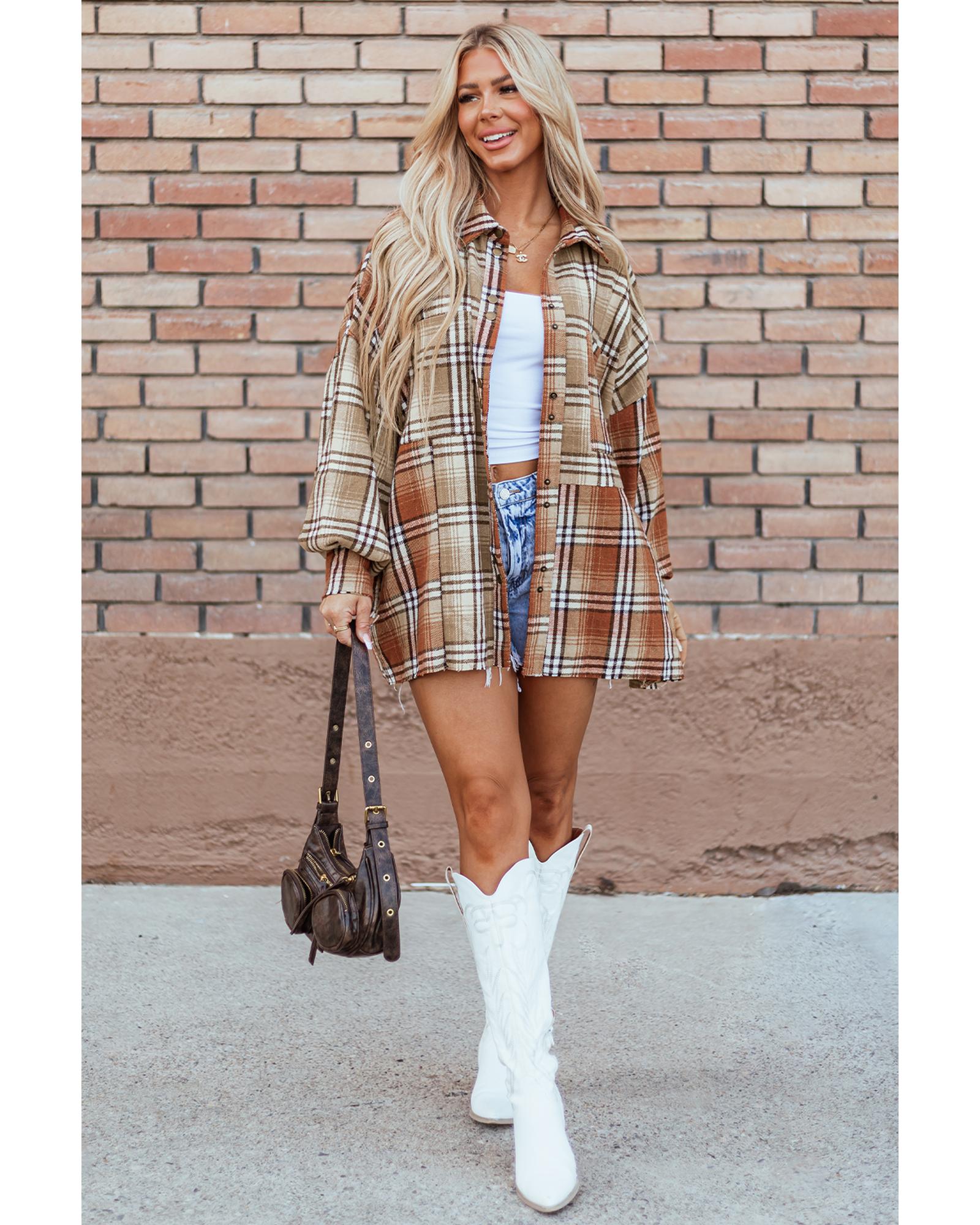 Khaki Plaid Colorblock Patchwork High Low Shacket – XL