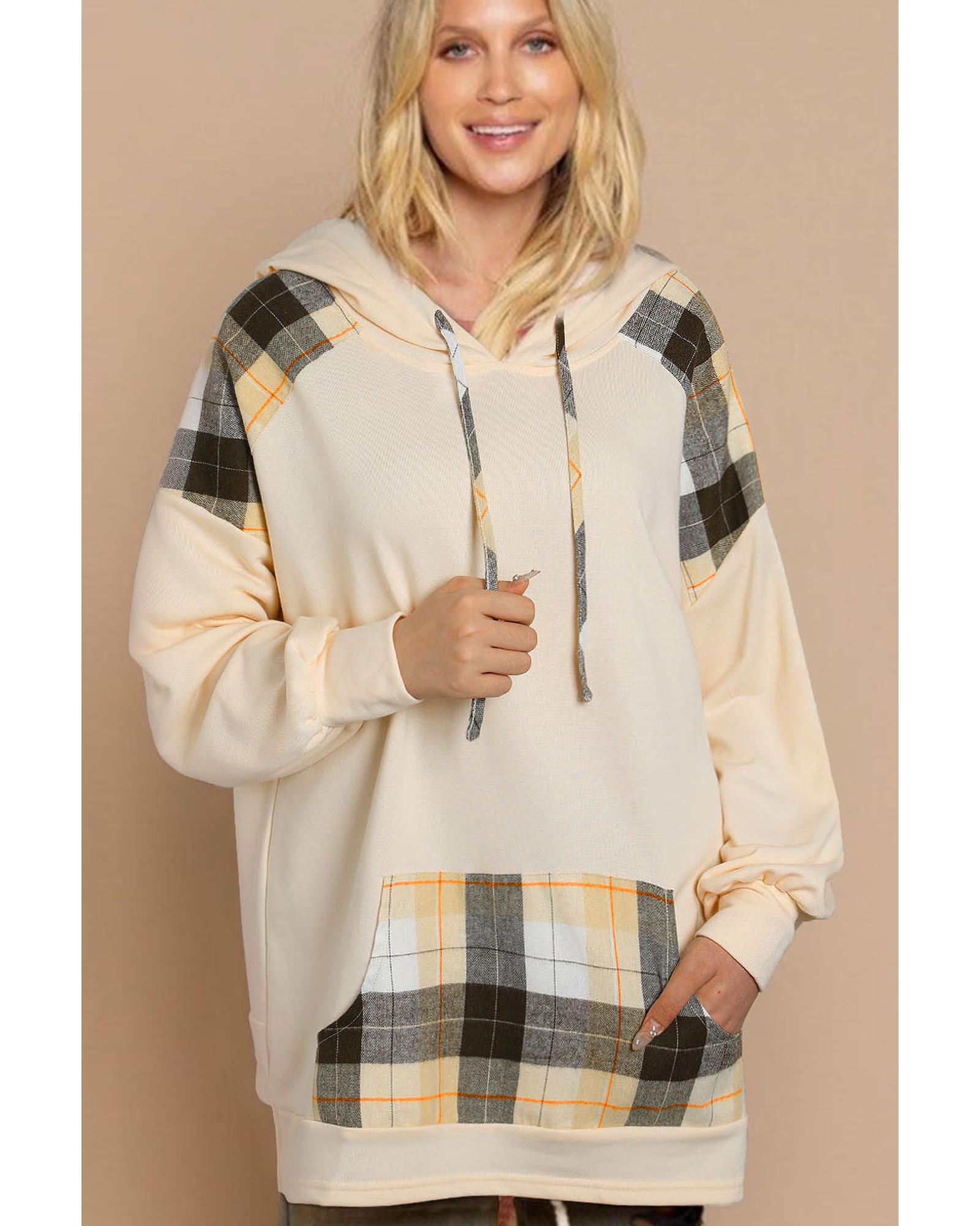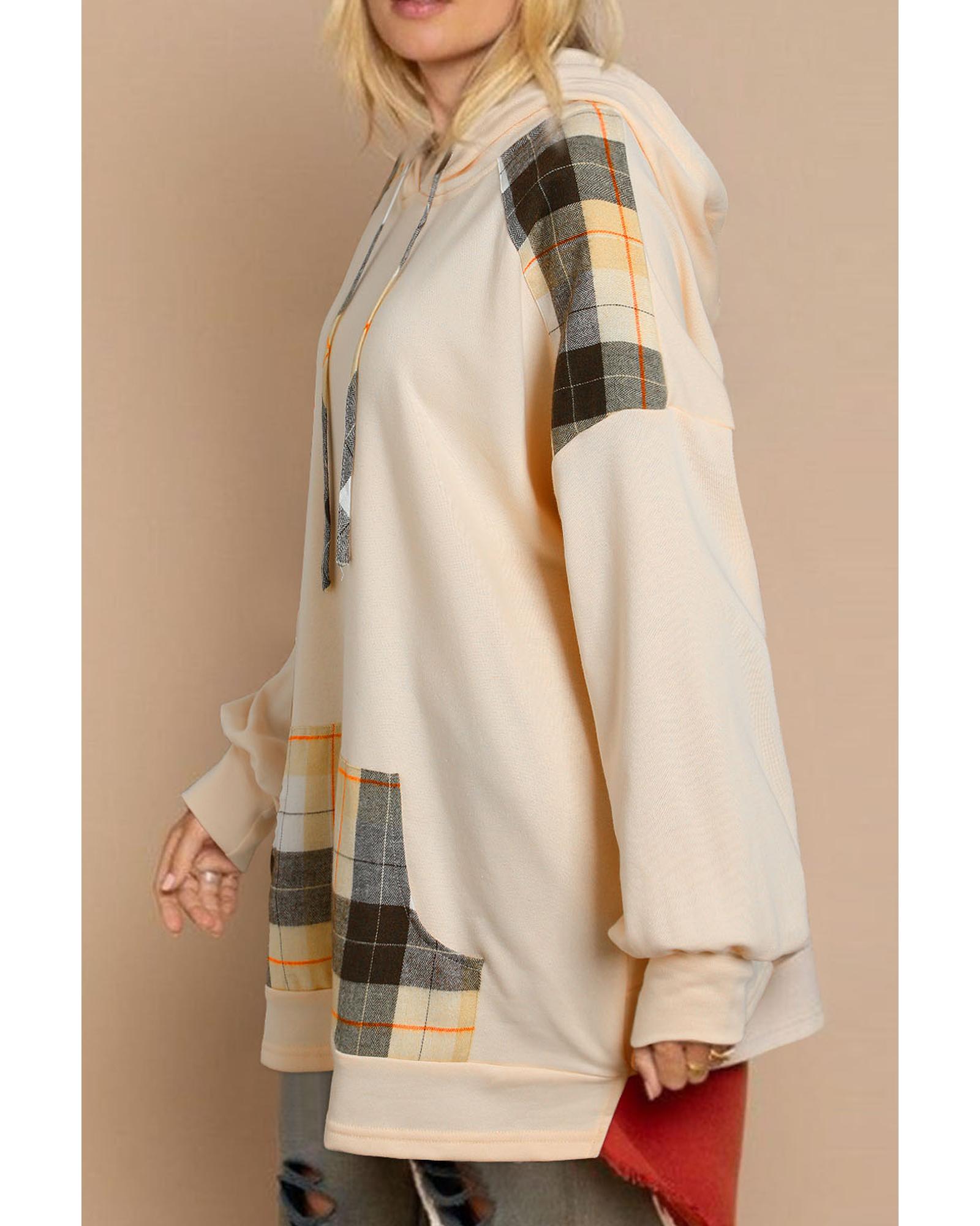• Khaki Plaid Patchwork Kangaroo Pocket Oversized Hoodie
