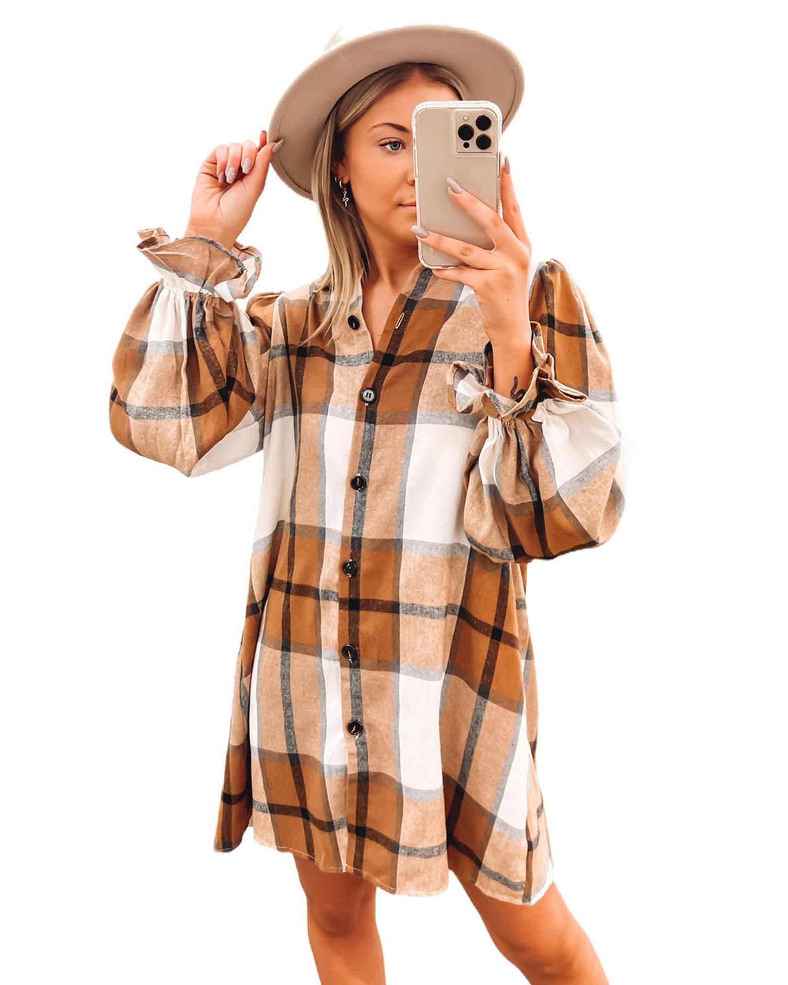 Khaki Plaid Pattern Collared Neck Ruffled Sleeve Shirt Dress – M