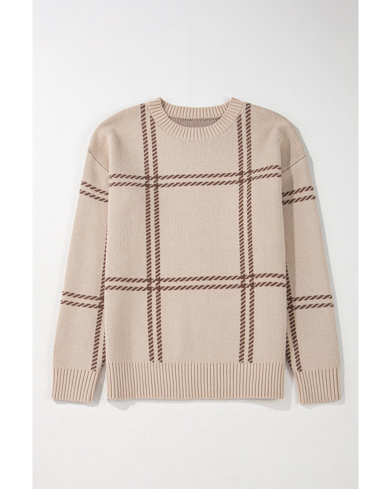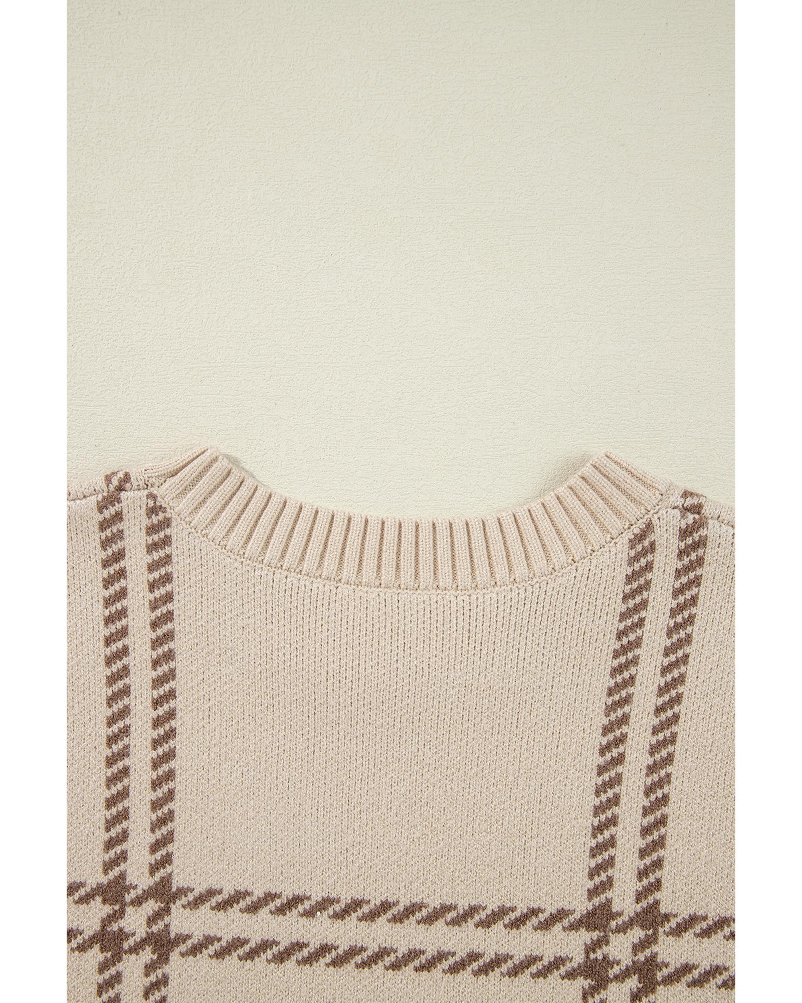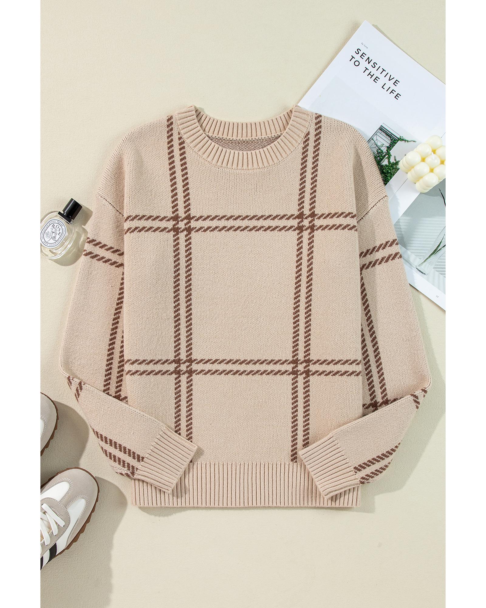 Khaki Plaid Pattern Knitted Drop Shoulder Sweater – M