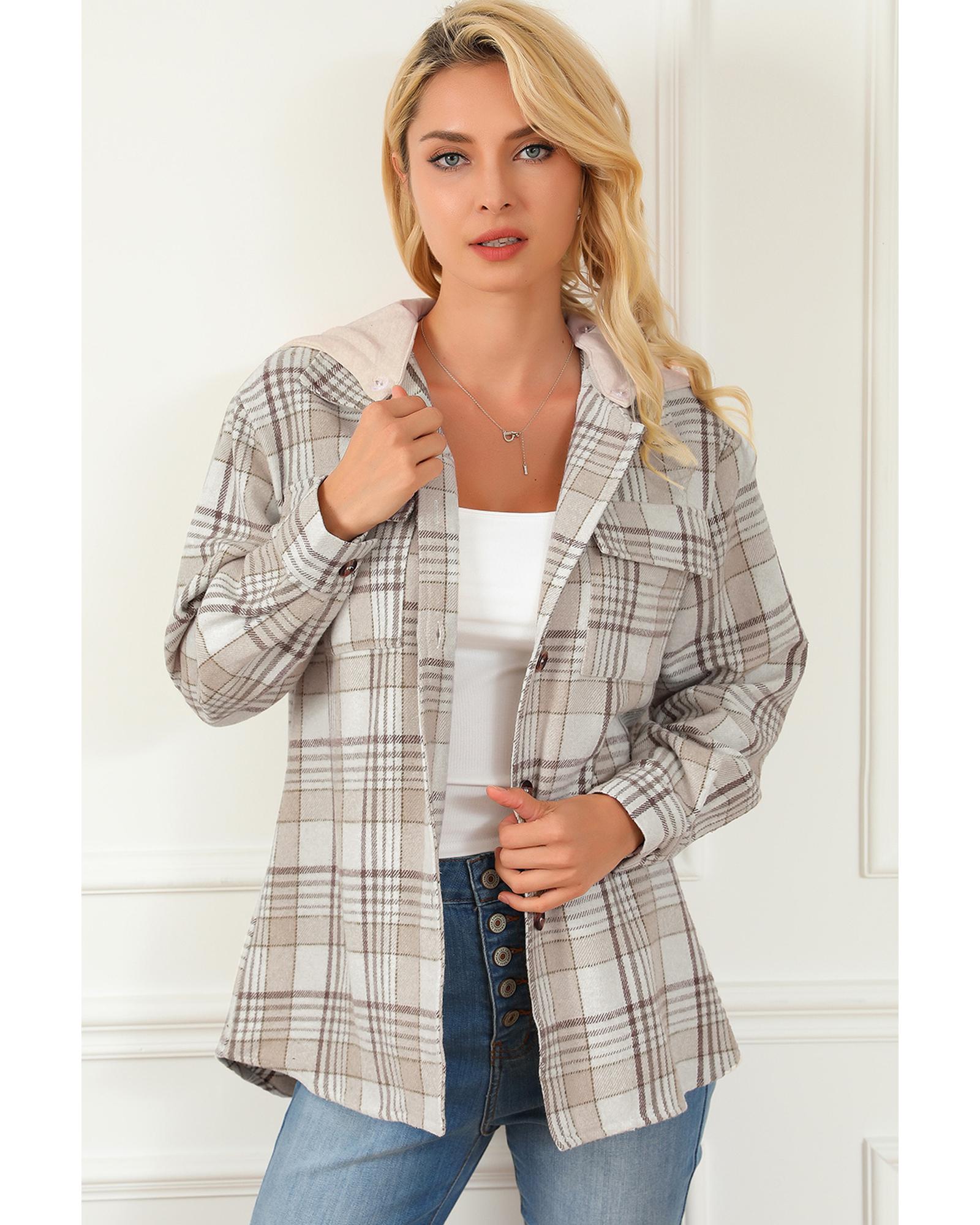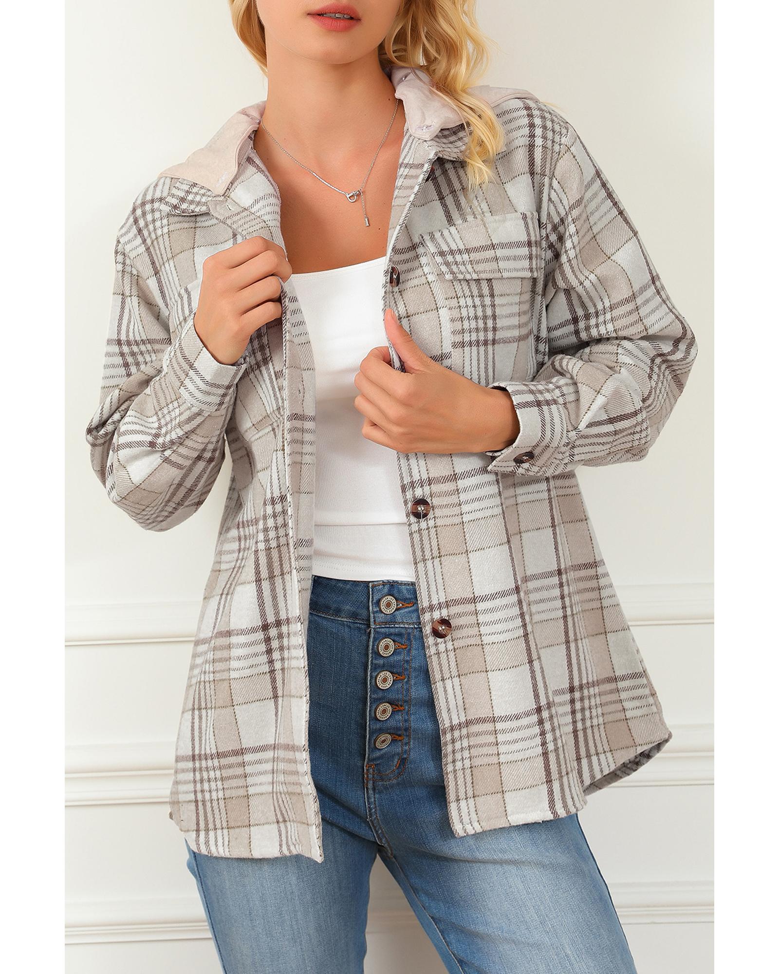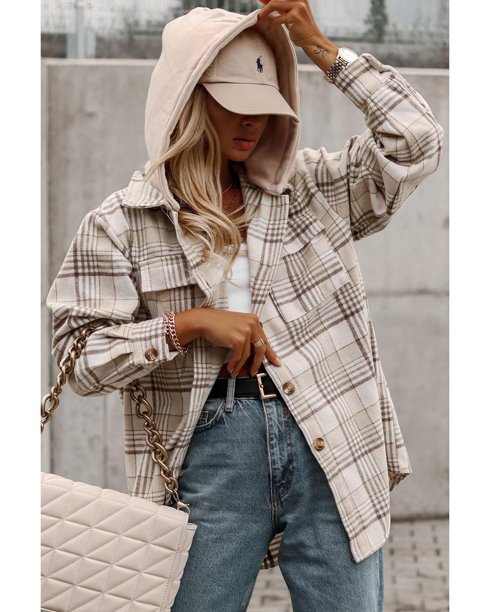 Khaki Plaid Removable Hood Buttoned Shacket – S
