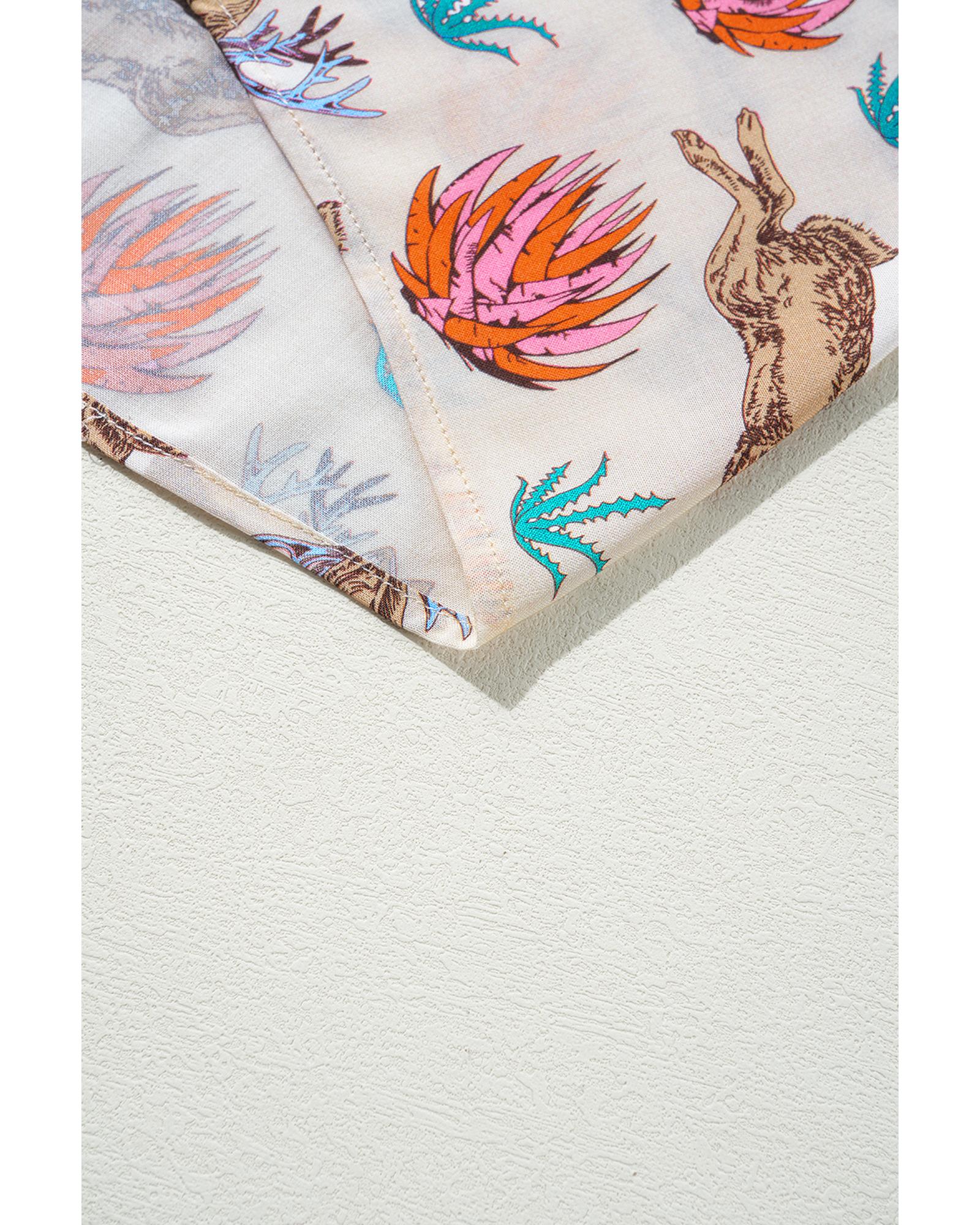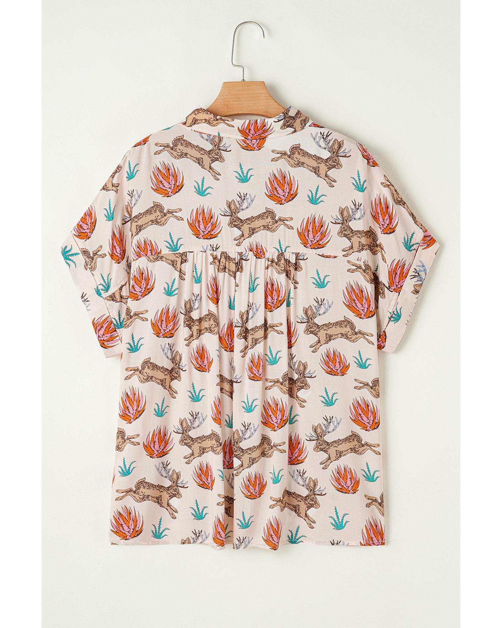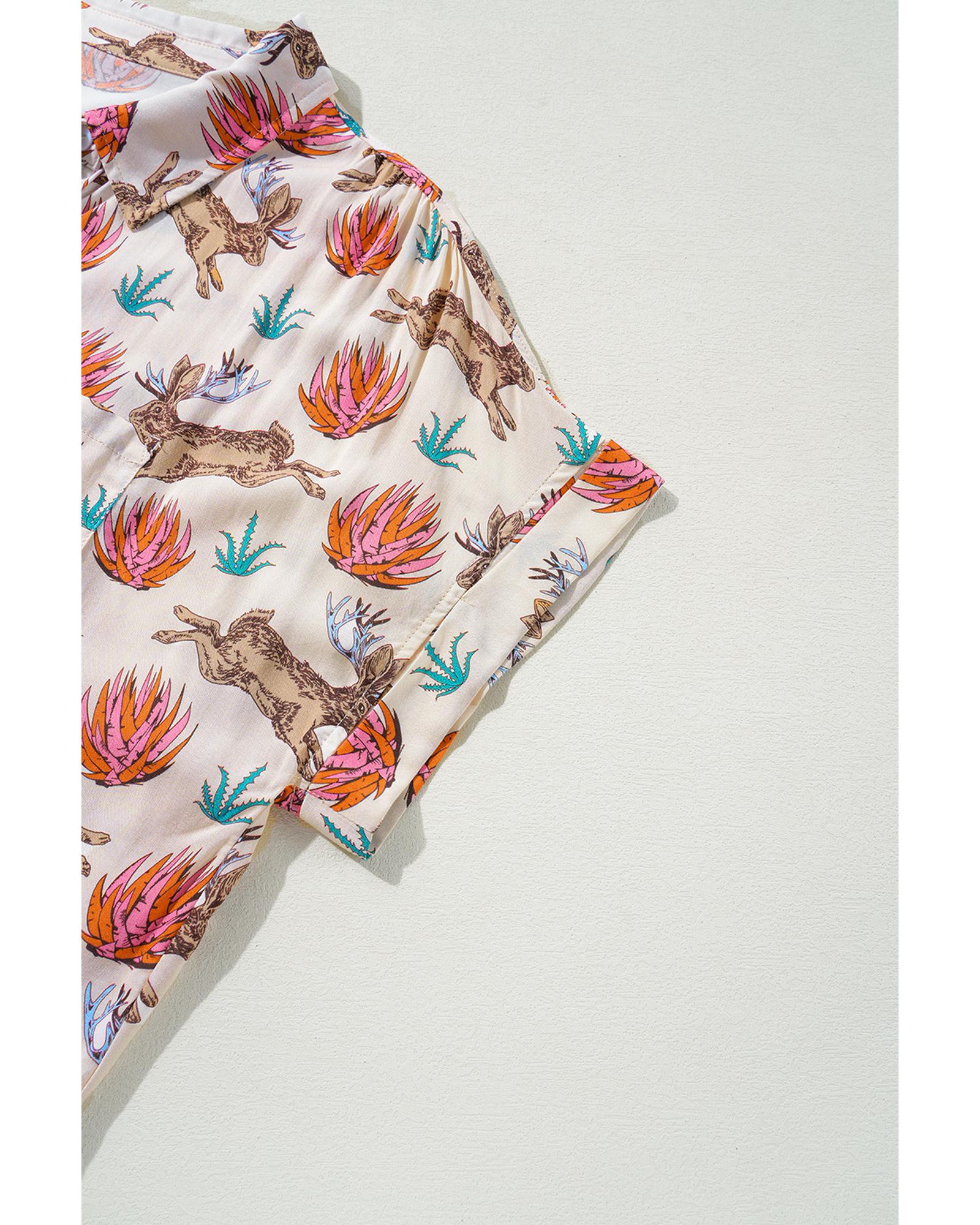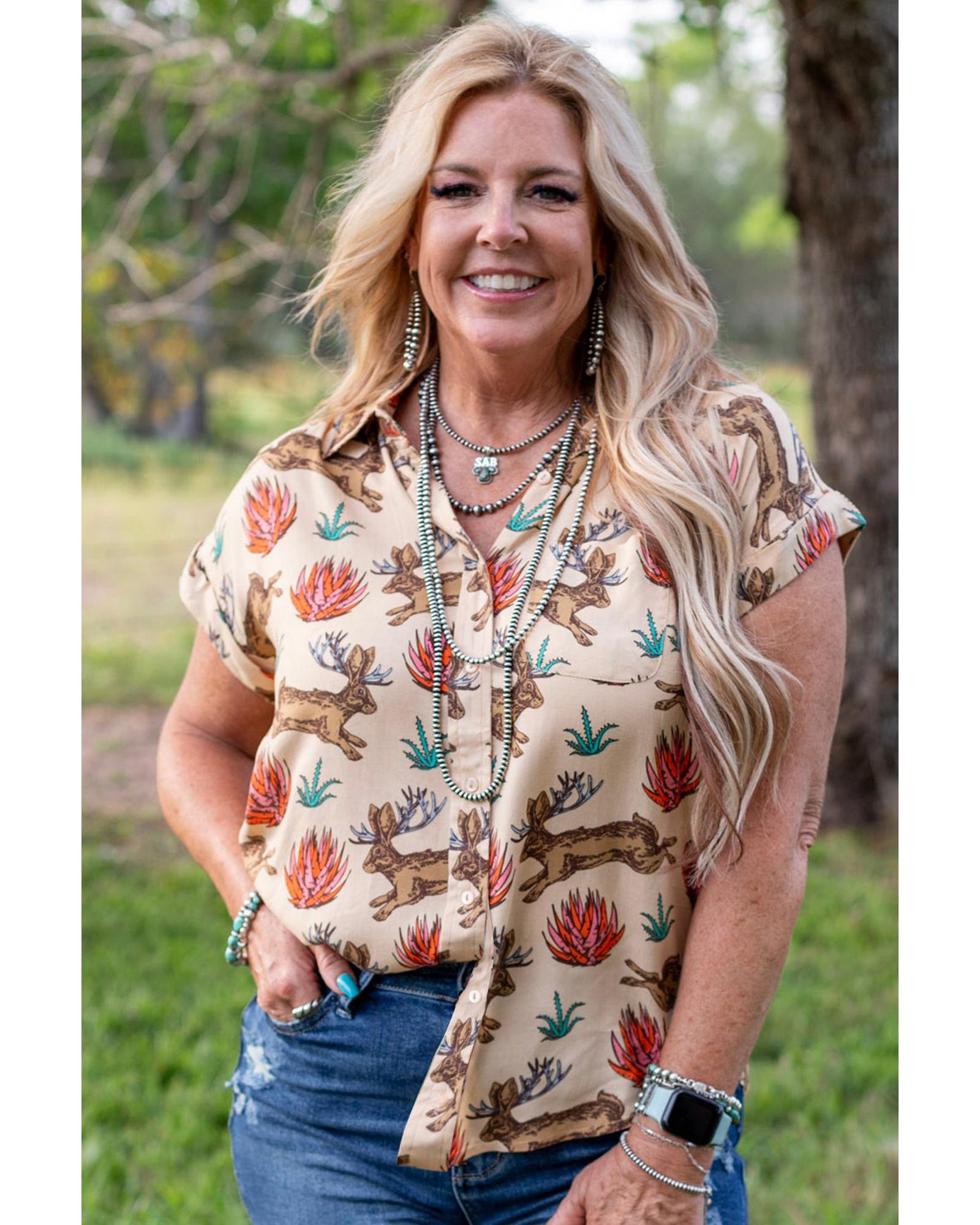 Khaki Plus Size Western Pattern Print Buttoned Short Sleeve Shirt – 1X