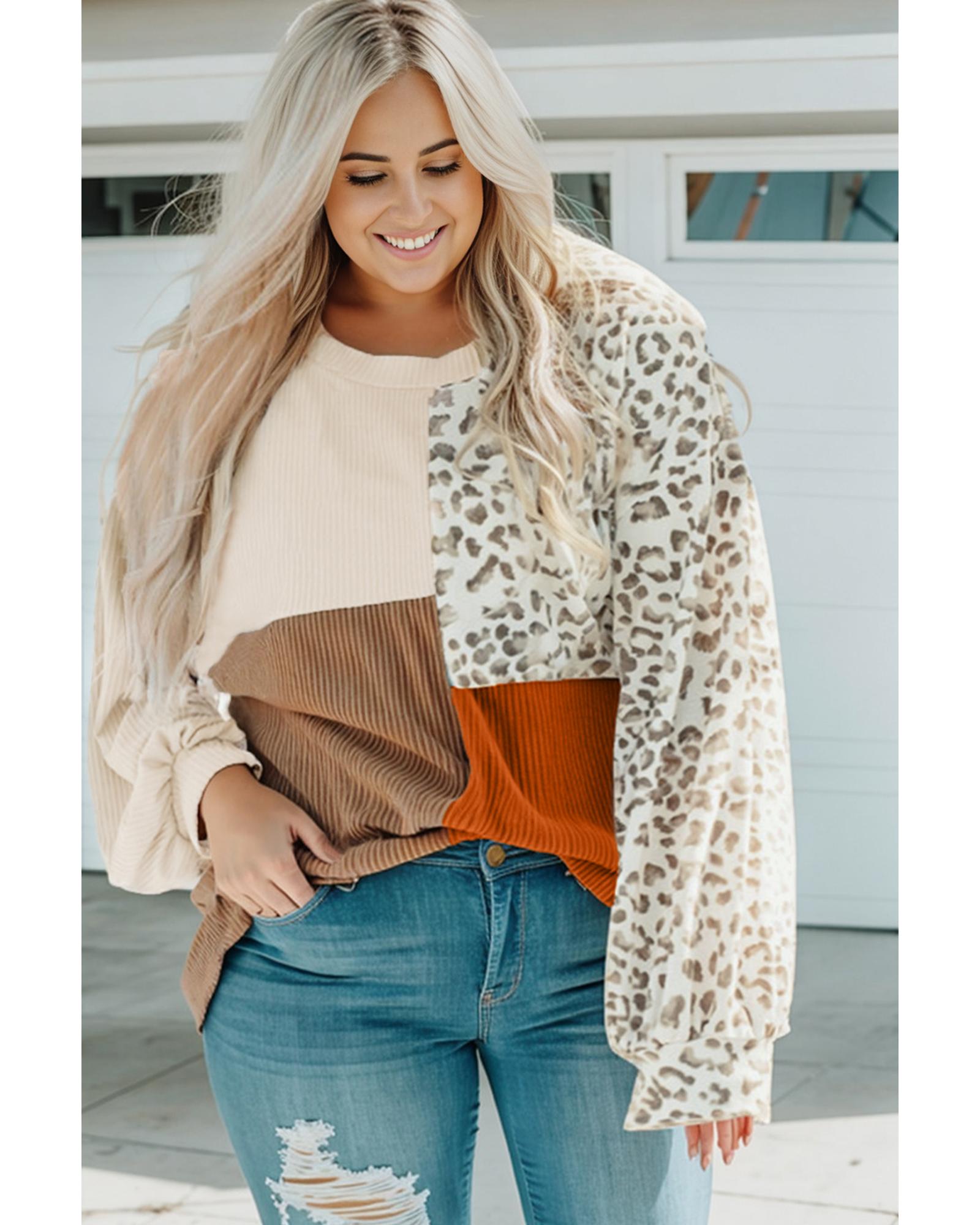 Khaki Ribbed Color Block Leopard Splicing Plus Size Top – 3X