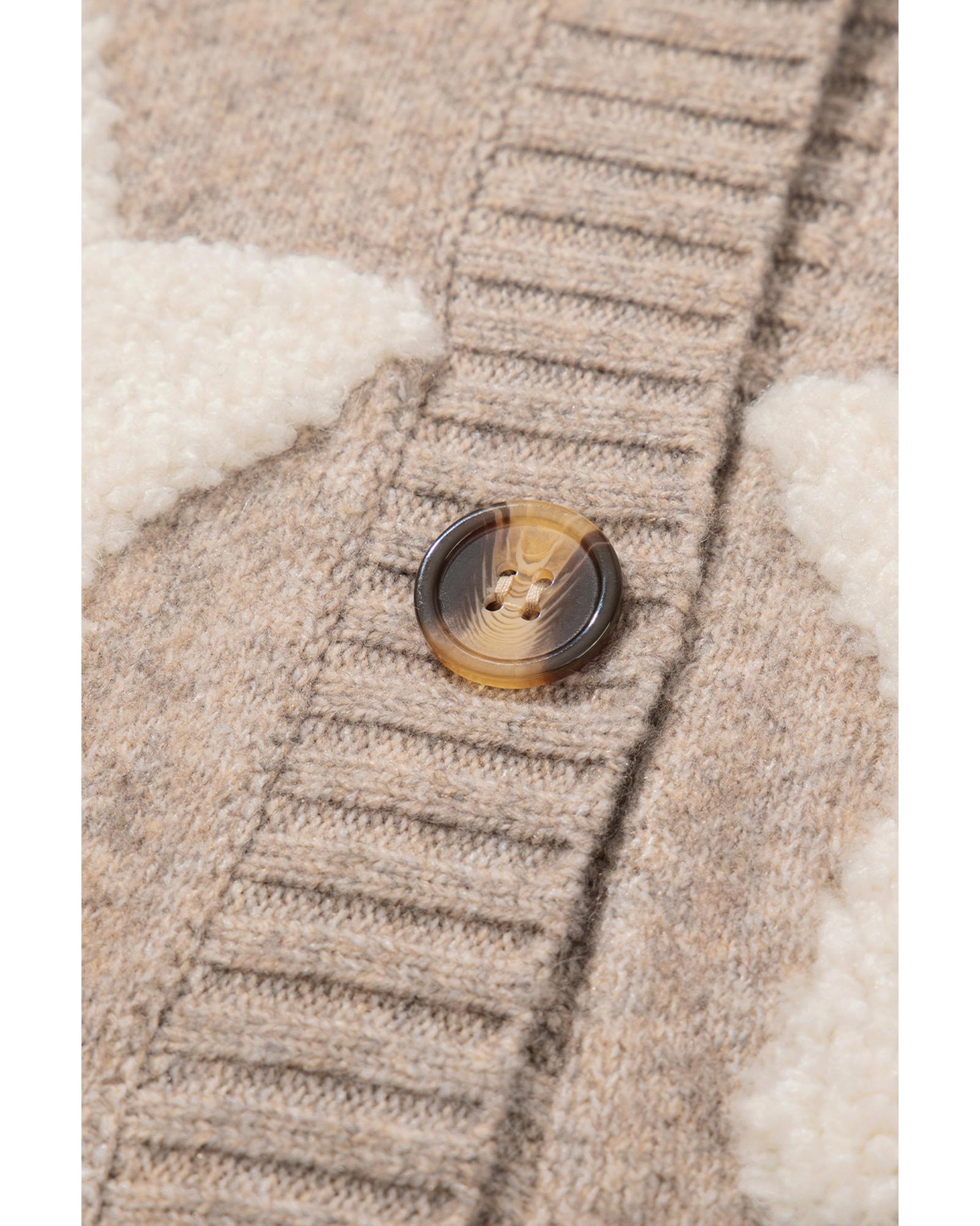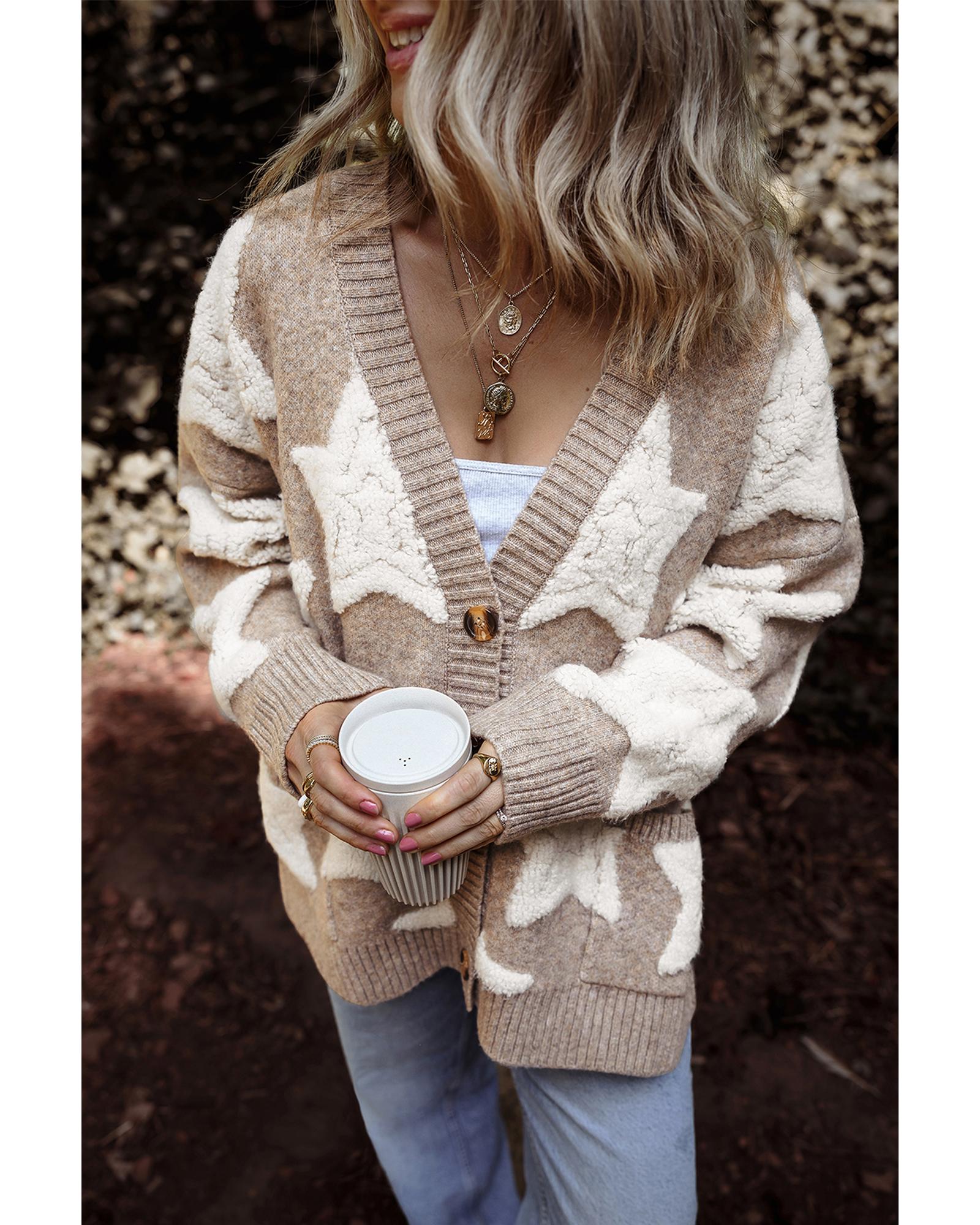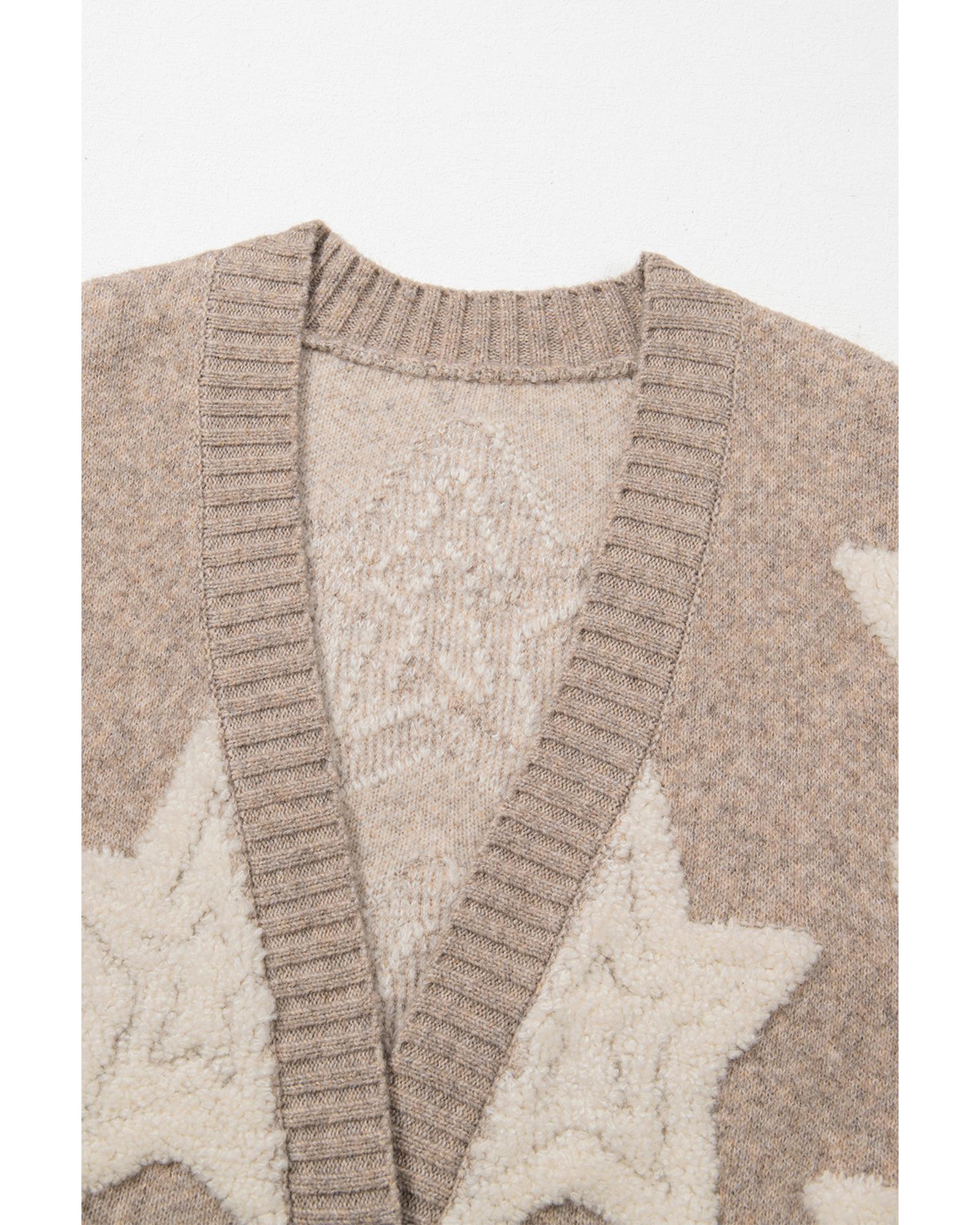 Khaki Sherpa Star Pattern Textured Sweater Cardigan with Pockets – XL