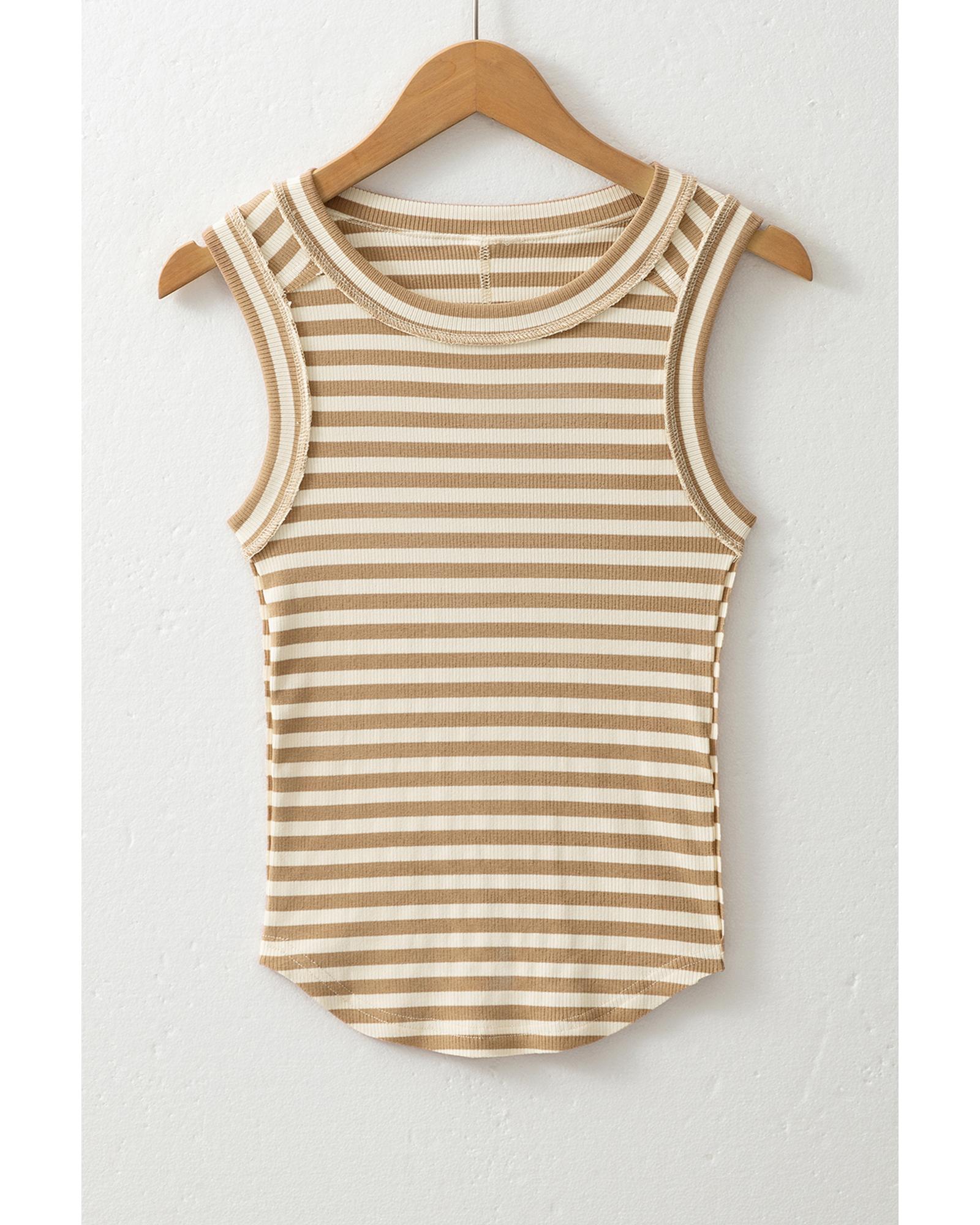 Khaki Stripe Exposed Seam Trim Round Neck Sleeveless Top – S