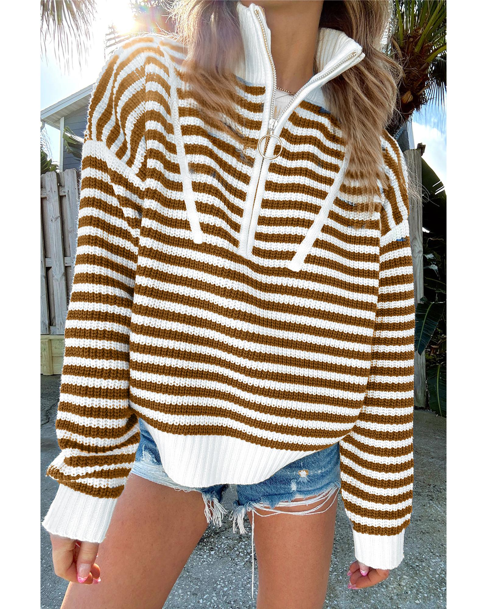 Khaki Stripe Zip up Collar Drop Shoulder Sweater – S