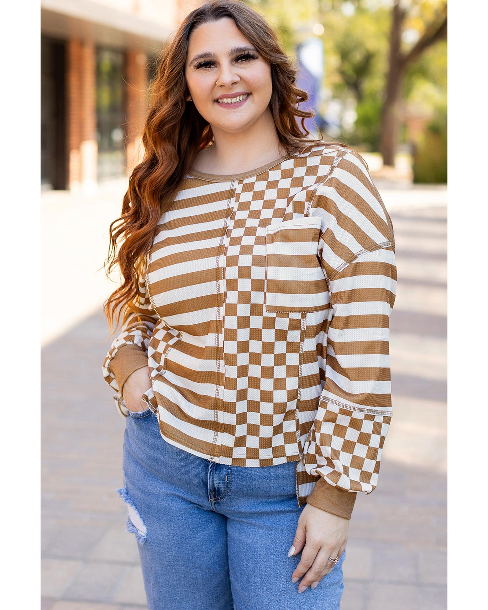 Khaki Striped Checkered Mixed Print Chest Pocket Casual Plus Size Top – 4X