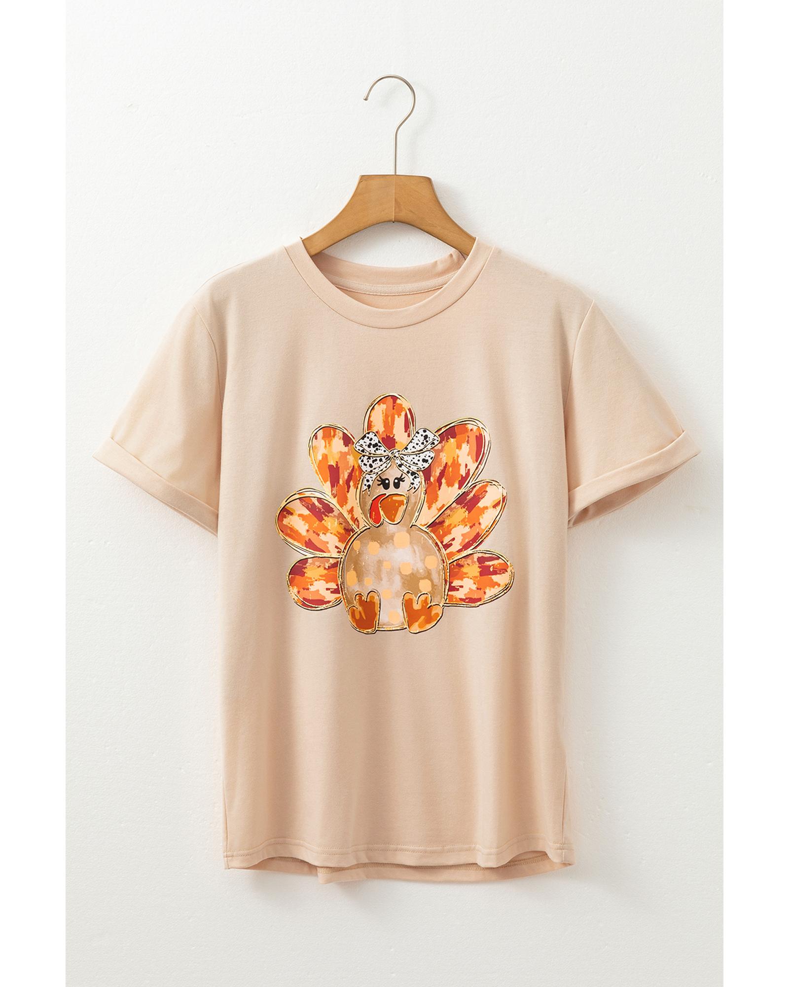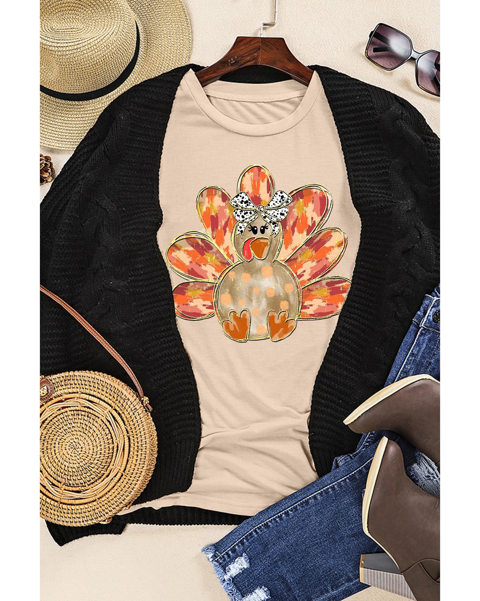 Khaki Thanksgiving Bowknot Turkey Graphic Crewneck Tee – S