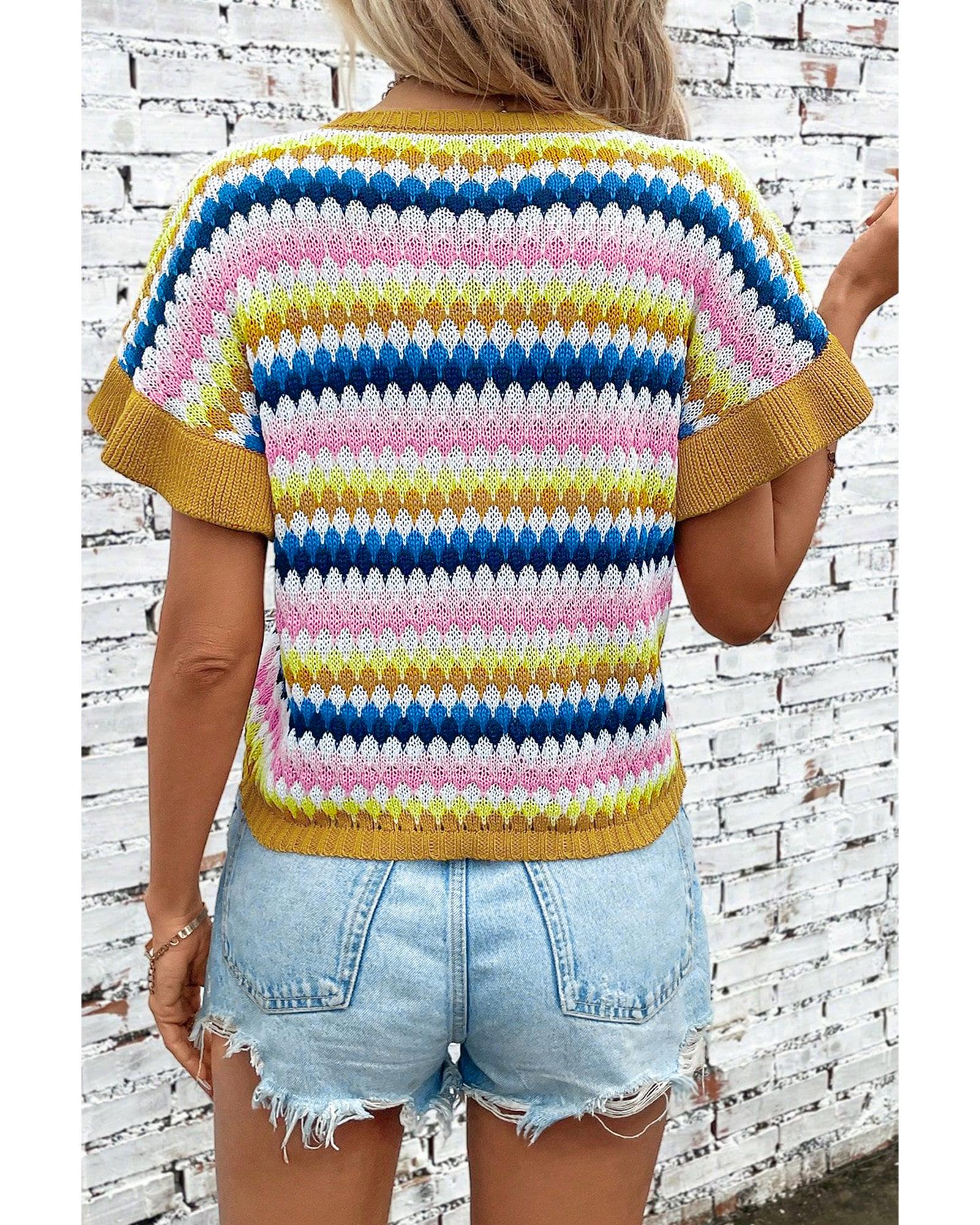 Khaki Trimmed Ruffle Sleeve Colorful Textured Sweater – XL