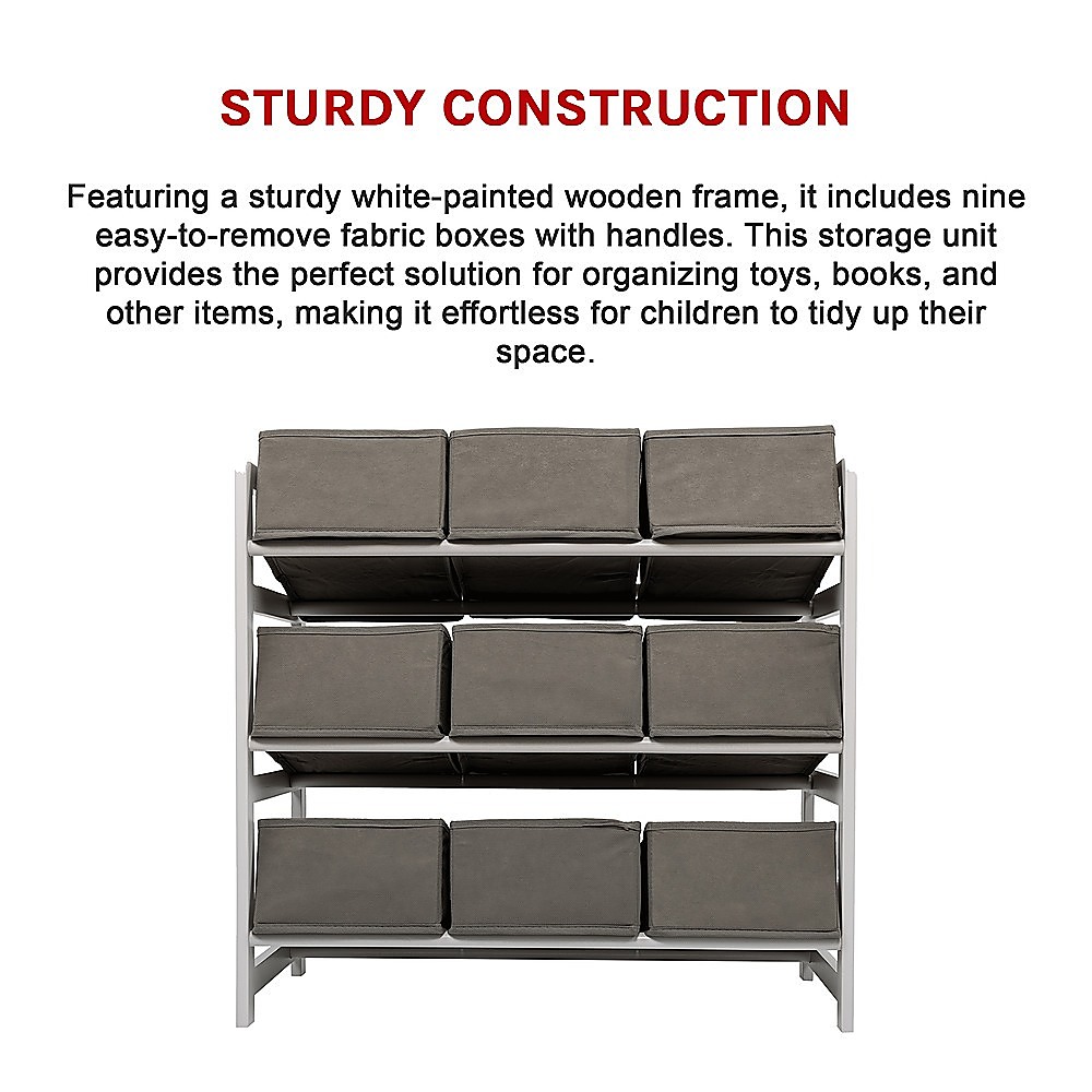 Featuring a sturdy white-painted wooden frame, it includes nine easy-to-remove fabric boxes with handles. This storage unit provides the perfect solution for organizing toys, books, and other items, making it effortless for children to tidy up their space. With its easy assembly and durable, high-quality design, it offers both practicality and style.