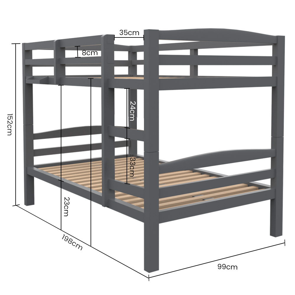 KINGSTON SLUMBER Single Bunk Bed Frame, Solid Pine 2-in-1 Modular Design, Converts to 2 Single Beds, For Kids, Grey