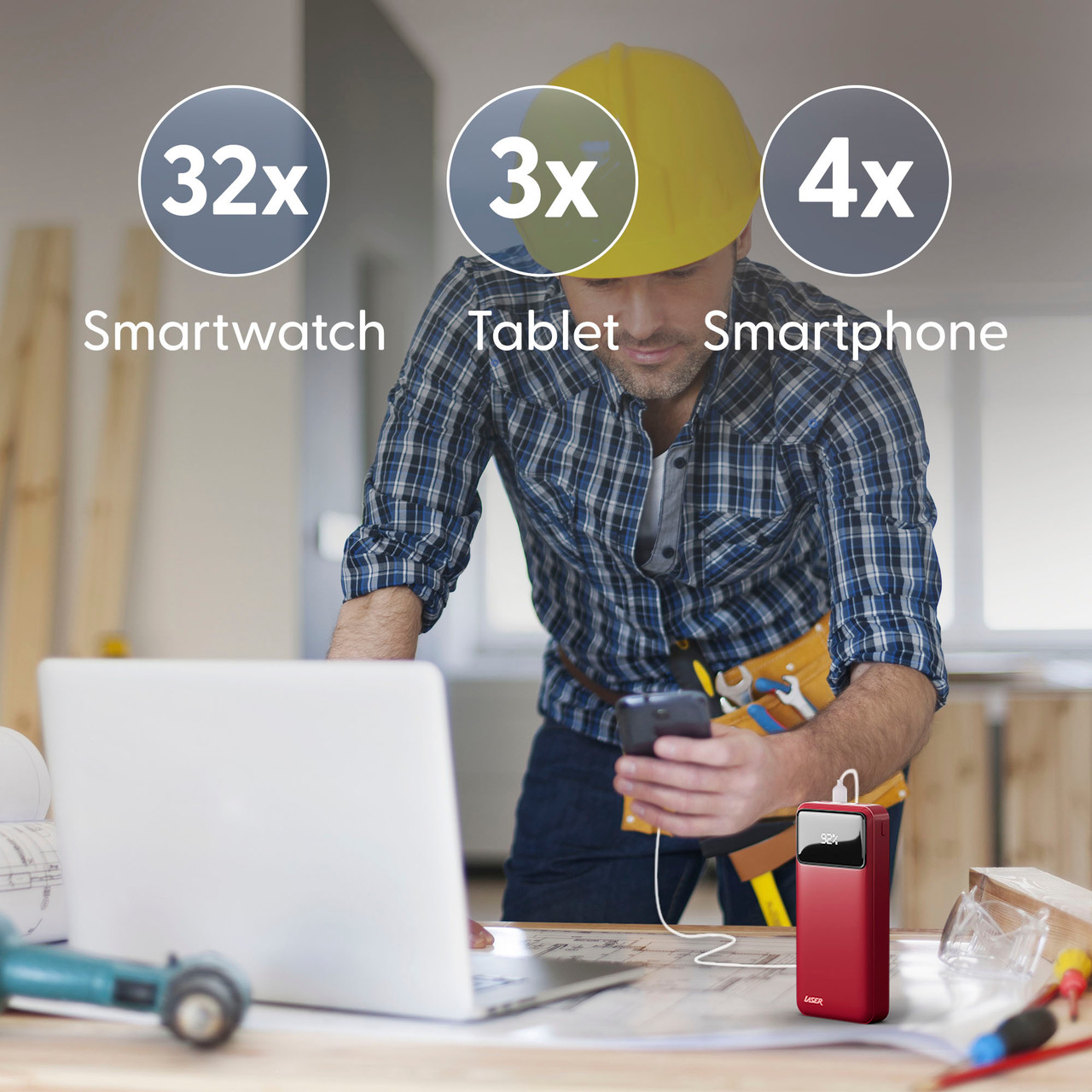 20,000mAh battery can simultaneously charge your smartphone 4 times*, your smartwatch up to 32 times, and your tablet up to 3 times. Ideal for those long days away or extended time away from home/office.