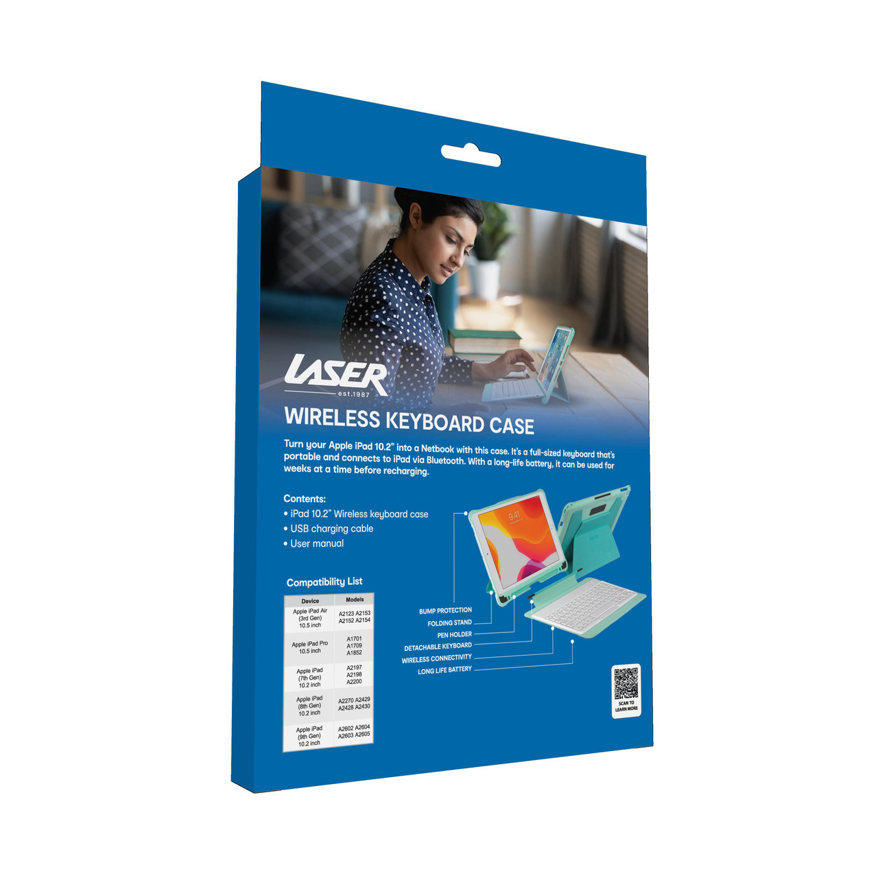 The case folds flat when not in use, making it easy to slip into a backpack or handbag. Whether you’re working from a café, attending classes, or travelling, the Laser Wireless Keyboard Case ensures your iPad stays protected while boosting your productivity wherever you go.
