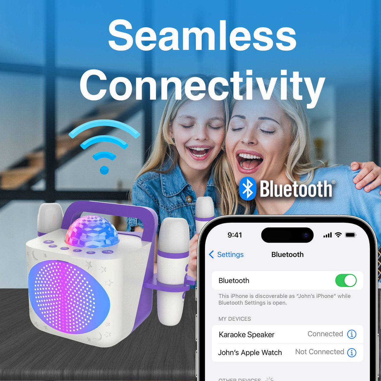 Seamless Bluetooth Connectivity Pair and play with any smartphone, tablet, or compatible device for instant access to endless playlists and karaoke tracks.