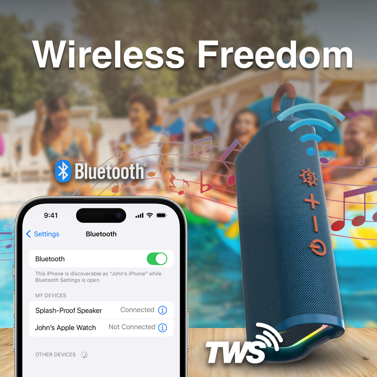 Bluetooth True Wireless Stereo (TWS) Pairing:With Bluetooth connectivity and TWS pairing, you can stream wirelessly from your phone, tablet, or laptop with quick setup. Want a wider stereo experience? Pair a second Laser Splash-Proof Speaker (sold separately) for immersive audio that fills your space.