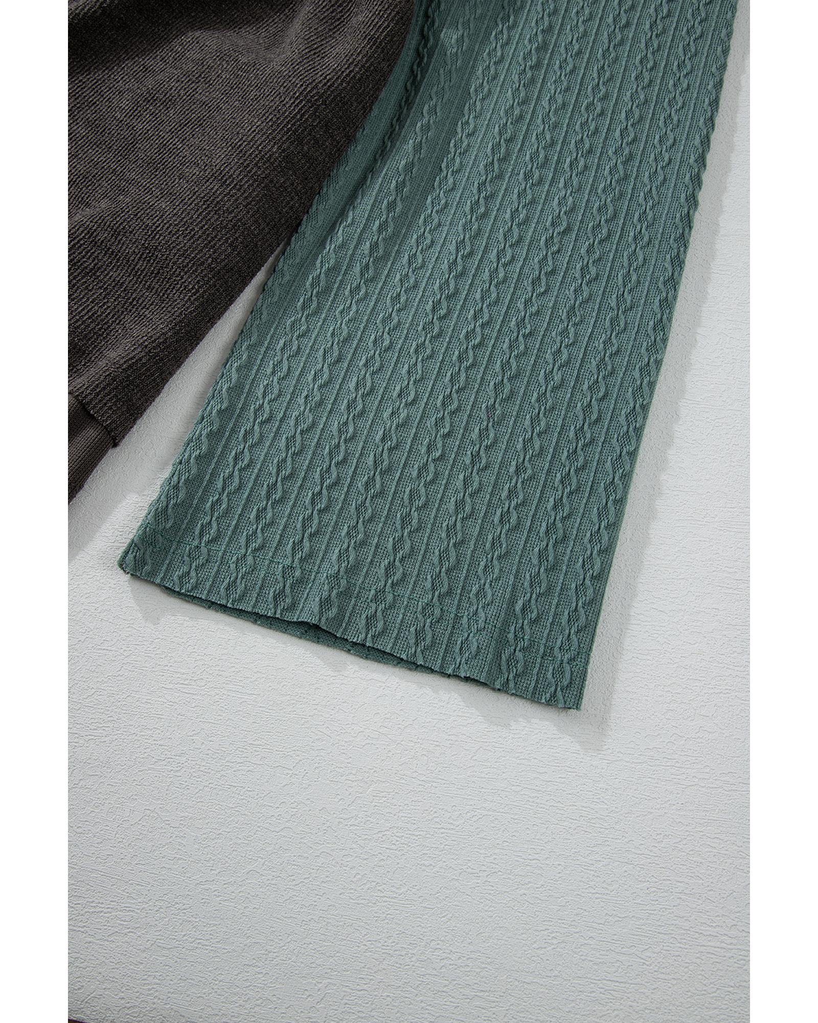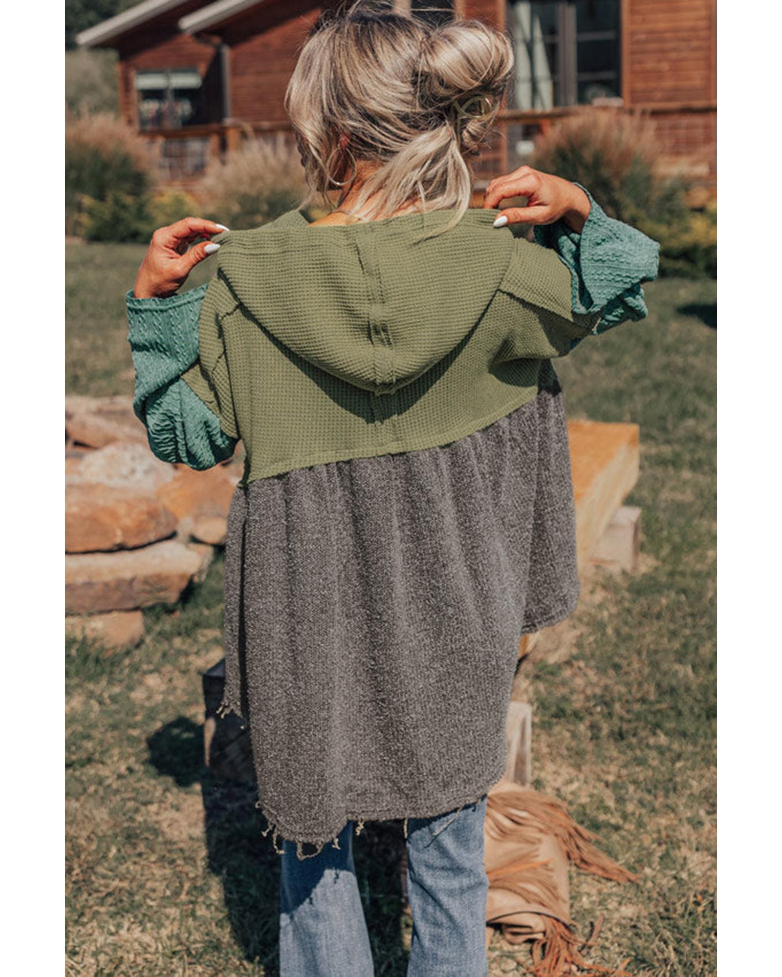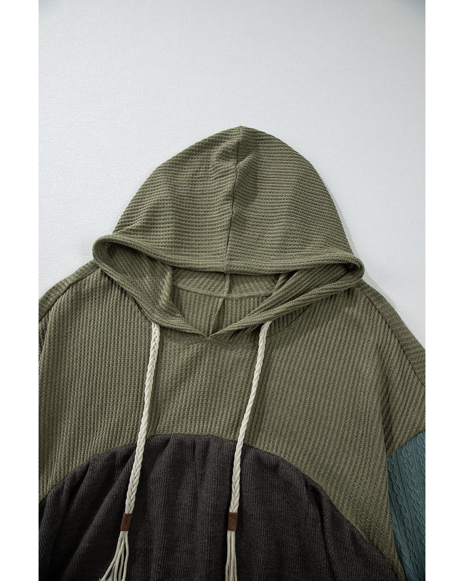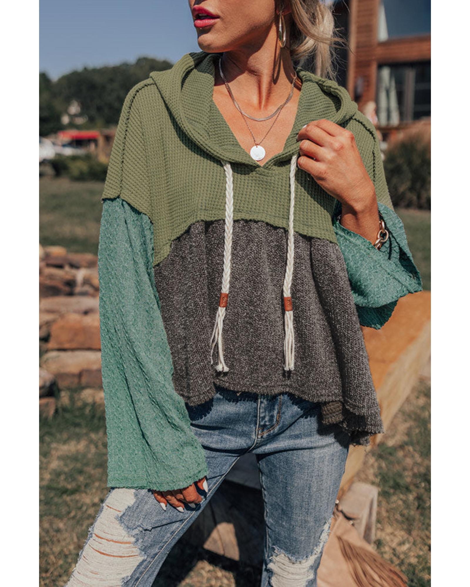 Laurel Green Mixed Textured Colorblock Patchwork Wide Sleeve Frayed High Low Hooded Top – L