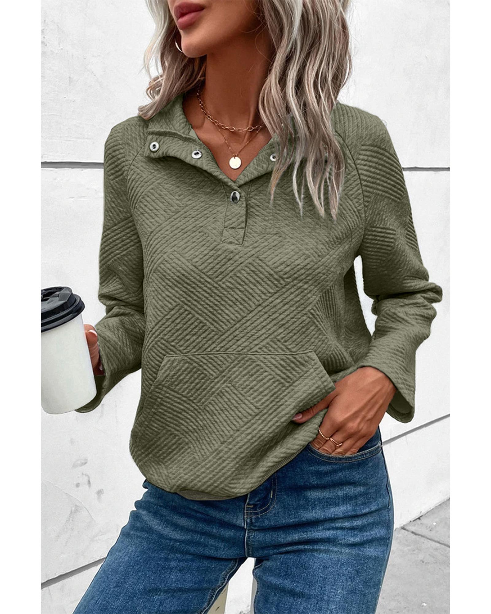 Laurel Green Textured Knit Buttoned Kangaroo Pocket Sweatshirt – S