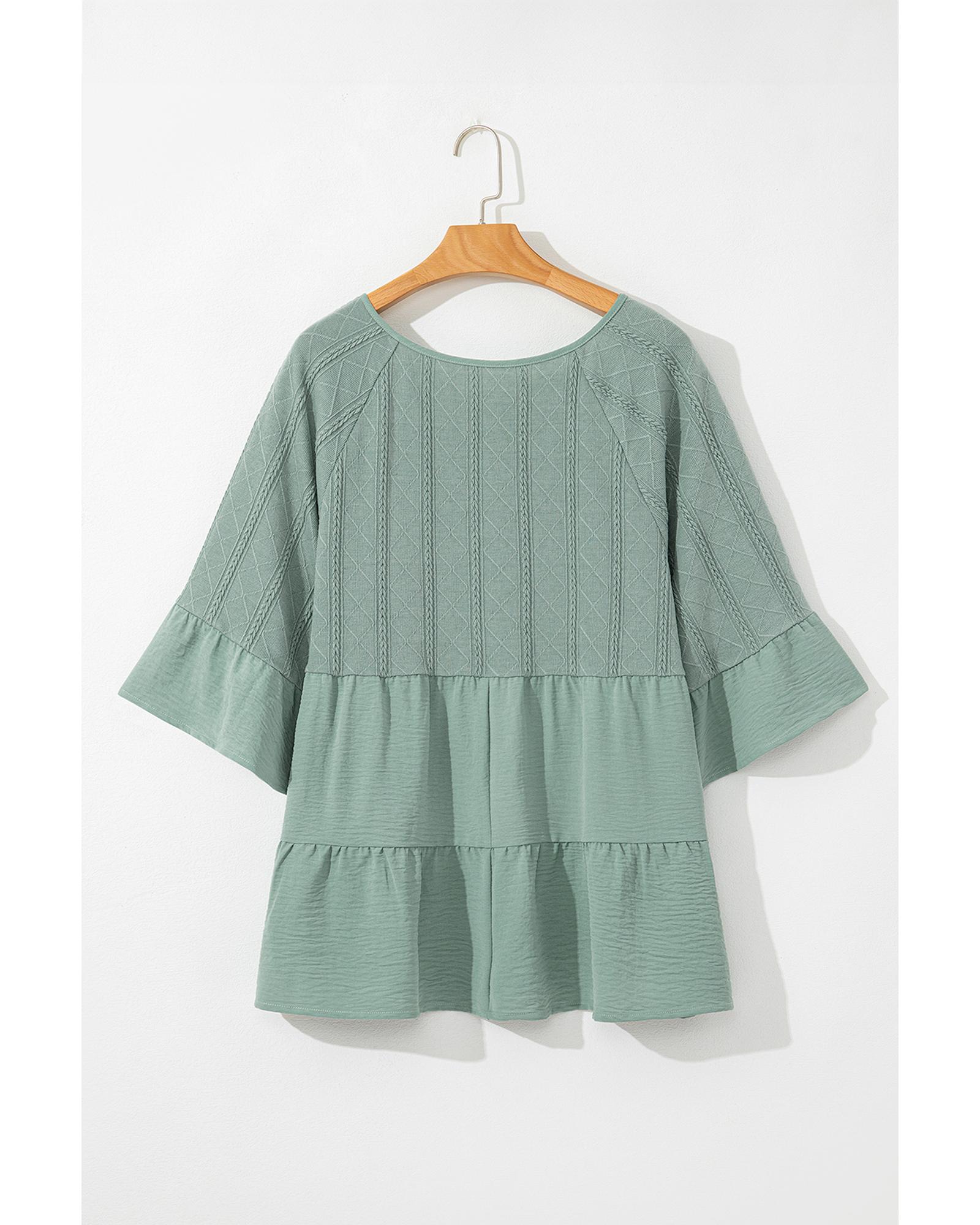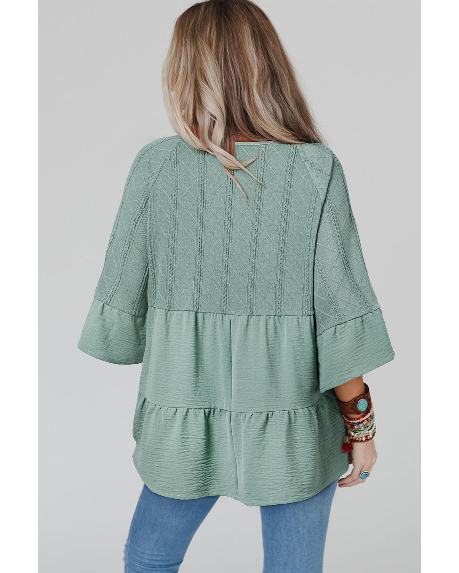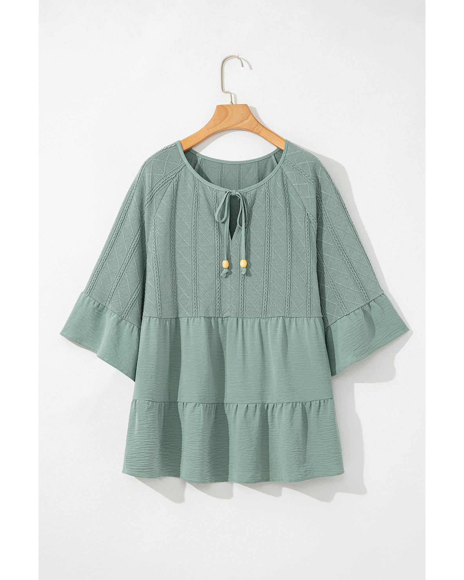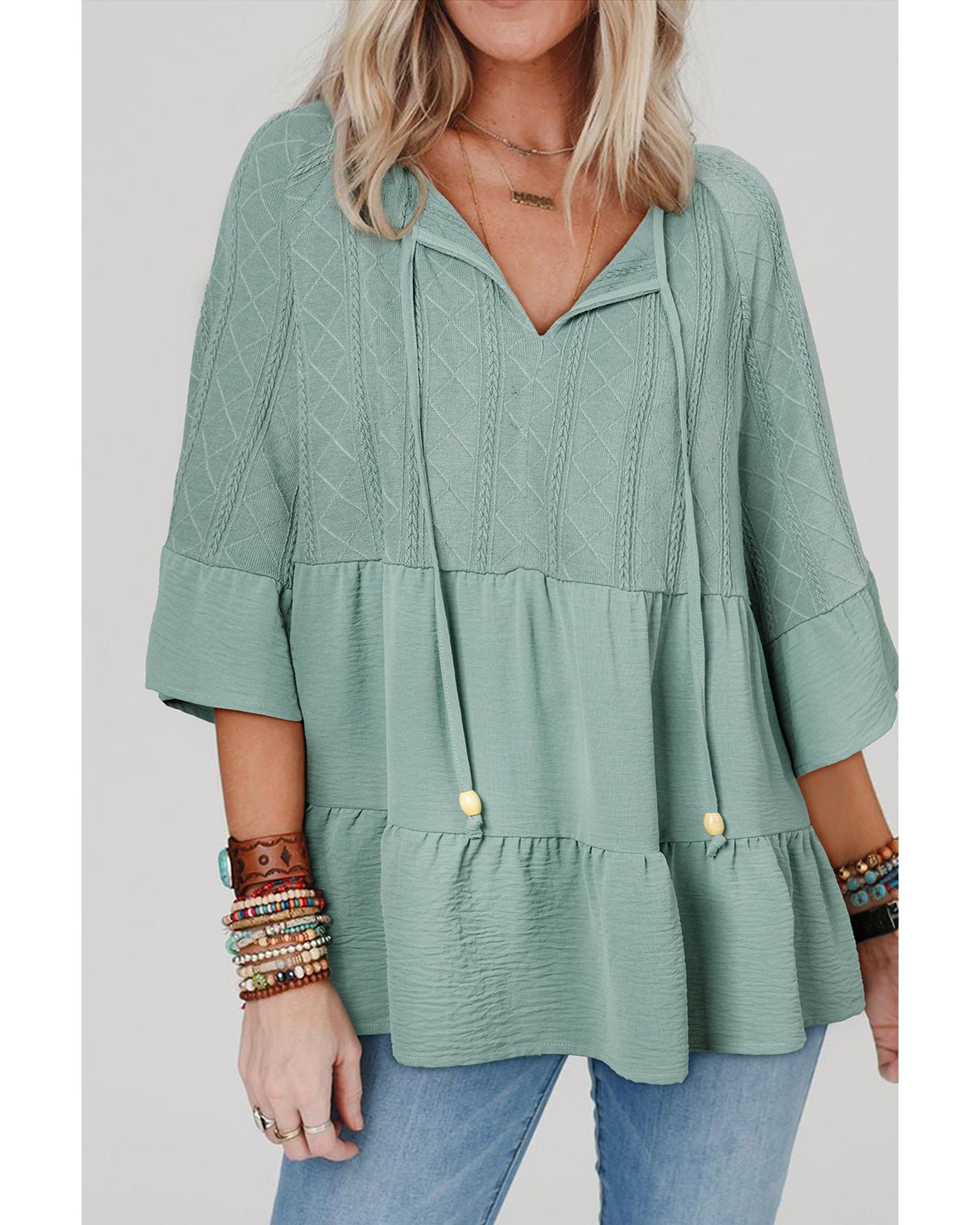 Laurel Green Tie Split Neck Textured Ruffle Patchwork Blouse – L