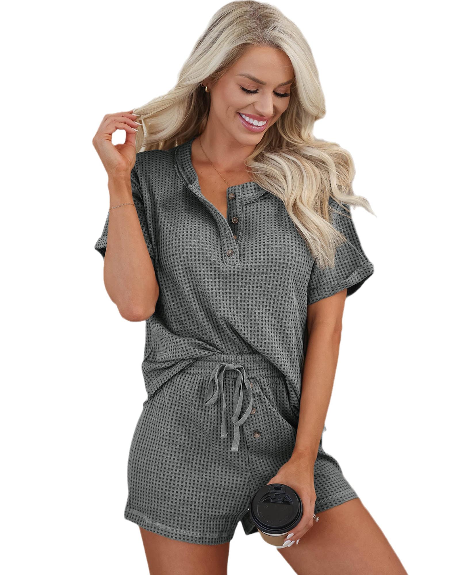 Laurel Green Waffle Knit Buttoned Top and Drawstring Shorts Set – L