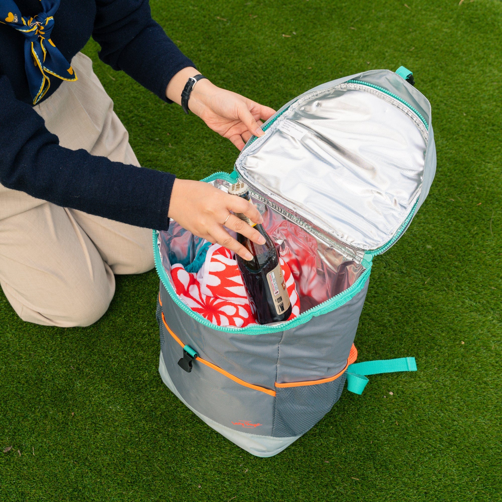 The Lazy Dayz Insulated Jumbo Cooler Backpack is the perfect way to carry snacks and drinks on your next adventure. Sleek grey panels with bright trim are modern and fun. Made from 420D outside, and food grade aluminium inside that complies with food safety regulations, this insulated backpack keeps contents cold for at least 6 hours. The side mesh pocket can hold smaller items such as keys or sunglasses.