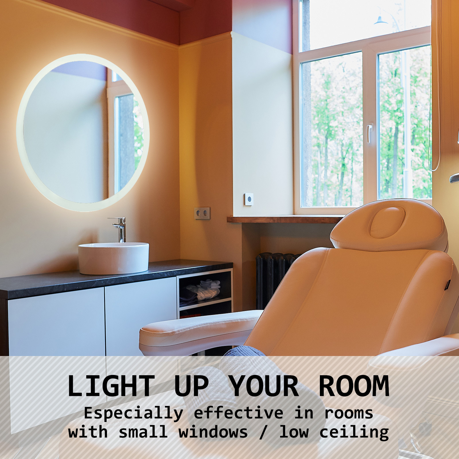 The LED round mirror is modern and clean in design comes with an energy-efficient LED light strip place around the mirror. This illuminated mirror besides saving more energy and cost than light bulbs but also has a long-lasting lifespan of up to 50,000 hours. Not to mention it combines dual-channel LEDs greatly affect aesthetics and ambience. You can adjust its colour temperature range from a mix of warm yellow and cool white LEDs and cross-dim between the two with a simple long touch.