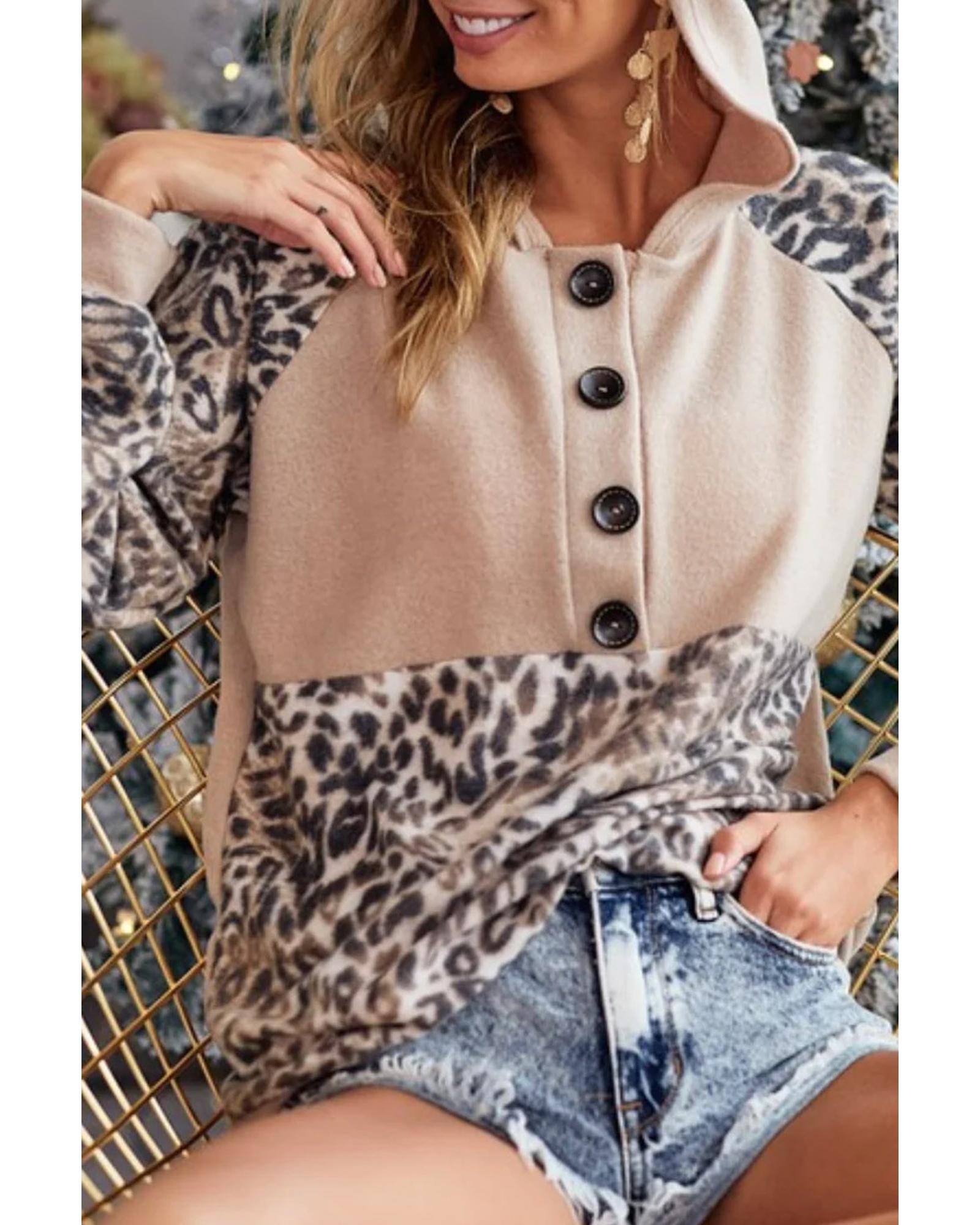 Leopard Print Buttoned Neckline Raglan Sleeve Hoodie – M
