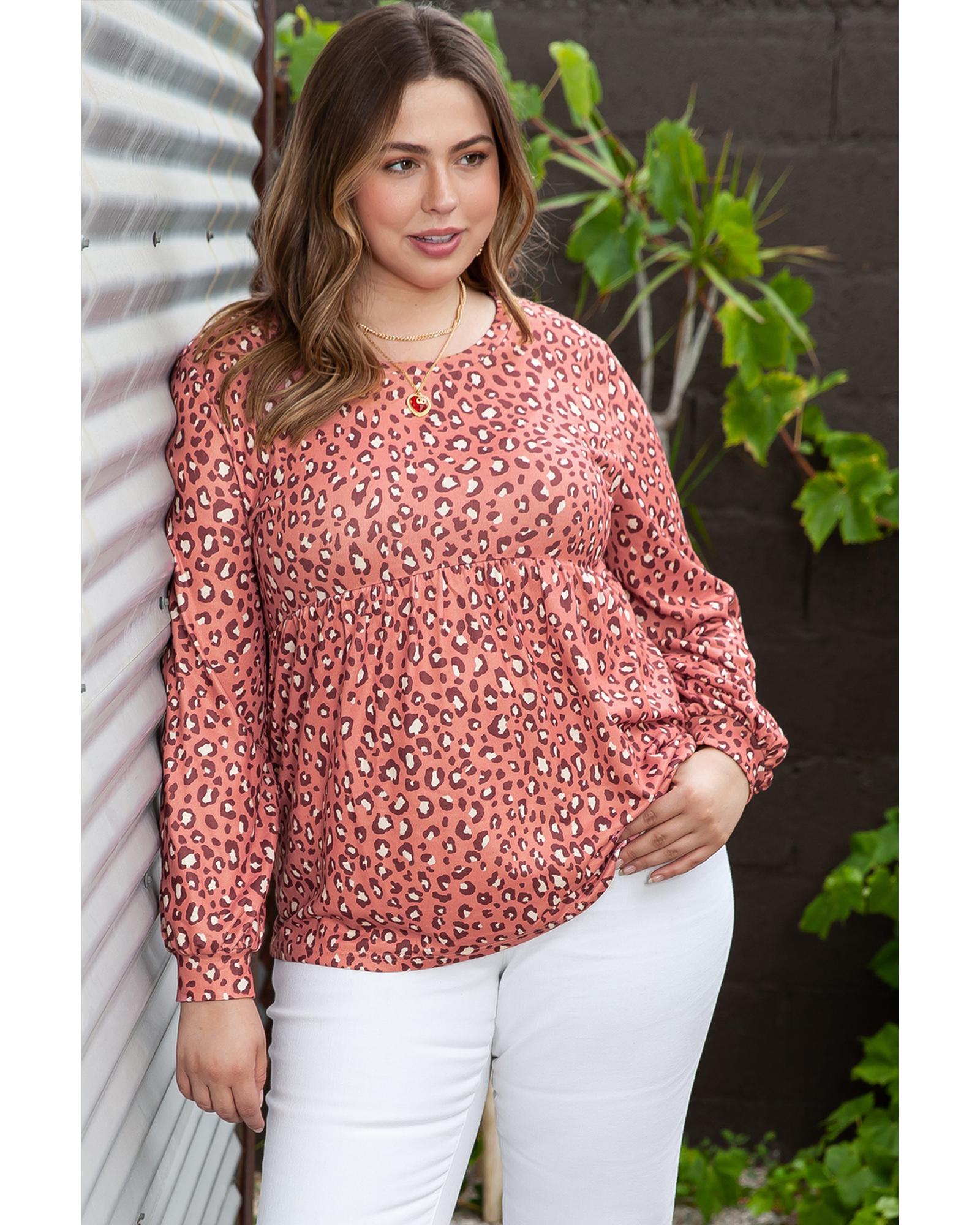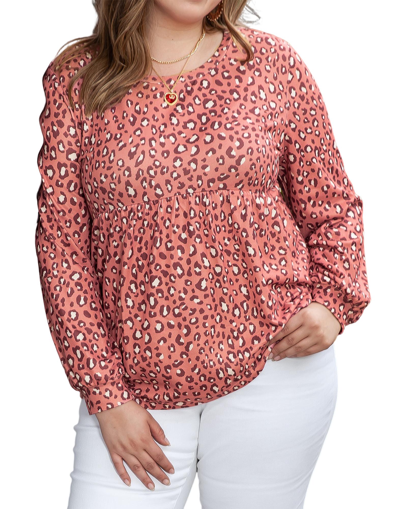Leopard Print Long Sleeve Ruffled Babydoll Plus Size Blouse – 1X