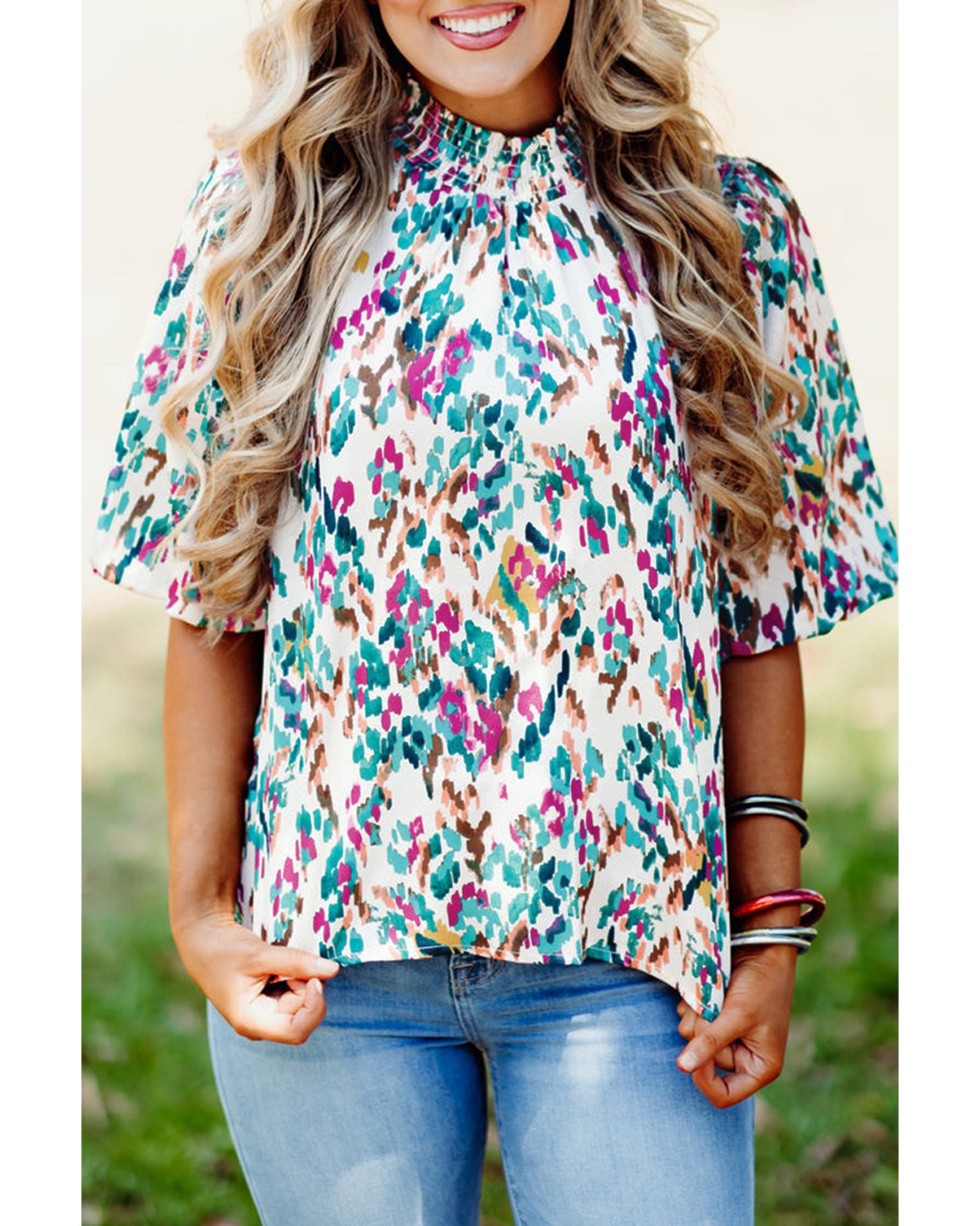 - Light Blue Abstract Print Puff Sleeve Mock Neck Blouse