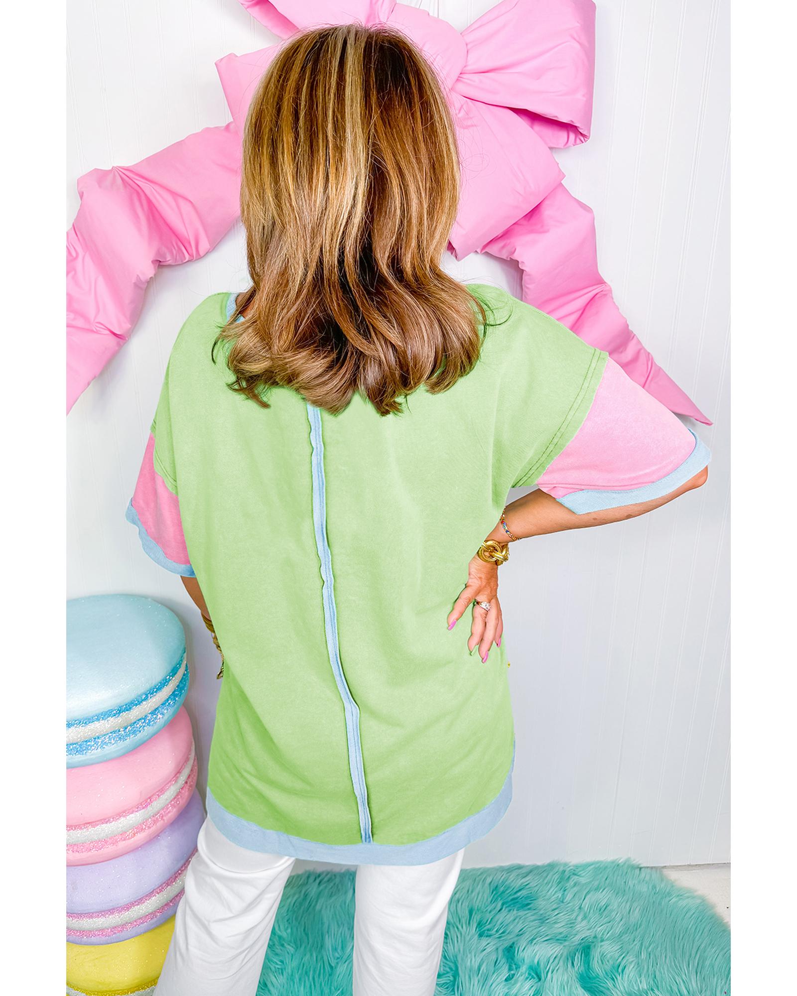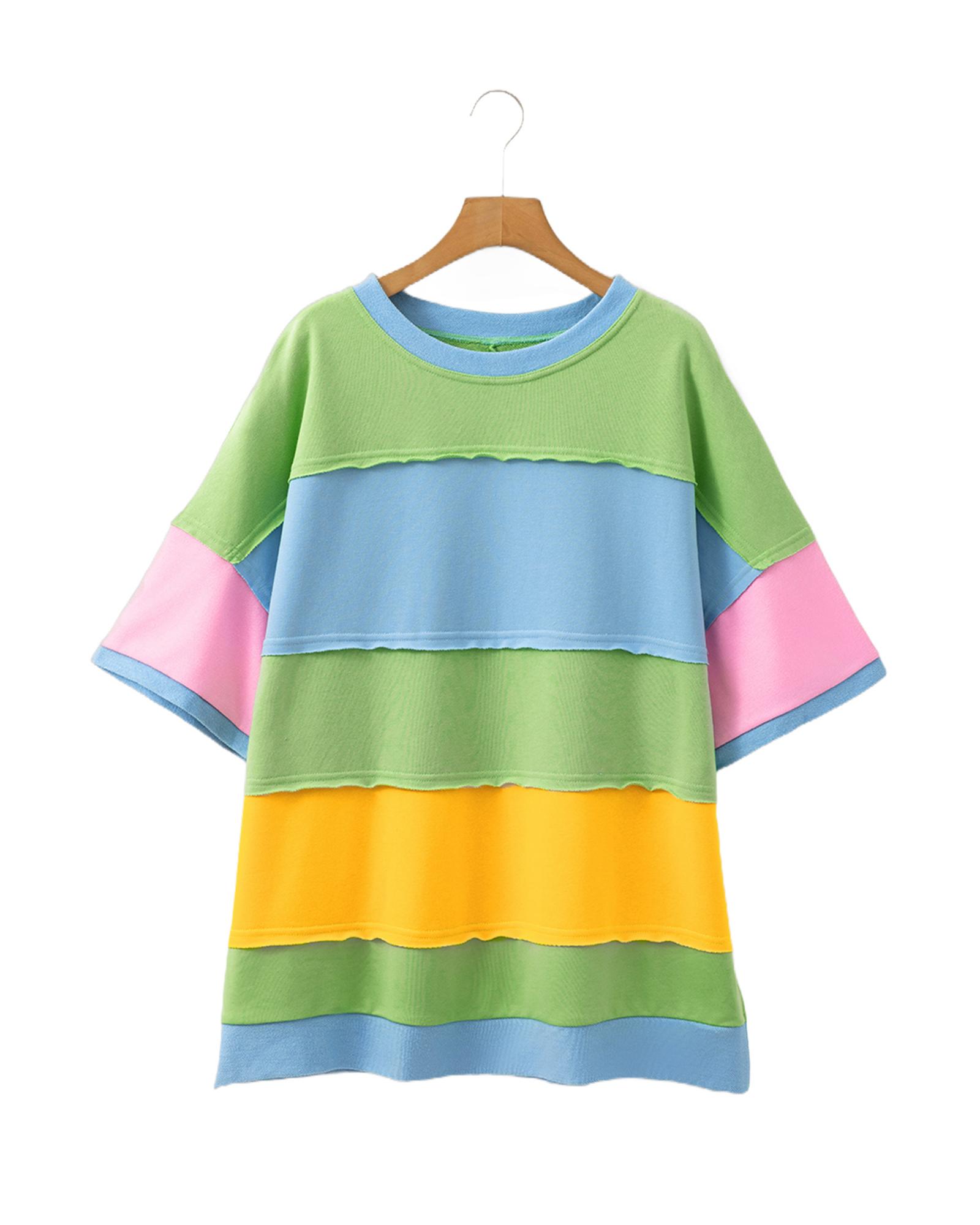 Light Blue Color Block Exposed Seam Patchwork Plus Size T Shirt – 4X