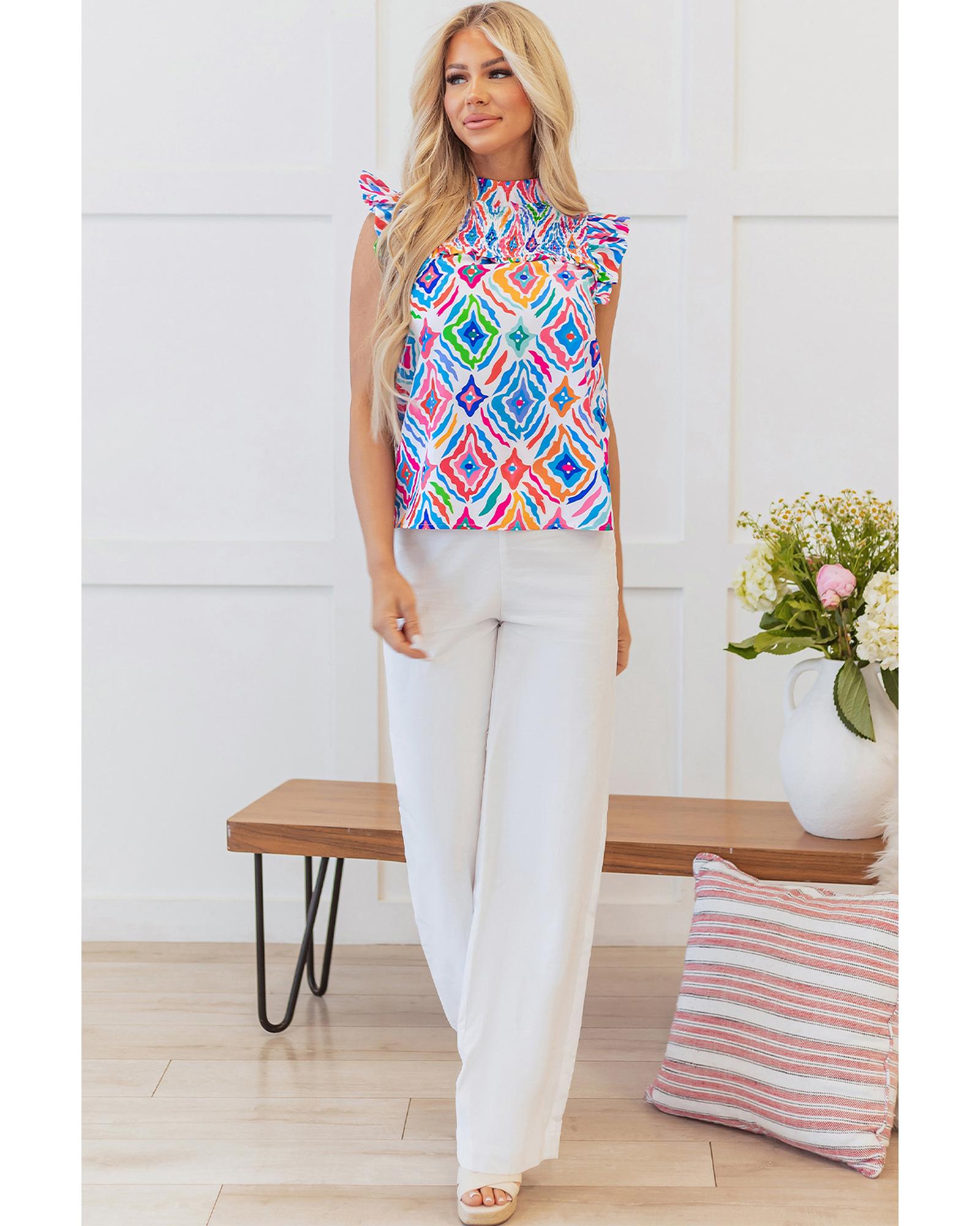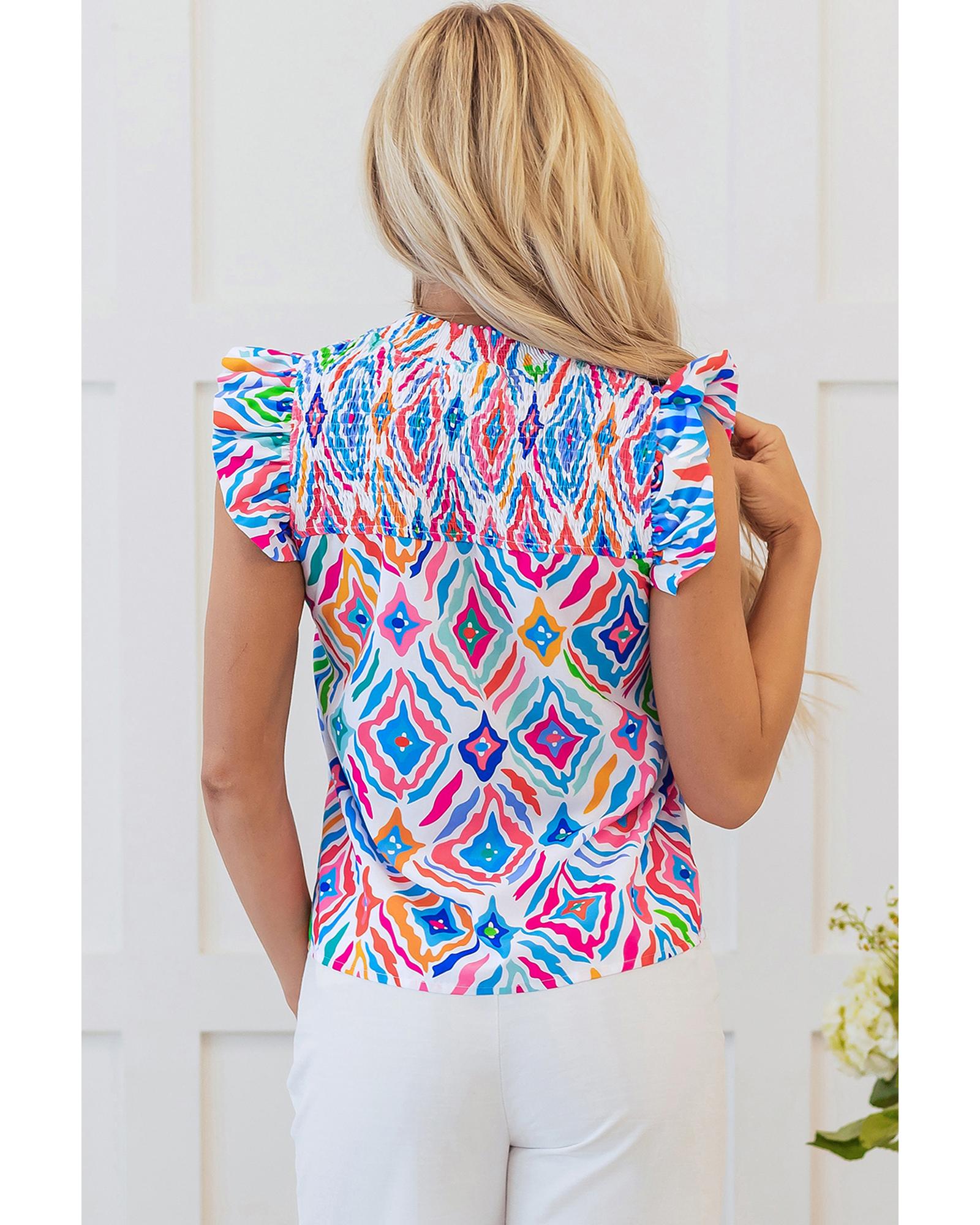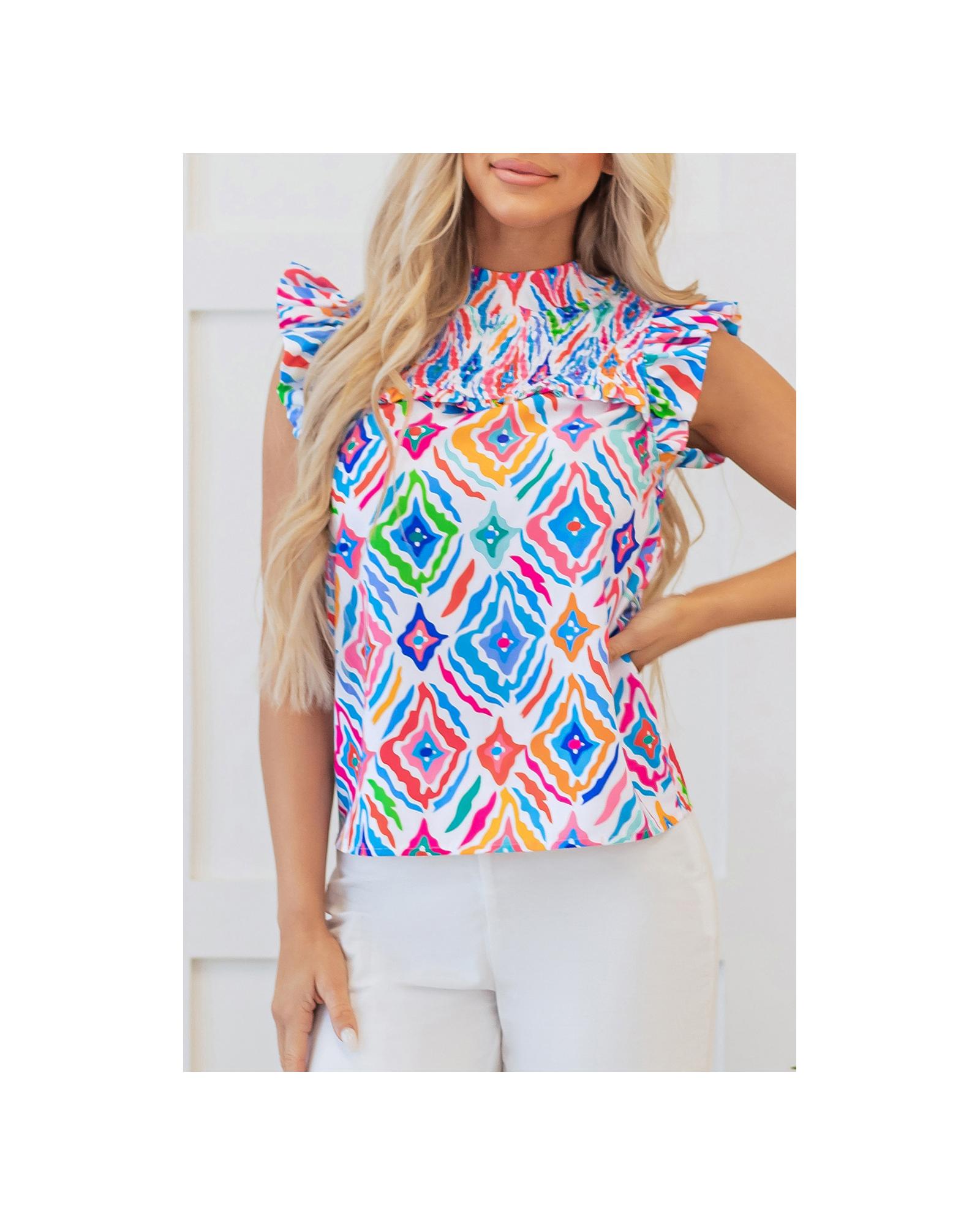 Light Blue Geometric Printed Flutter Sleeve Mock Neck Shirred Blouse – M