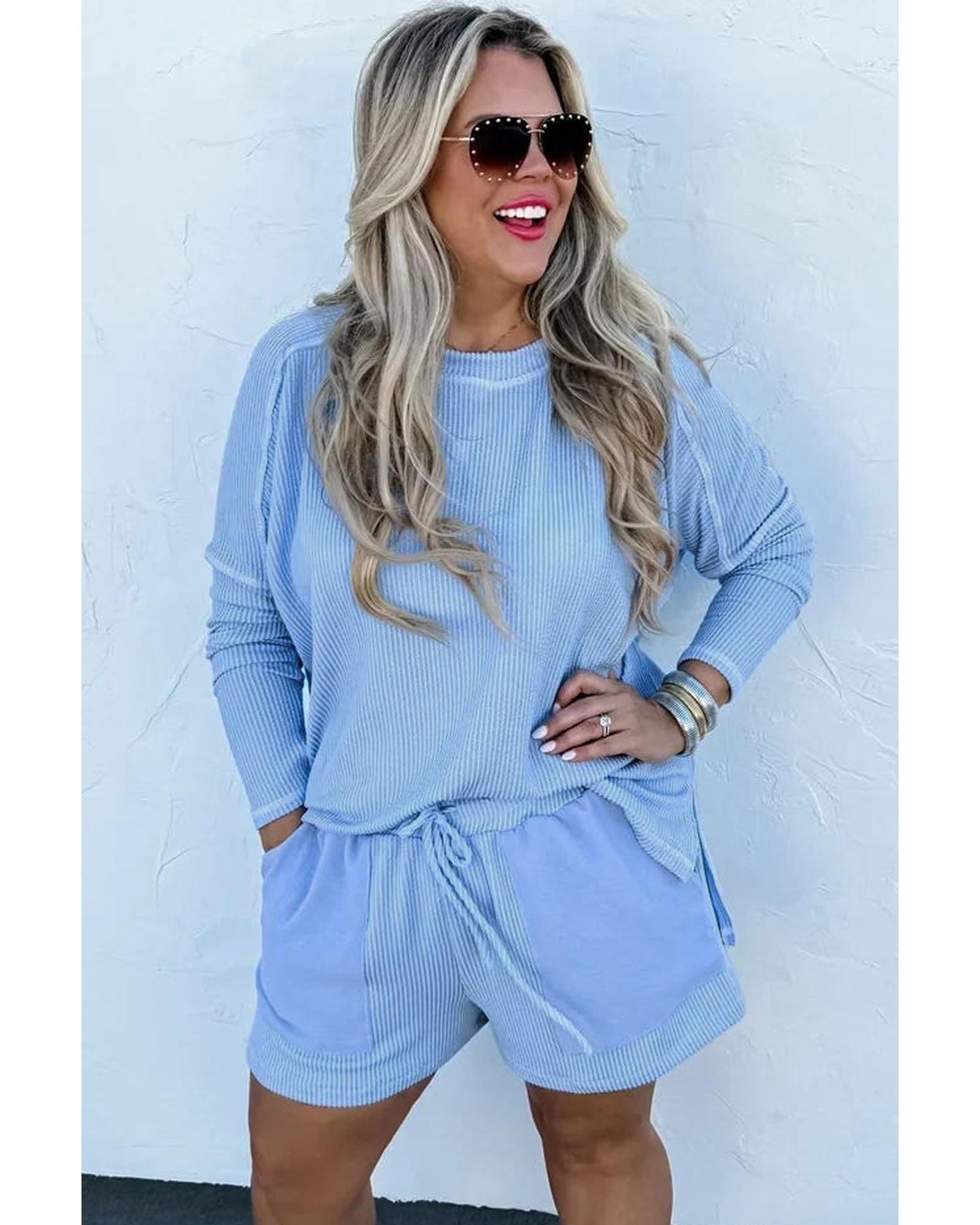 Light Blue Plus Size Ribbed Long Sleeve Top and Drawstring Shorts Set – 3X