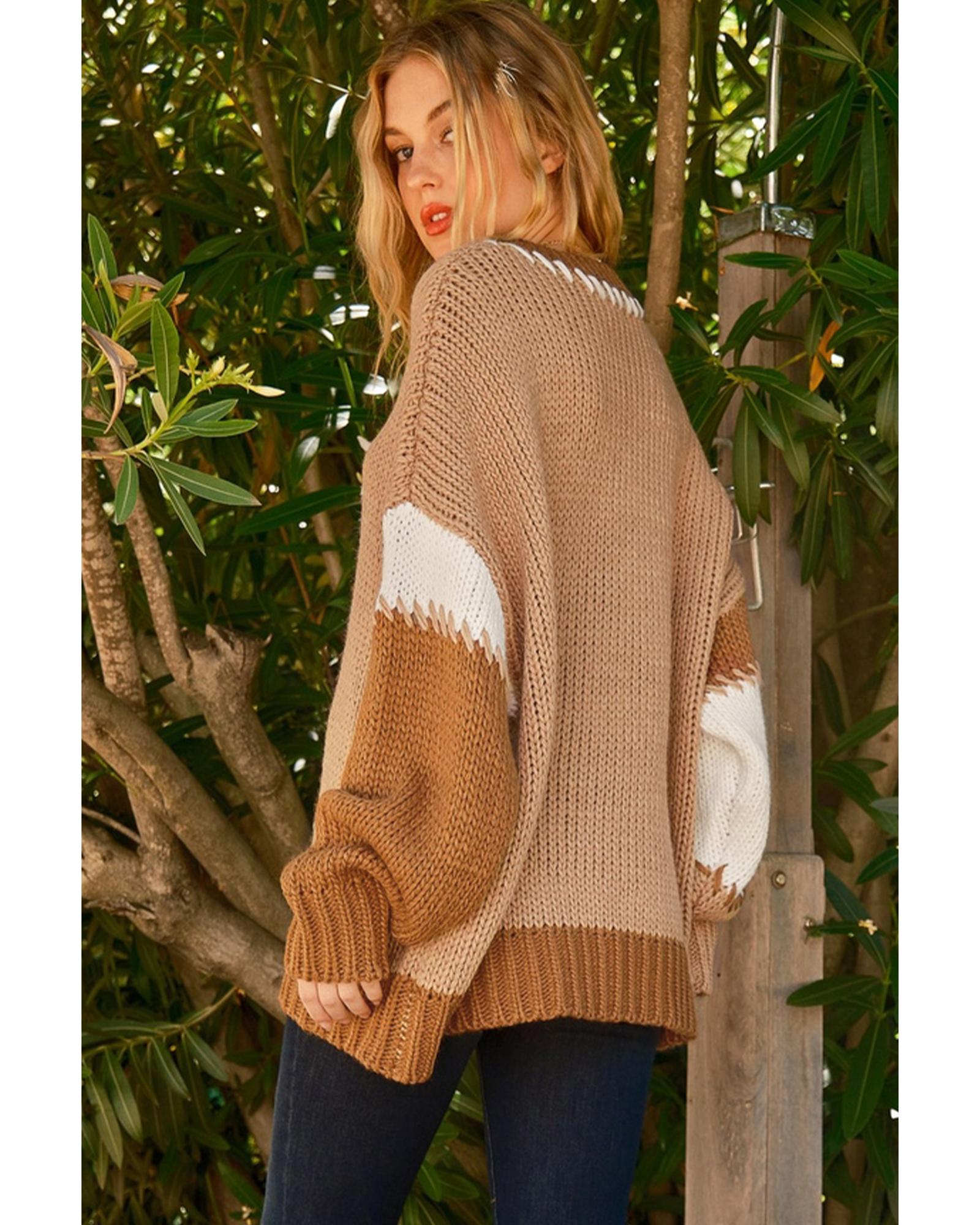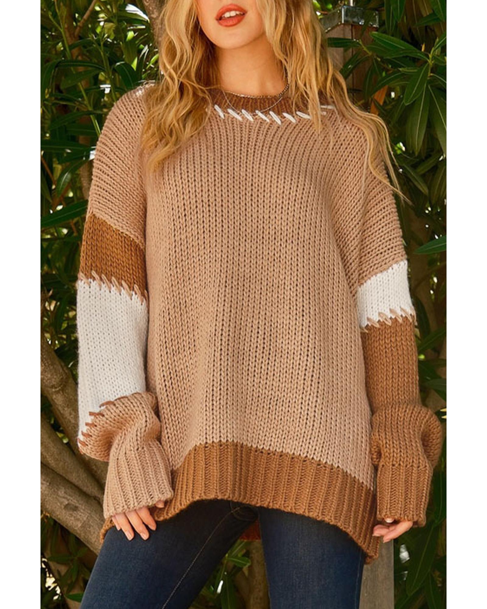 Light French Beige Color Block Contrast Stitch Oversized Sweater – S