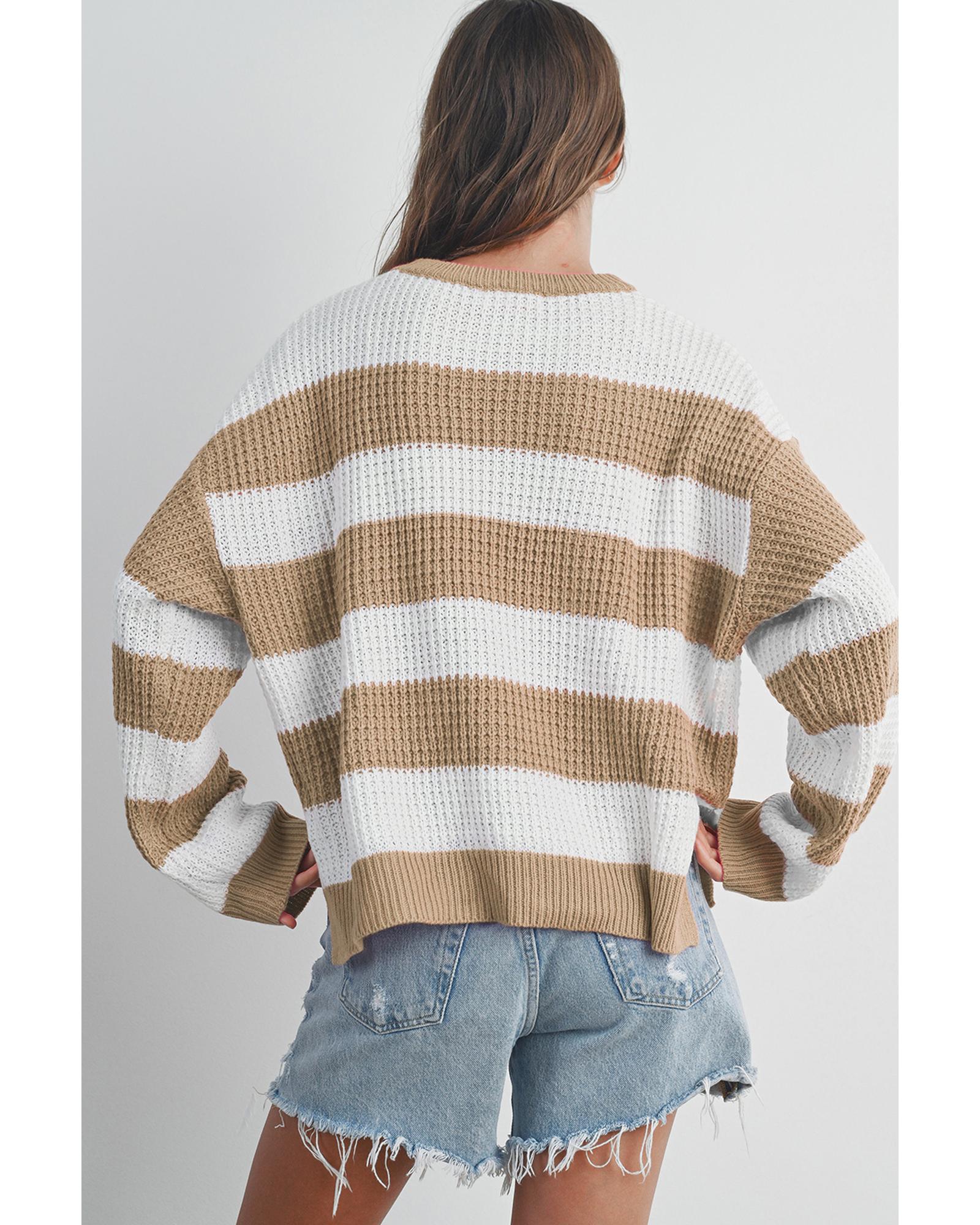 Light French Beige Colorblock Striped Drop Shoulder Side Slit Sweater – L